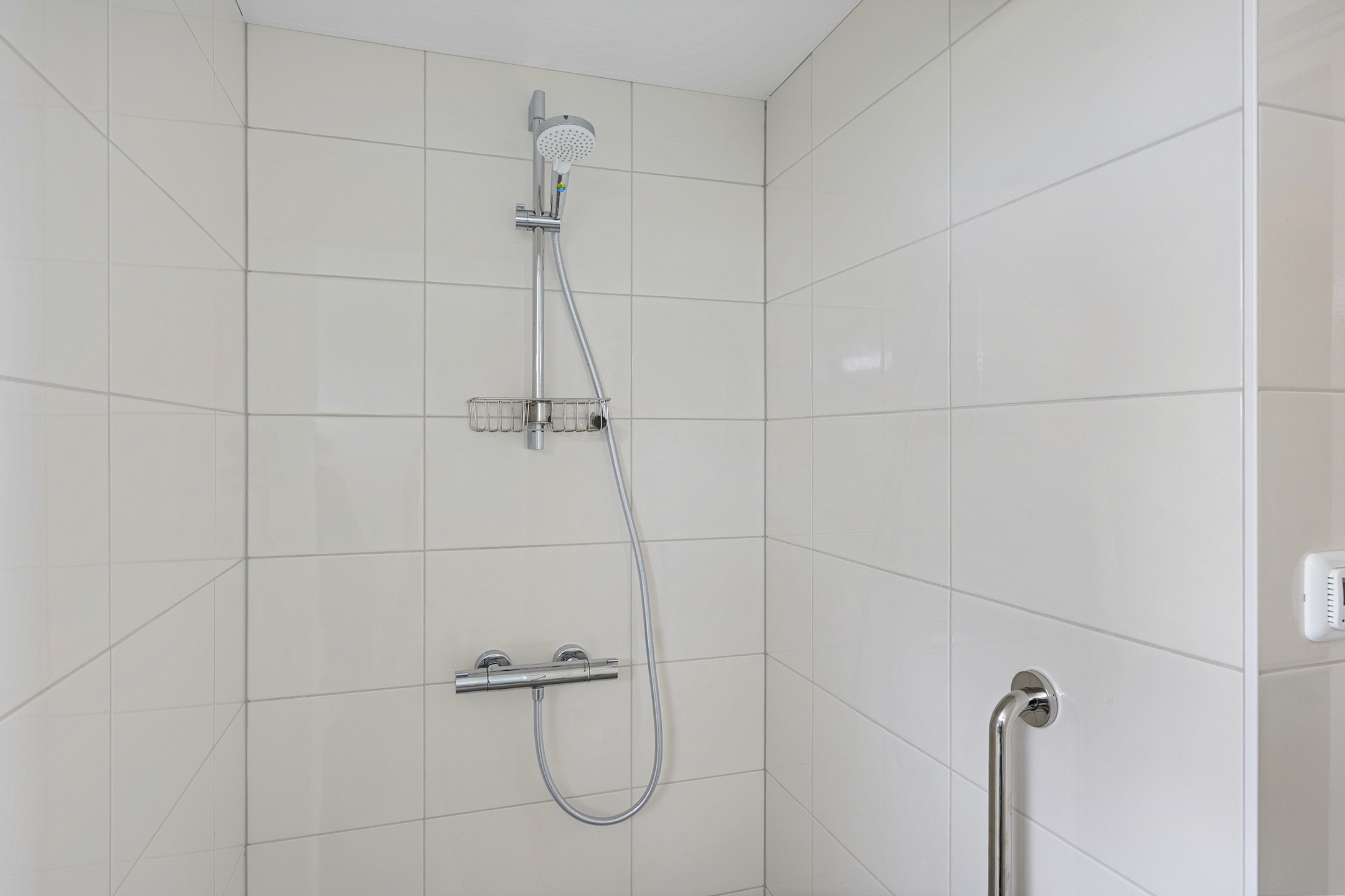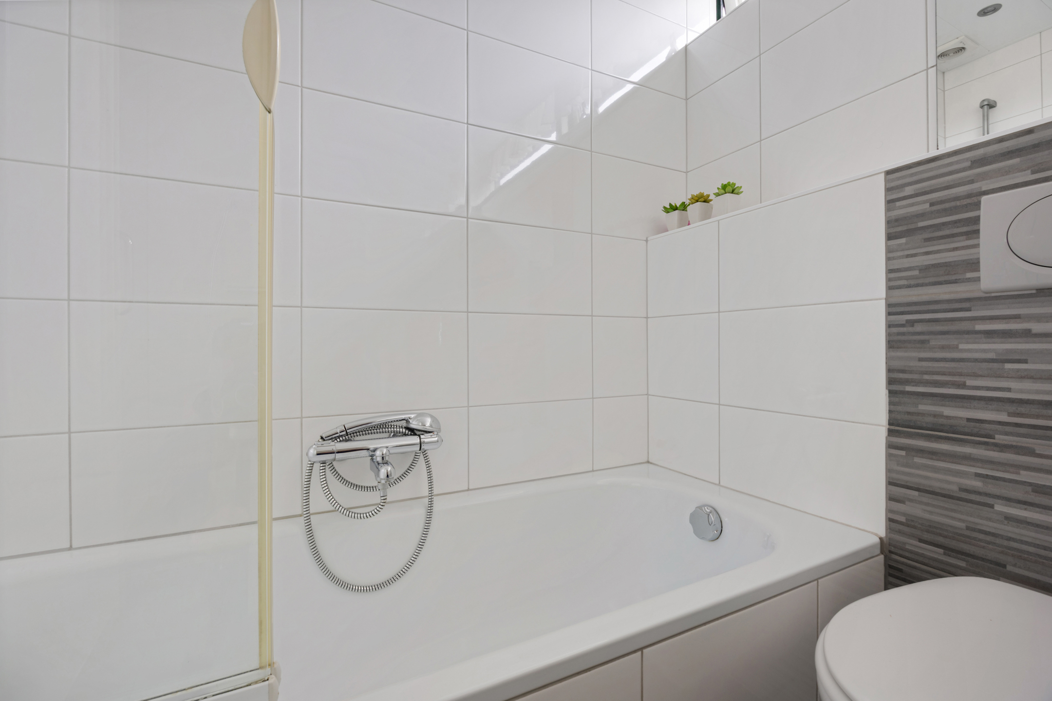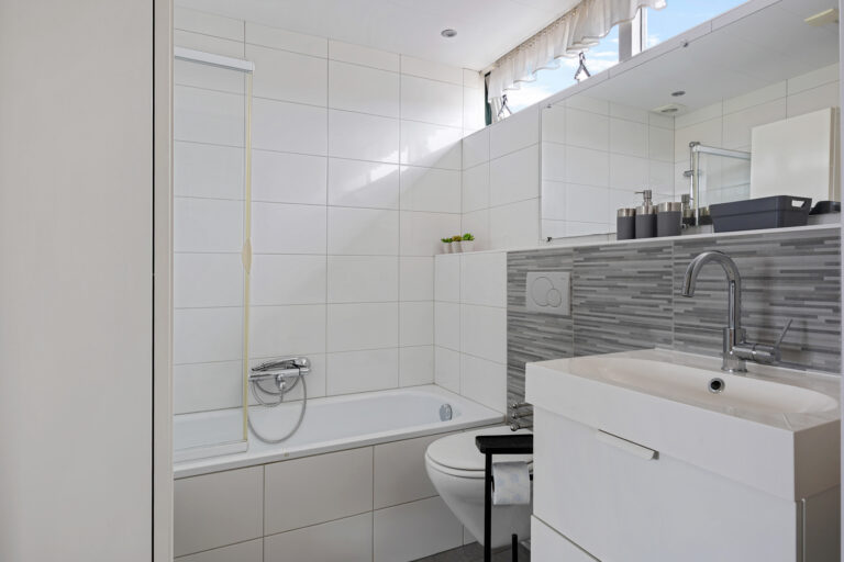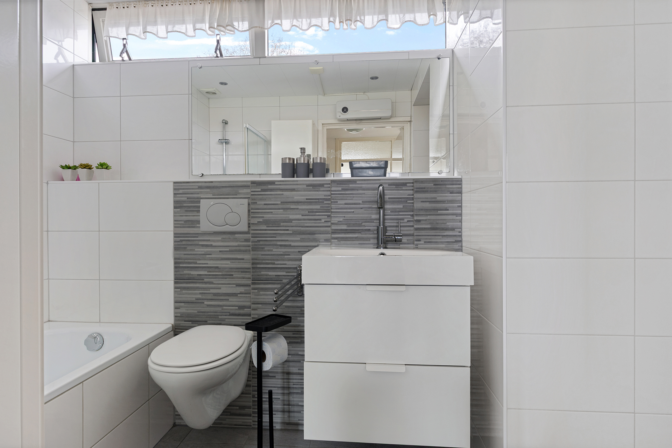 De badkamer is in 2019 vernieuwd en heeft een frisse, moderne uitstraling. De ruimte is verzorgd afgewerkt en voorzien van een ligbad met douchefunctie, een wastafelmeubel en een wandcloset. Dankzij het aanwezige raam is er prettig daglicht en natuurlijke ventilatie. Daarnaast is de badkamer uitgerust met elektrische vloerverwarming, wat zorgt voor extra comfort.
