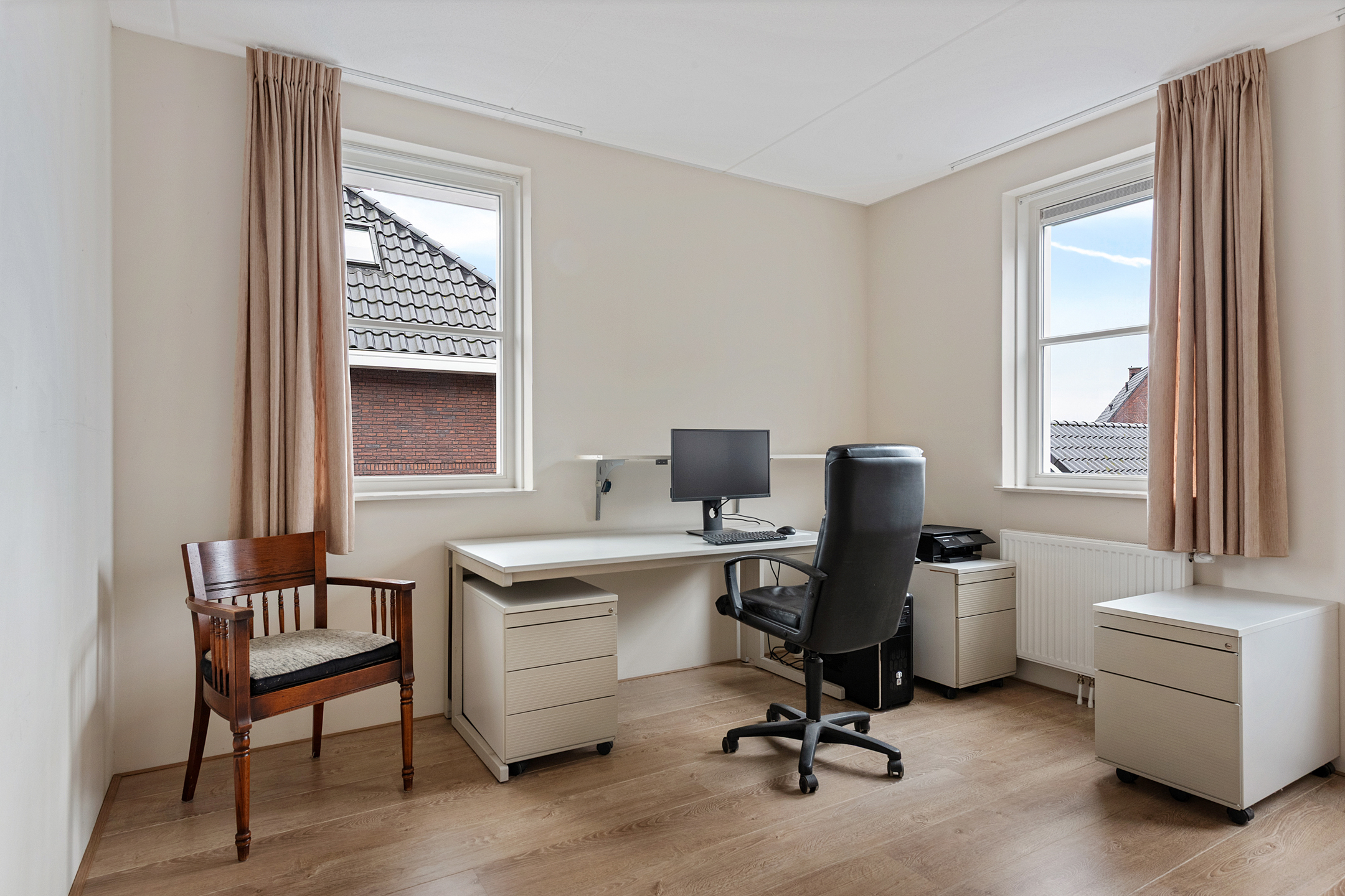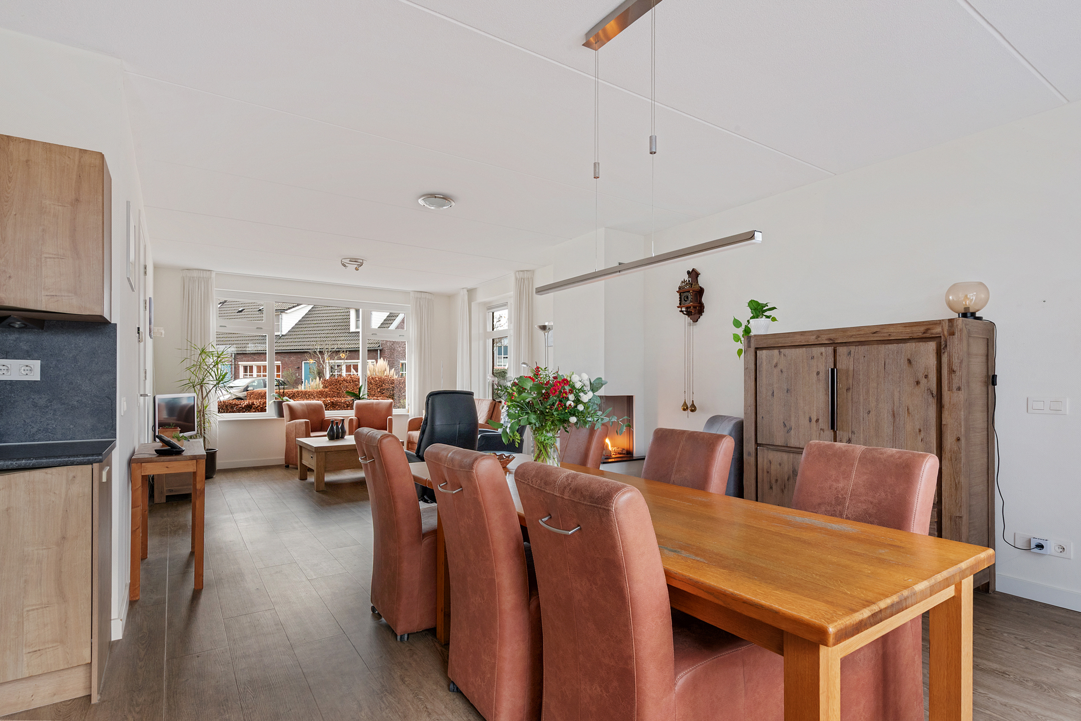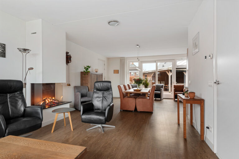 De woonkamer is voorzien van een stijlvolle gashaard met witte schouw, wat zorgt voor extra comfort en gezelligheid. Vanuit de woonkamer is er verbinding met de keuken, de tuin en de twee separatie ruimtes, welke op dit moment dienen als bijkeuken en hobbyruimte. De keuken is uitgevoerd in een warme houttint en compleet uitgerust met moderne inbouwapparatuur, waaronder een grote Siemens inductiekookplaat, vaatwasser, koelkast, afzuigkap en een oven/magnetroncombinatie. Een praktische en sfeervolle ruimte voor kookliefhebbers. De woning is bovendien uitgerust met een waterontharder, wat zorgt voor zacht water in huis. Dit betekent minder kalkaanslag op kranen en sanitair, een langere levensduur van huishoudelijke apparaten én meer comfort bij douchen en wassen. Een prettig en duurzaam extra voordeel dat bijdraagt aan het wooncomfort.