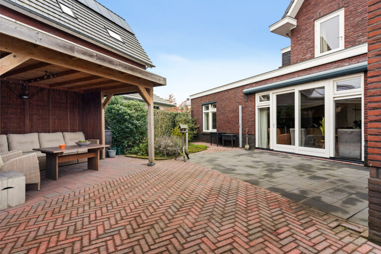 Via de schuifpui vanuit het eetgedeelte is er een fijne verbinding met de tuin. De tuin is verzorgd en praktisch ingericht en beschikt over een houten schuur met overkapping en een waterpunt aan de gevel.