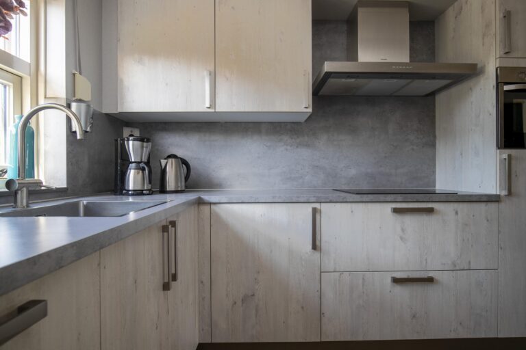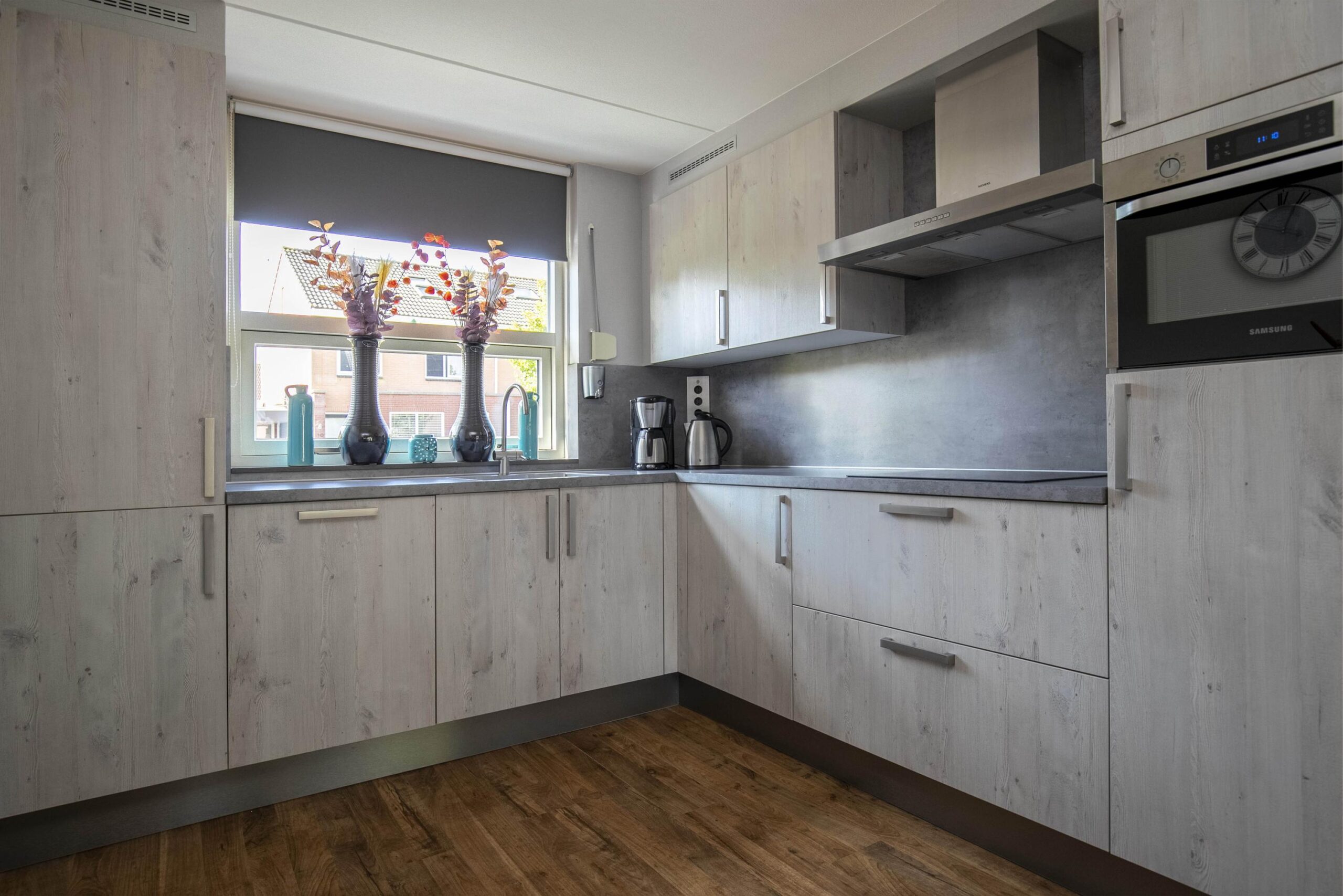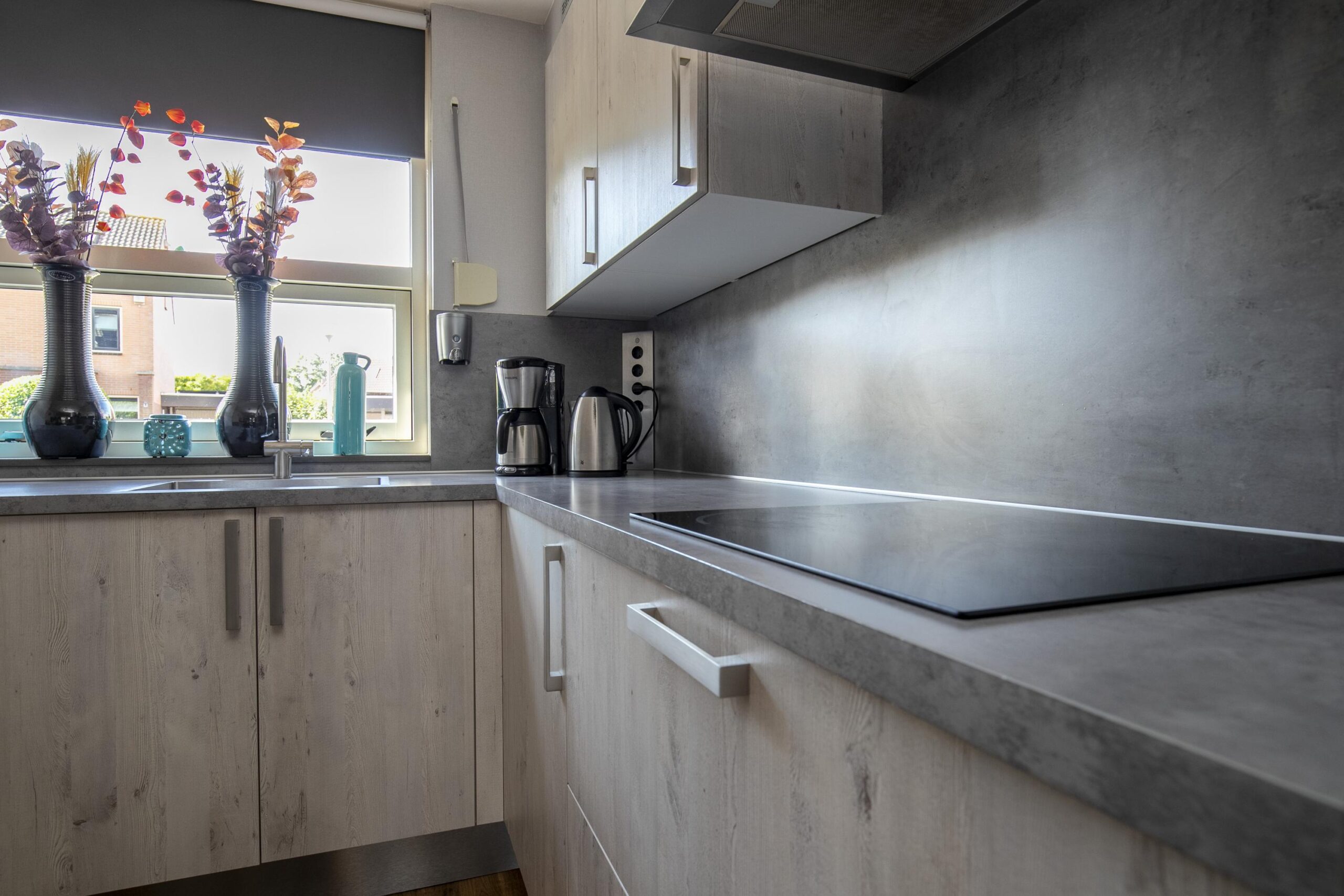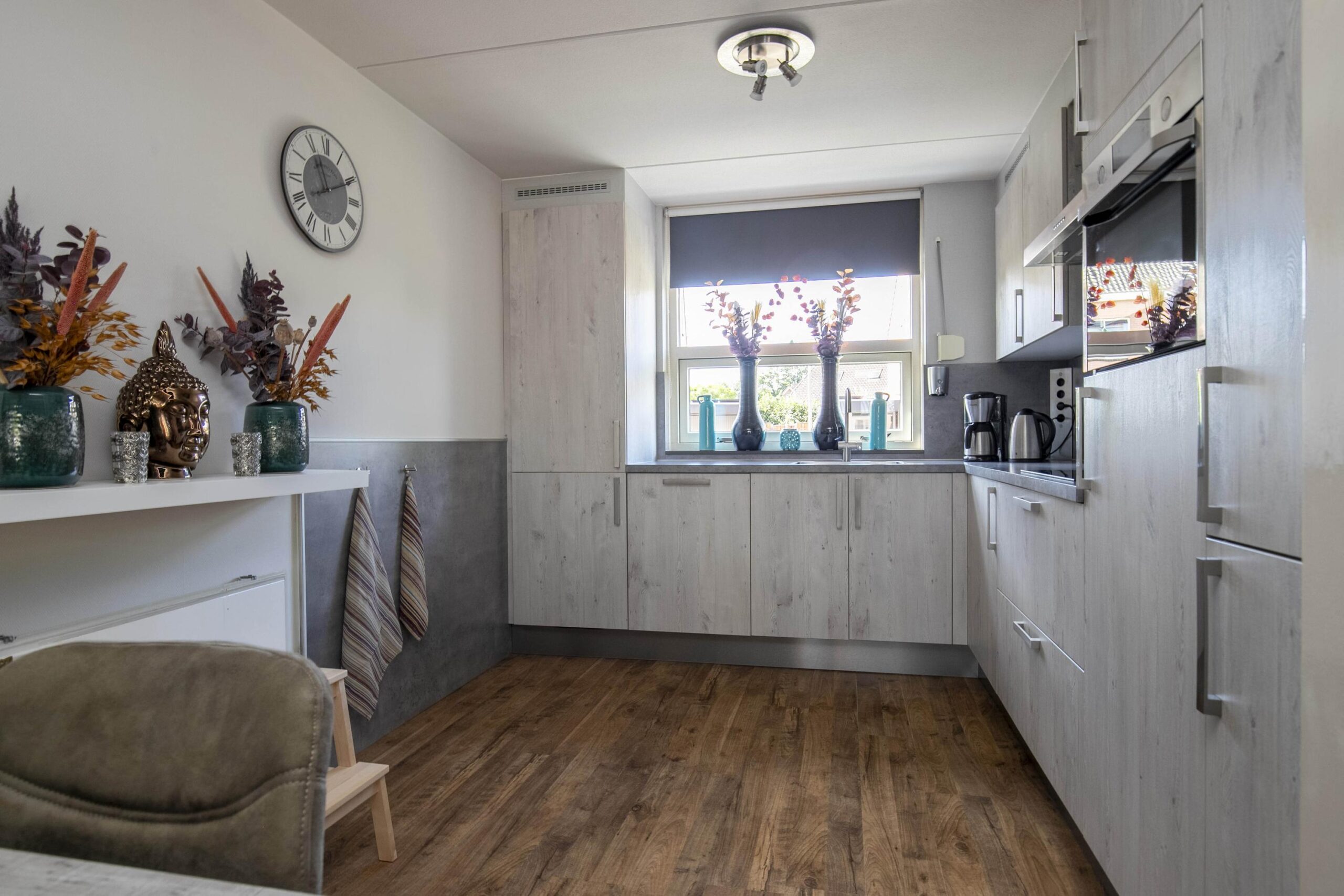 De keuken heeft een moderne uitstraling en is voorzien van veel kastruimte. Alle gemakken zijn aanwezig: een vaatwasser, combimagnetron, koelkast, vriezer, inductiekookplaat en afzuigkap. Dankzij de grote raampartij valt er veel daglicht binnen.