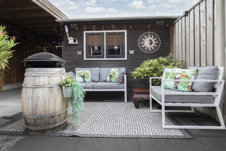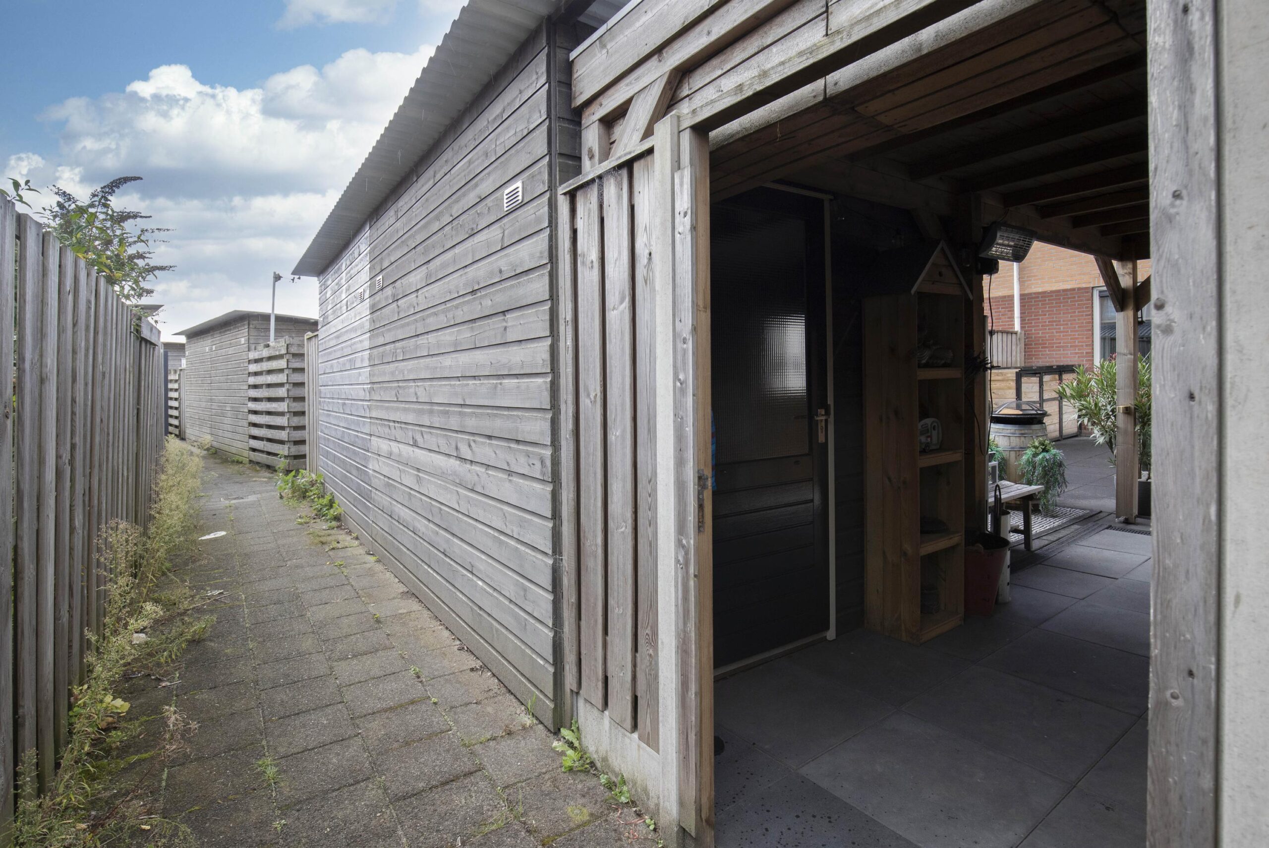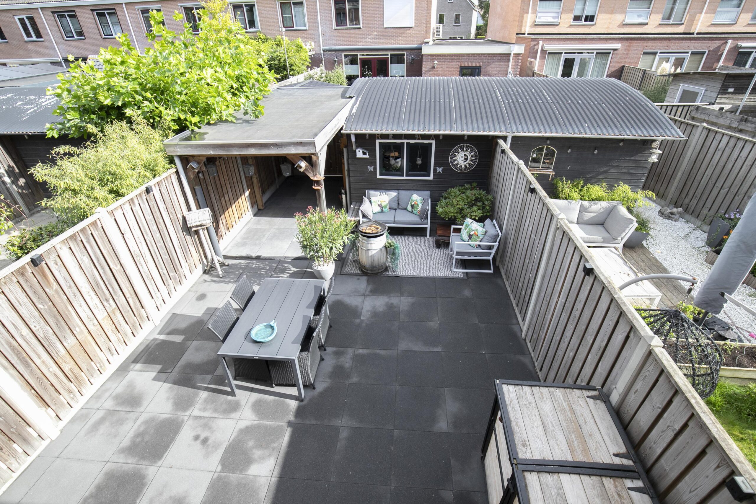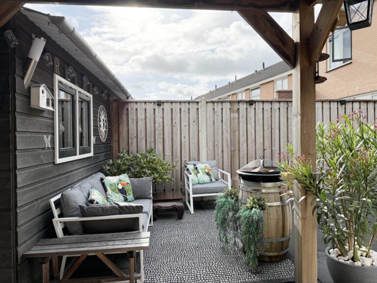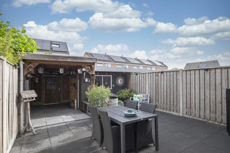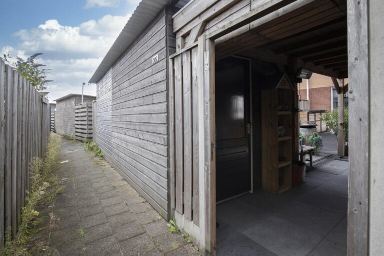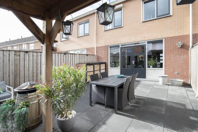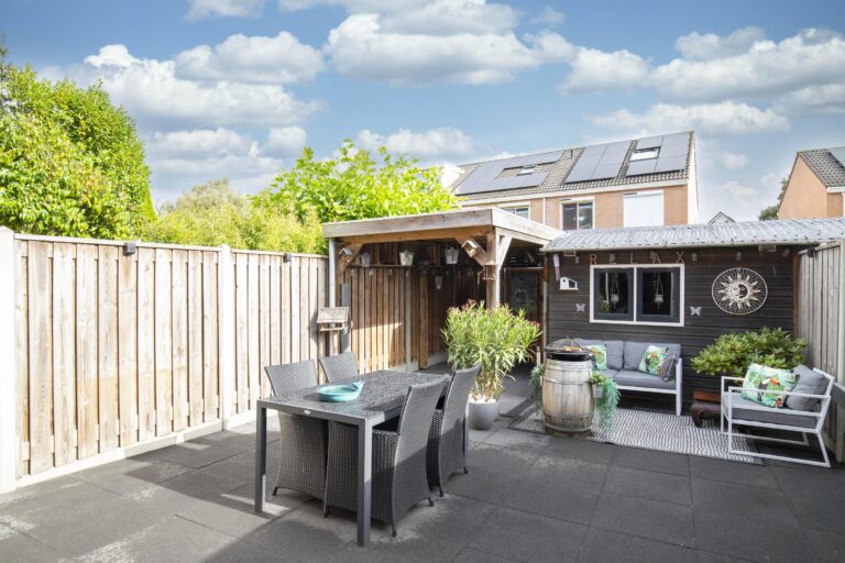 De achtertuin is bestraat met mooie, grote tegels, waardoor er veel plek is voor een zithoek én eettafel. De houten overkapping maakt het mogelijk om het hele jaar door buiten te genieten. Achterin staat een berging, ideaal voor fietsen en tuinspullen. De tuin beschikt bovendien over een achterom.