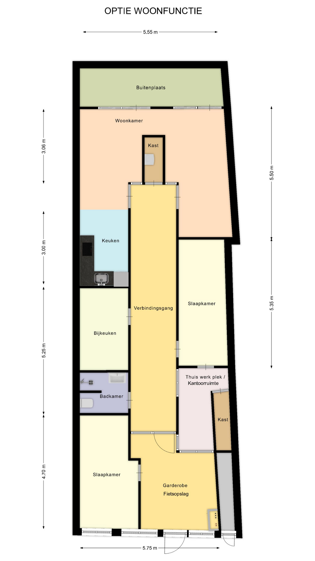 De ruimte is volledig gelijkvloers en biedt diverse indelingsmogelijkheden voor wie hier een comfortabele benedenwoning wil realiseren. Denk bijvoorbeeld aan: