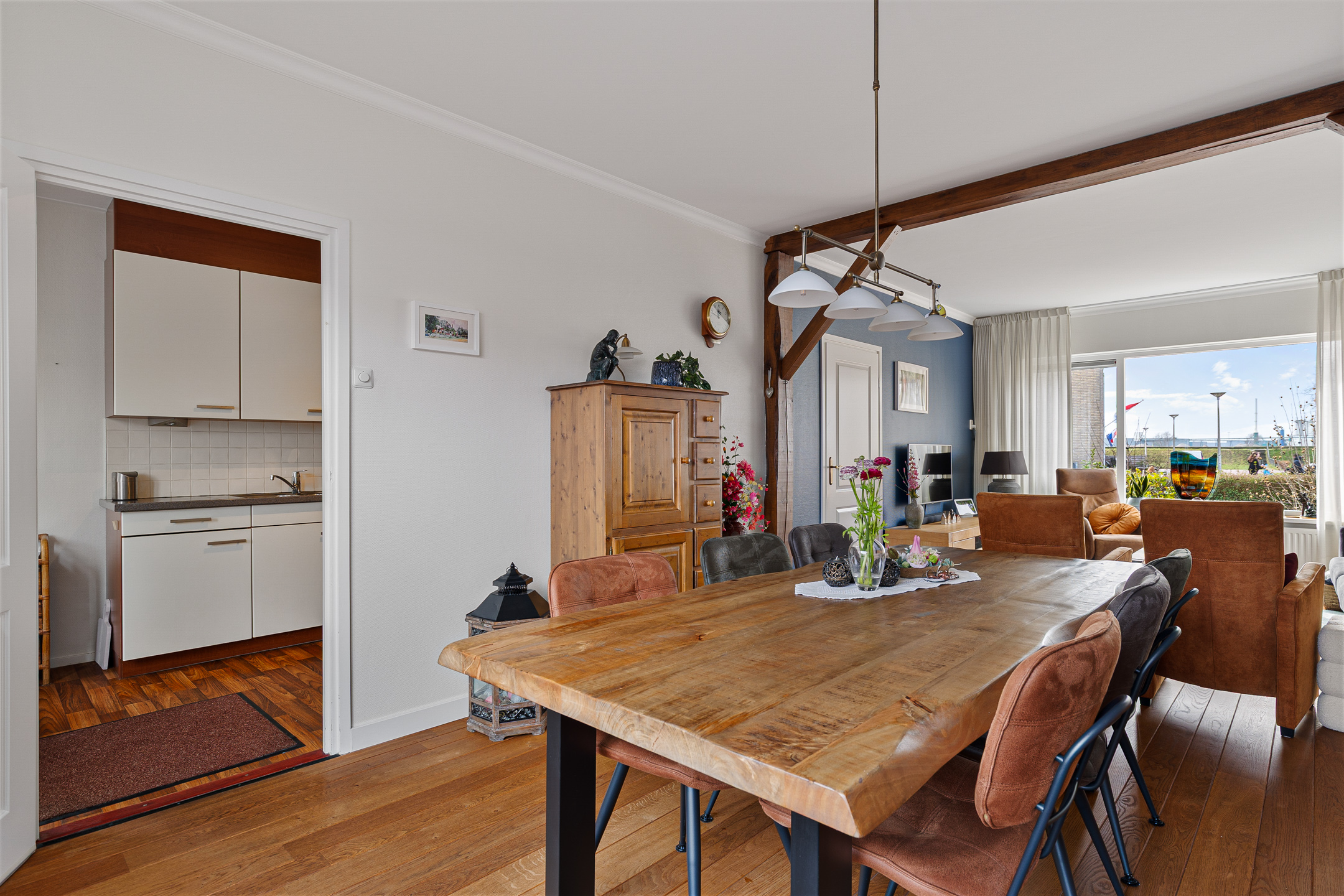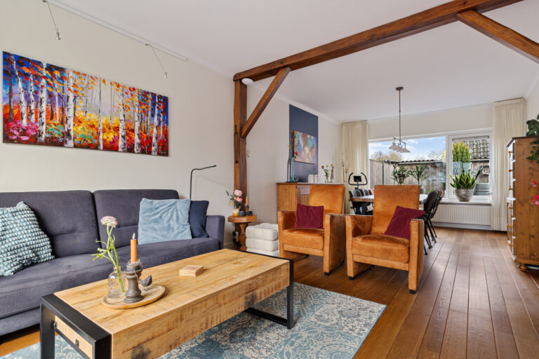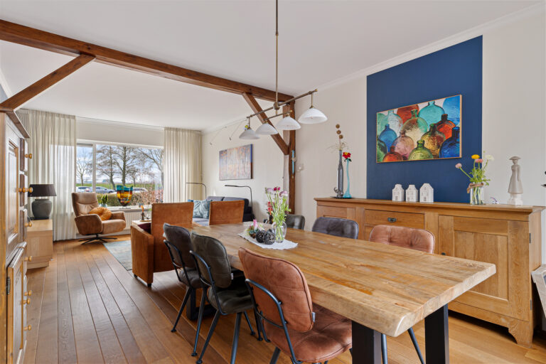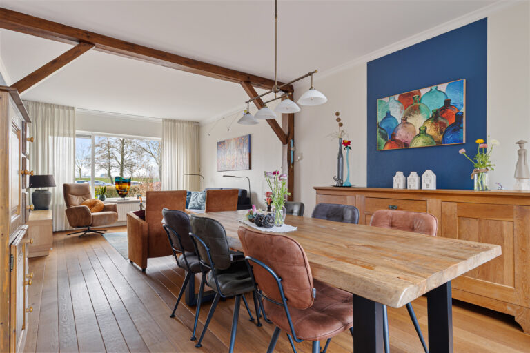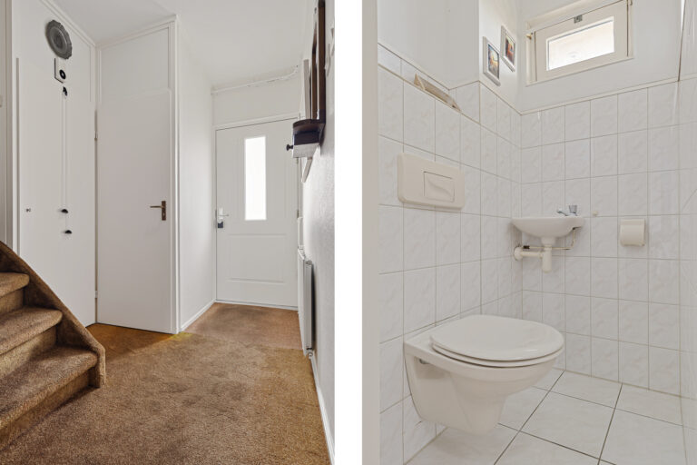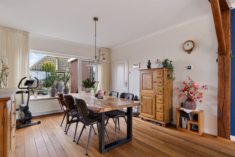 Via de entree kom je binnen in de hal met toilet, meterkast, trapopgang naar de verdieping en een praktische trapkast. Vanuit hier loop je door naar de woonkamer, die zich uitstrekt over de gehele lengte van de woning. Aan de voorzijde bevindt zich de zithoek met vrij zicht op het groene veld. Aan de achterzijde is ruimte voor een royale eettafel, ideaal voor lange avonden tafelen met familie en vrienden.