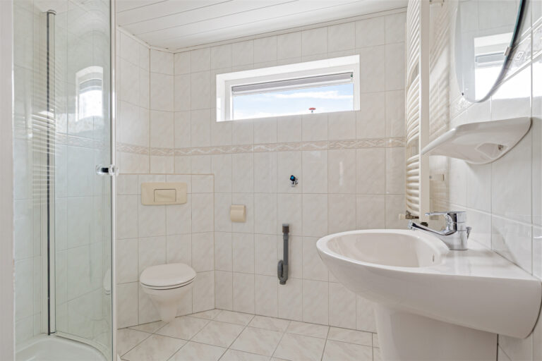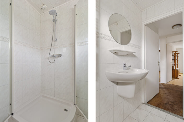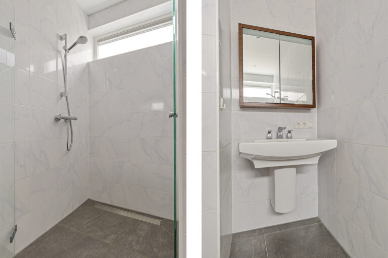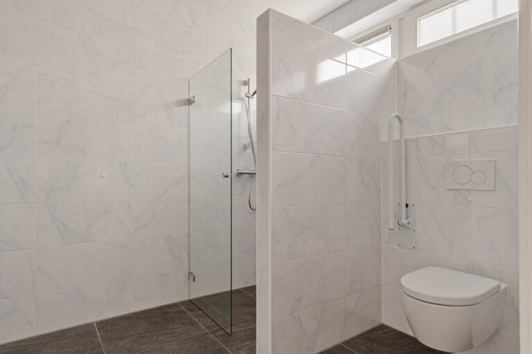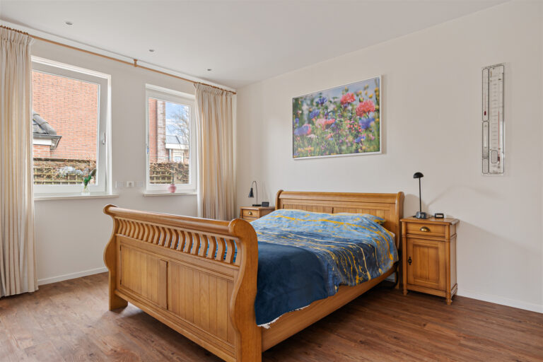 Aansluitend bereik je de bijkeuken met wasmachineaansluiting en extra bergruimte. Vanuit hier heb je toegang tot de achtertuin en tot de slaapkamer op de begane grond. Deze slaapkamer beschikt over een aangrenzende badkamer, voorzien van vloerverwarming, een toilet, douche en wastafel. De aanbouw met bijkeuken en slaapkamer/badkamer is gerealiseerd in 2015. Daarmee is de woning volledig levensloopbestendig en uitstekend geschikt voor ouderen of mindervaliden.
