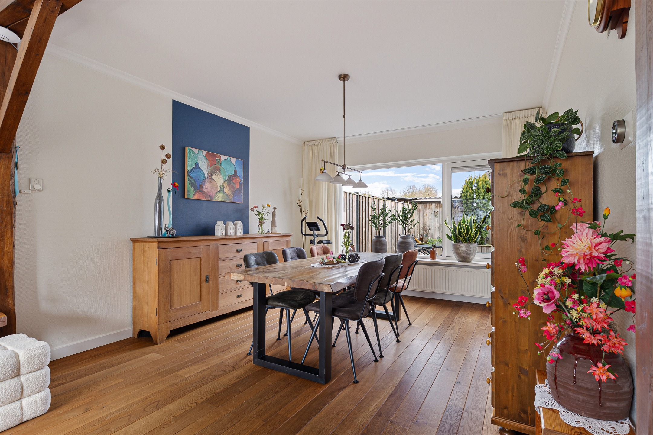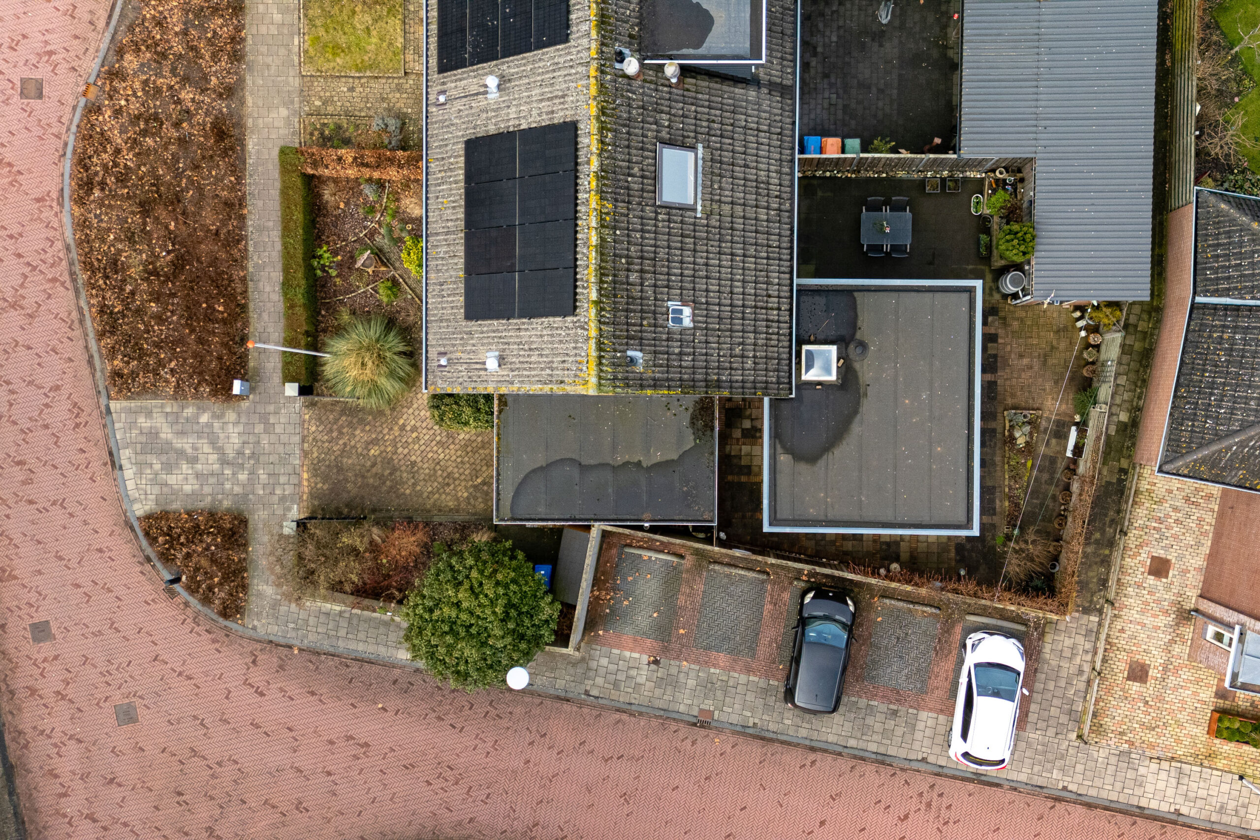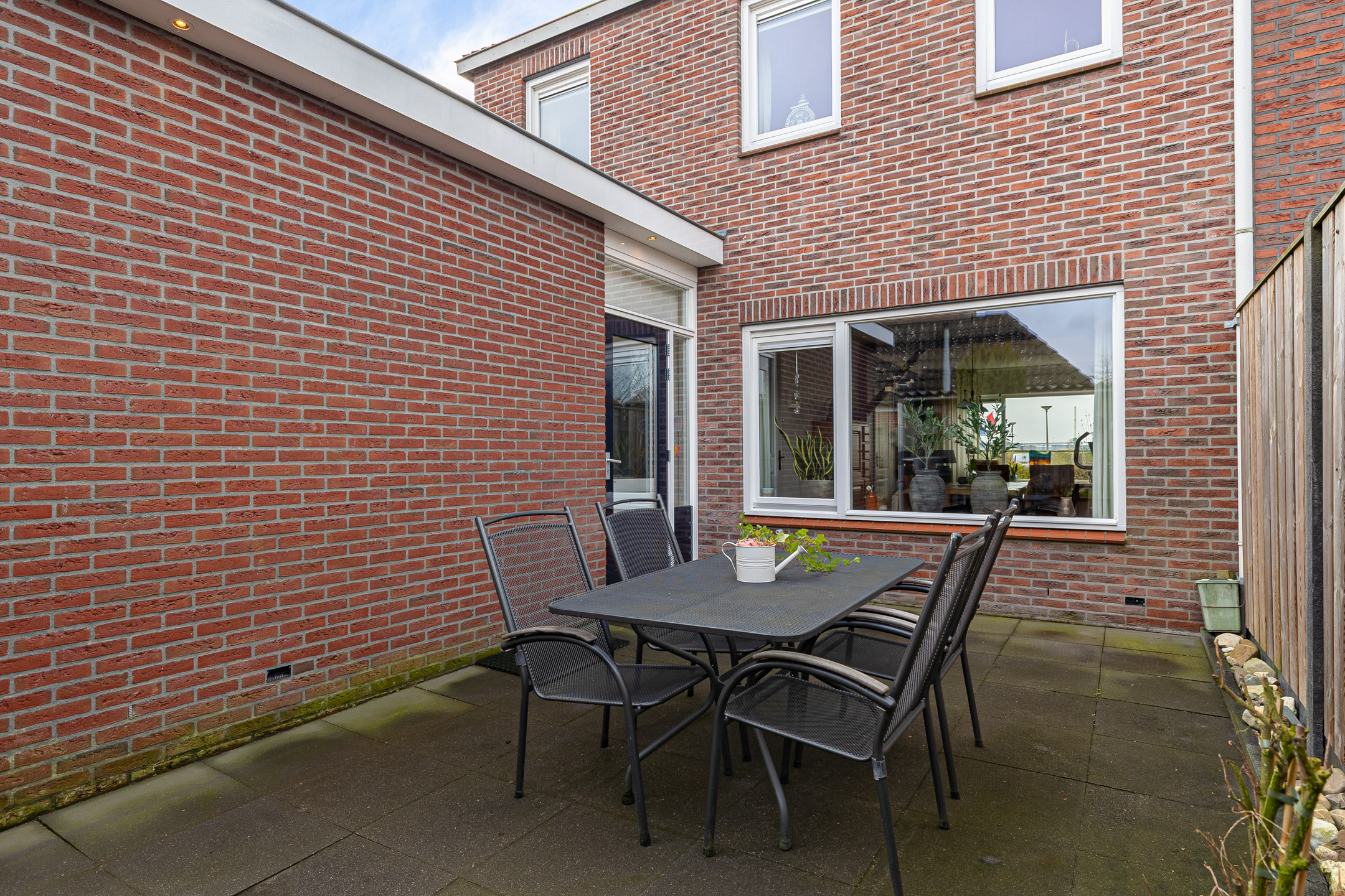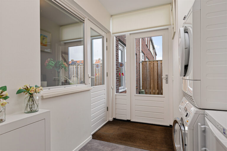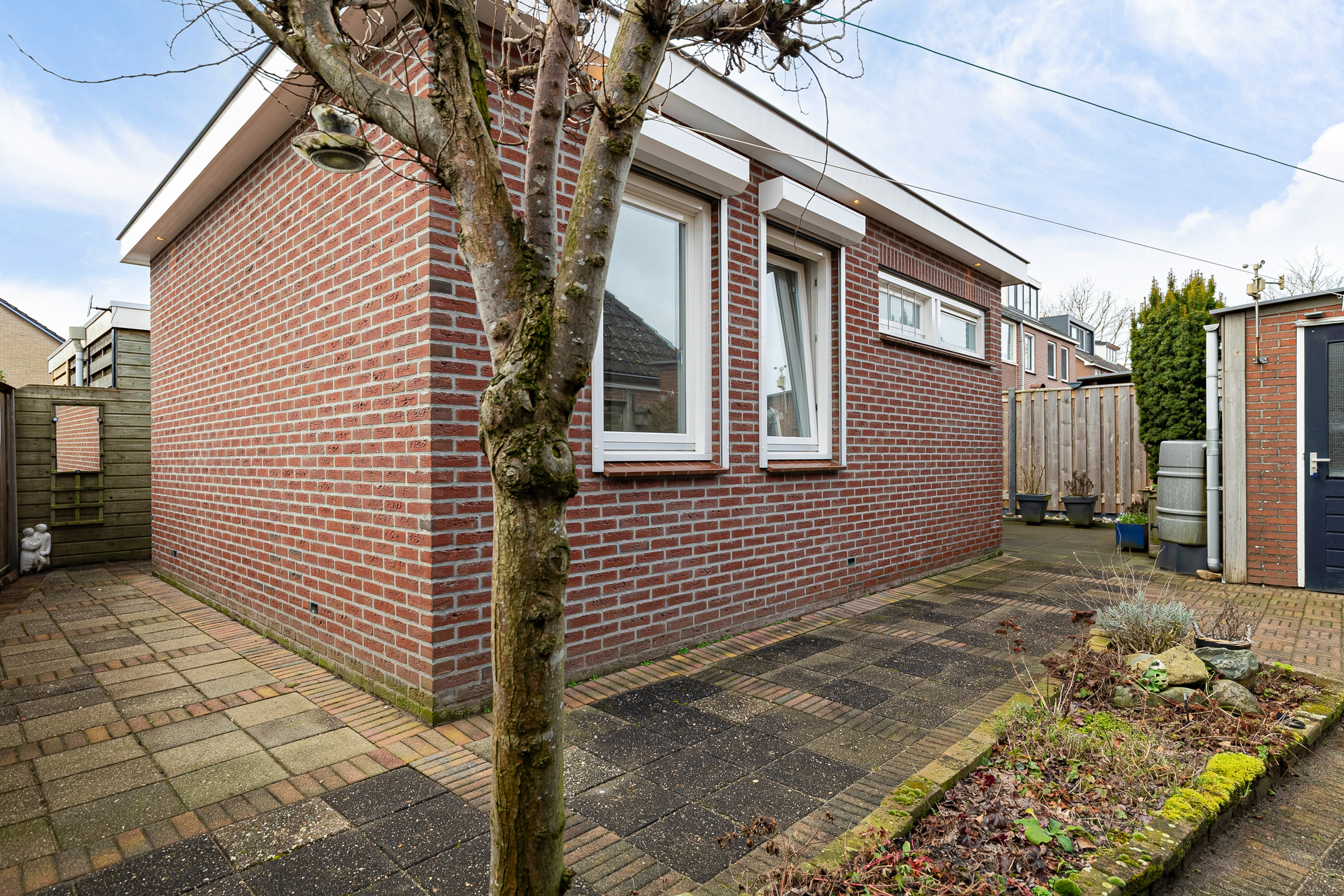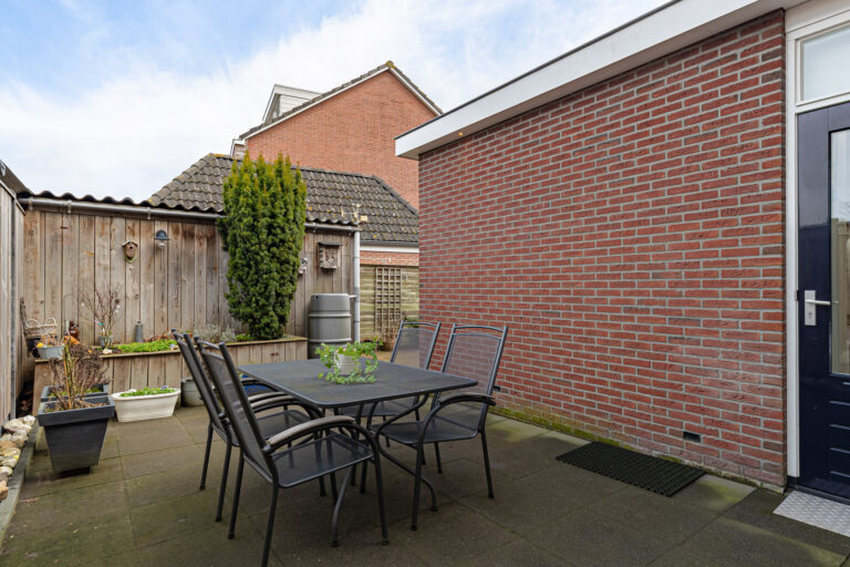 De achtertuin is verzorgd, onderhoudsvriendelijk en biedt volop privacy. De tuin is grotendeels bestraat, waardoor je hier weinig omkijken naar hebt en direct kunt genieten van het buitenleven. Er is voldoende ruimte voor een gezellige zithoek of een grote tuintafel. Dankzij de aanbouw is er een fijn, beschut terras direct bij de woning. Een heerlijke plek om al vroeg in het voorjaar buiten te zitten.