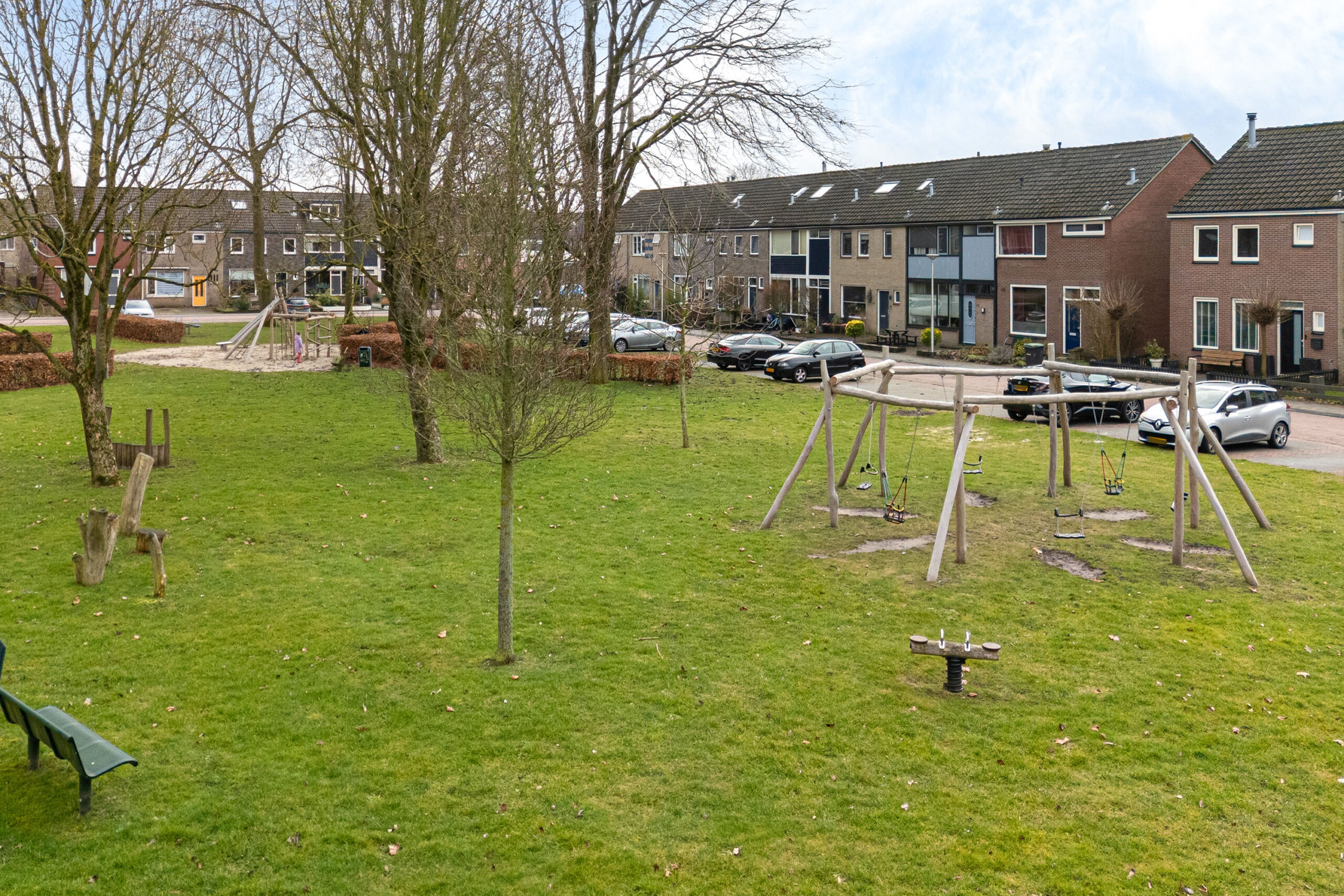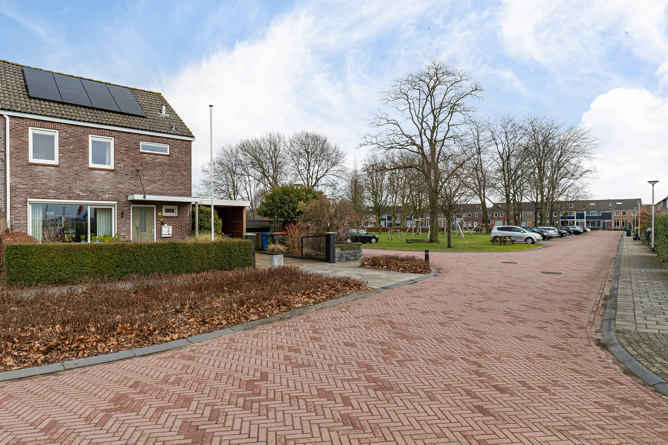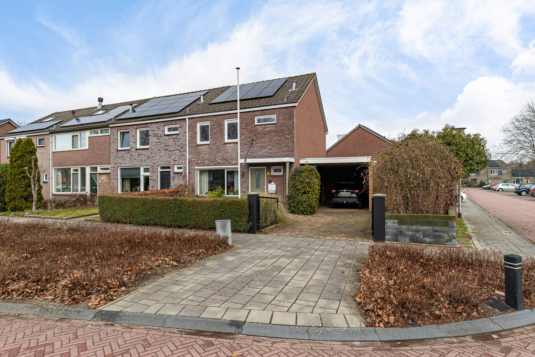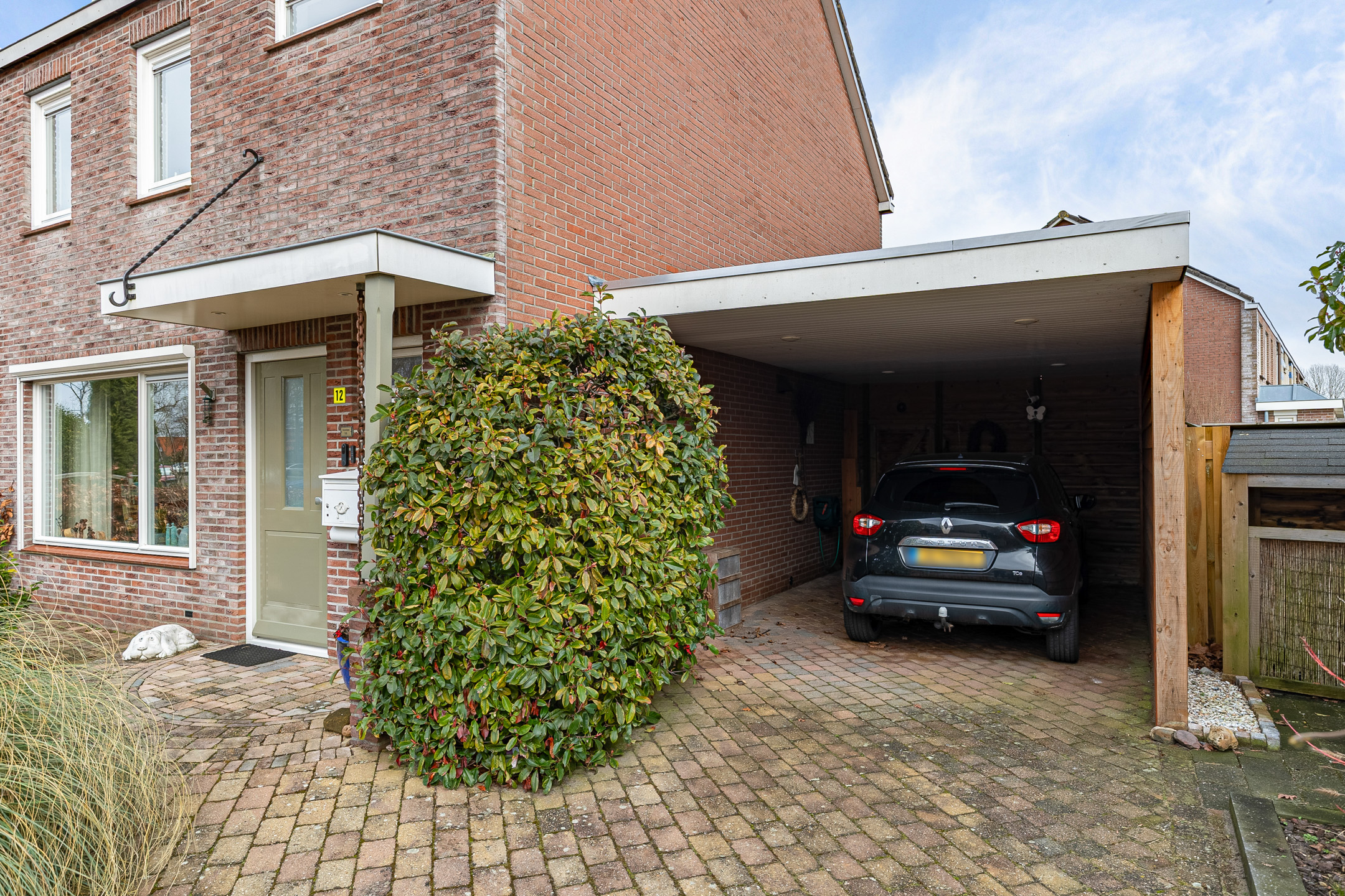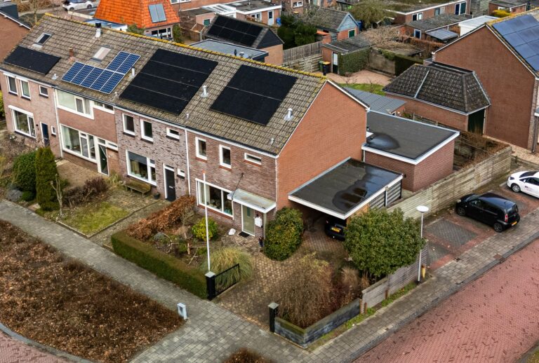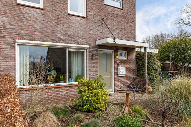Bij aankomst parkeer je de auto gemakkelijk op eigen oprit of onder de carport. De woning heeft in 1998 een nieuwe stenen buitengevel gekregen, wat zorgt voor een mooie uitstraling. Aan de voorzijde ligt een groen grasveld, wat direct een prettig en ruimtelijk gevoel geeft.