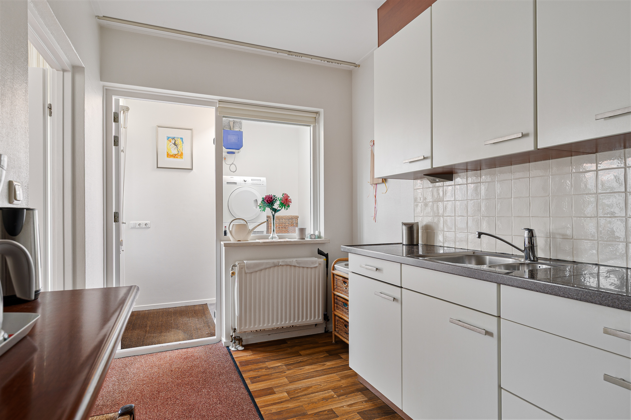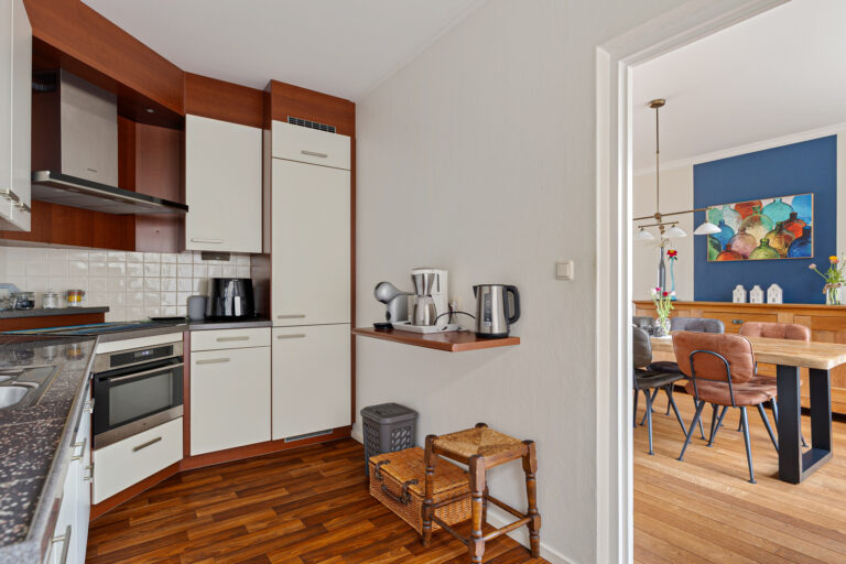 De keuken is voorzien van diverse inbouwapparatuur, waaronder een koelkast, inductiekookplaat, afzuigkap, combi-oven en vriezer. Een functionele ruimte met alles binnen handbereik.