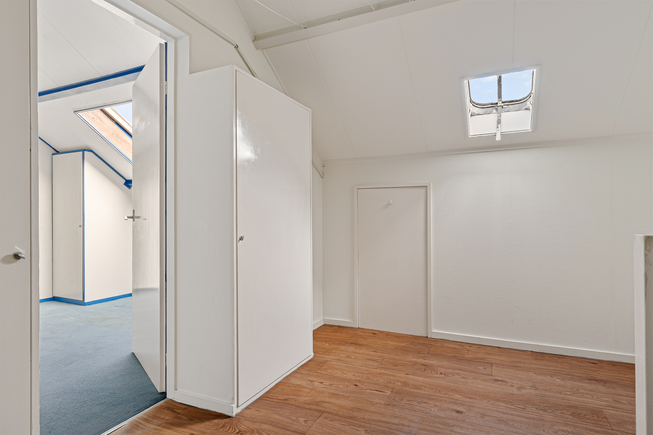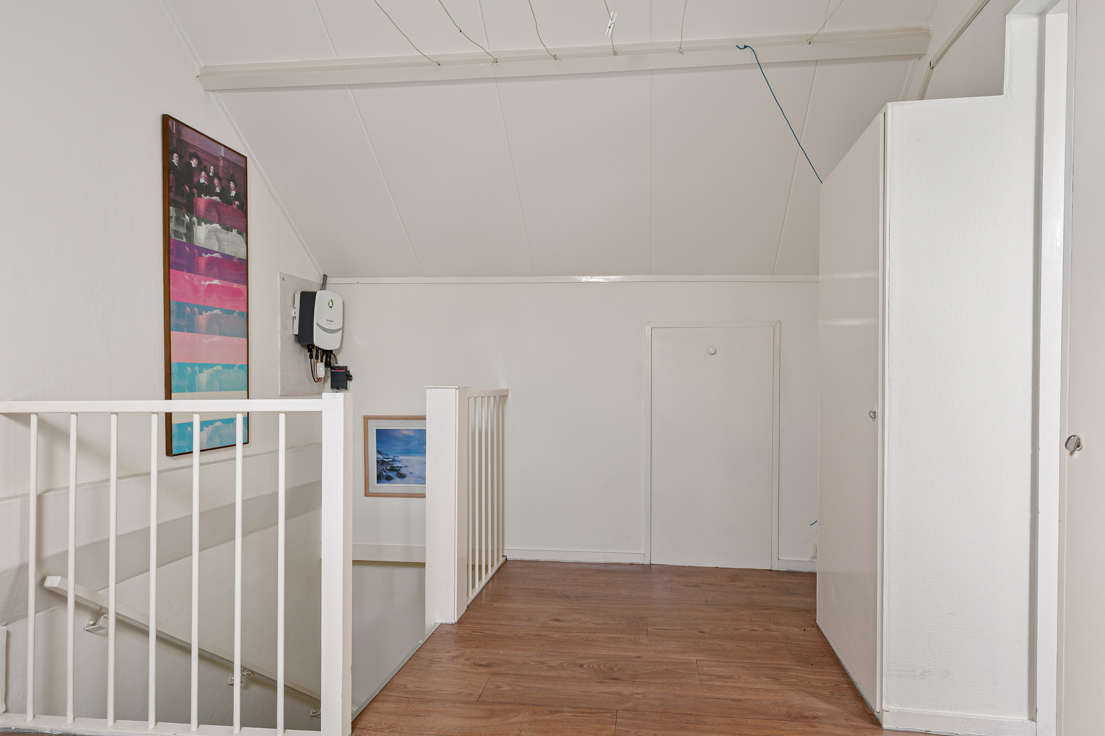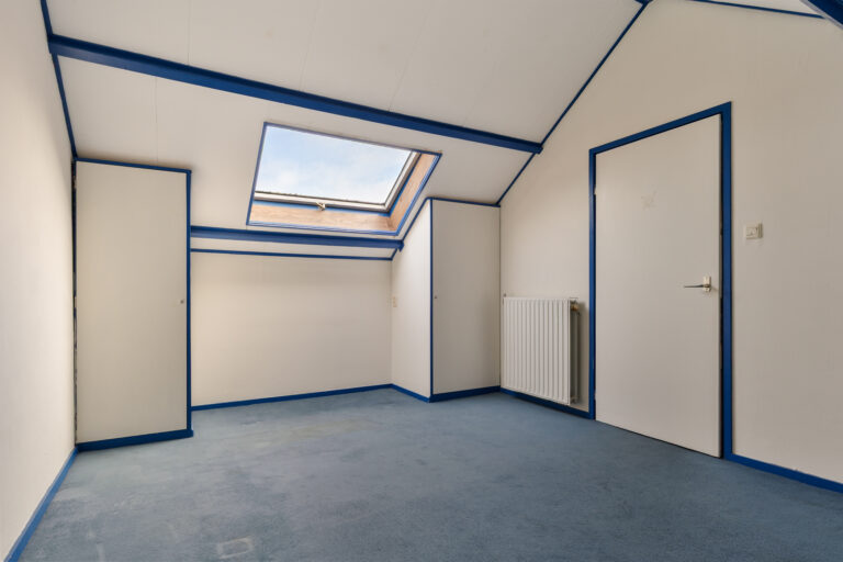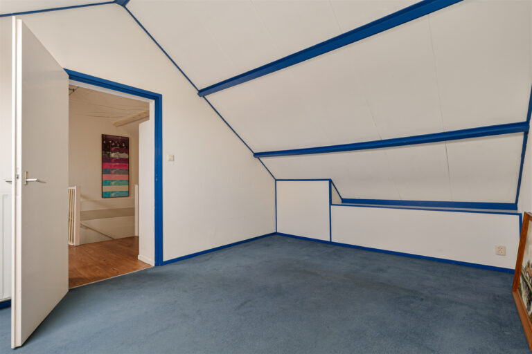 Via een vaste trap bereik je de tweede verdieping. Hier bevindt zich nog een slaapkamer. Op de overloop hangen de cv-ketel en de omvormer van de zonnepanelen. Achter de knieschotten is extra bergruimte aanwezig. Ideaal voor seizoensspullen of koffers.