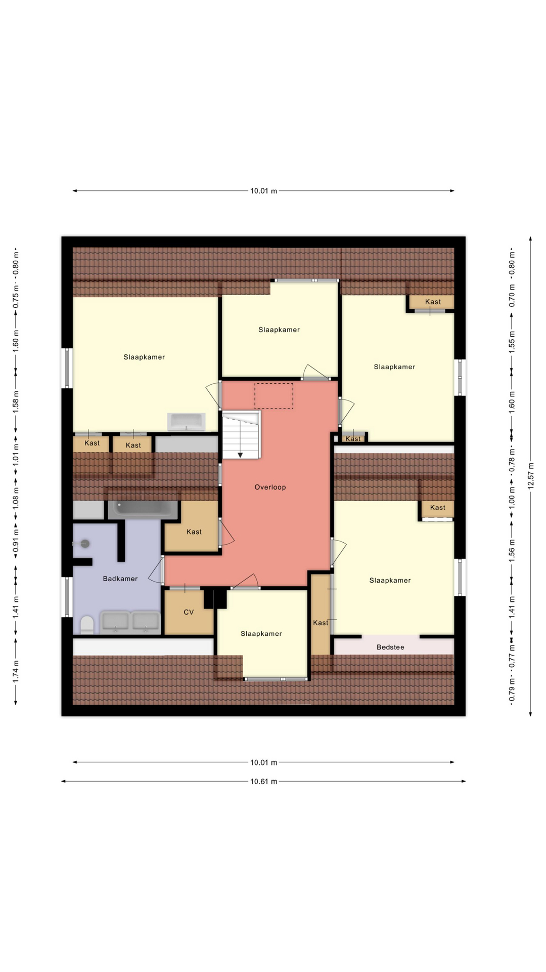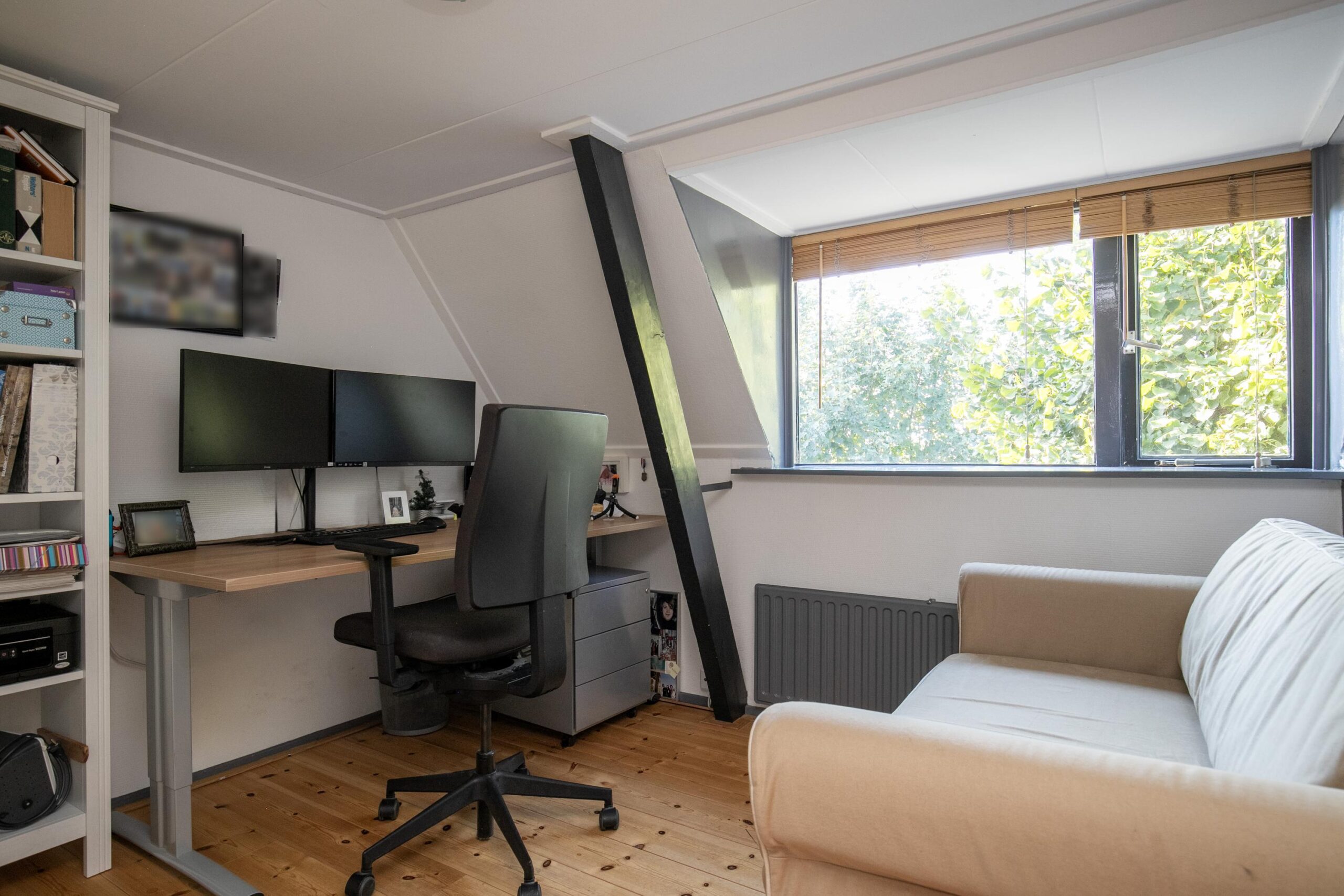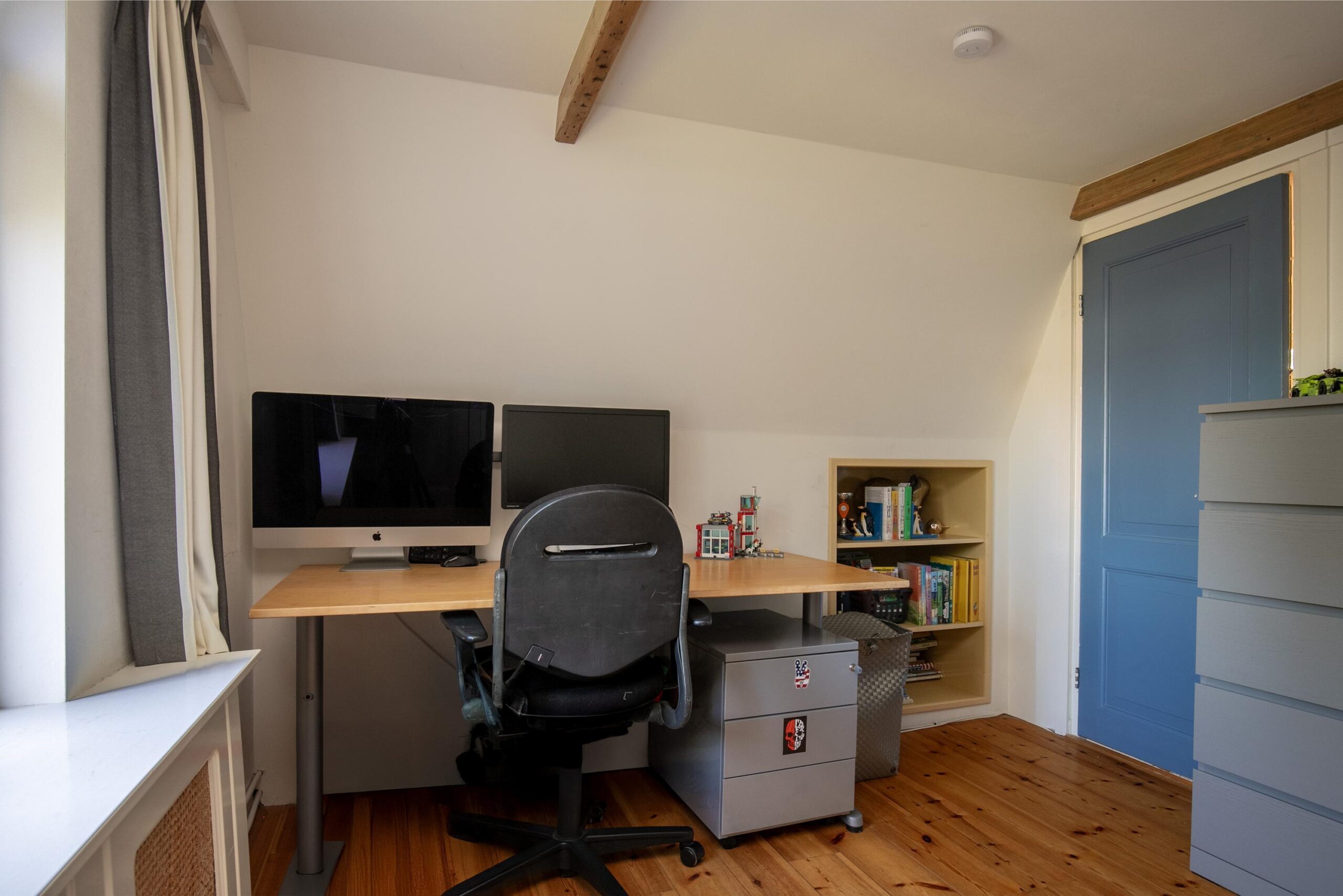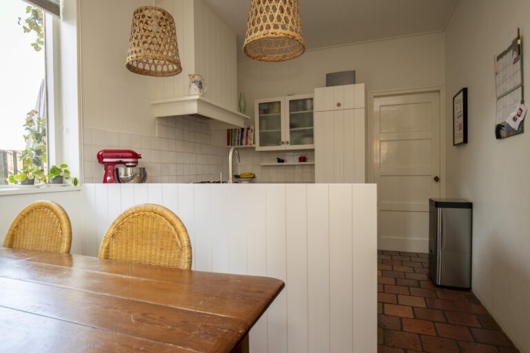 Daarnaast vind je op deze verdieping meerdere vaste kasten en zelfs een klassieke bedstee, die het huis een speels en historisch accent geeft.