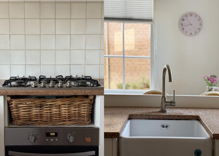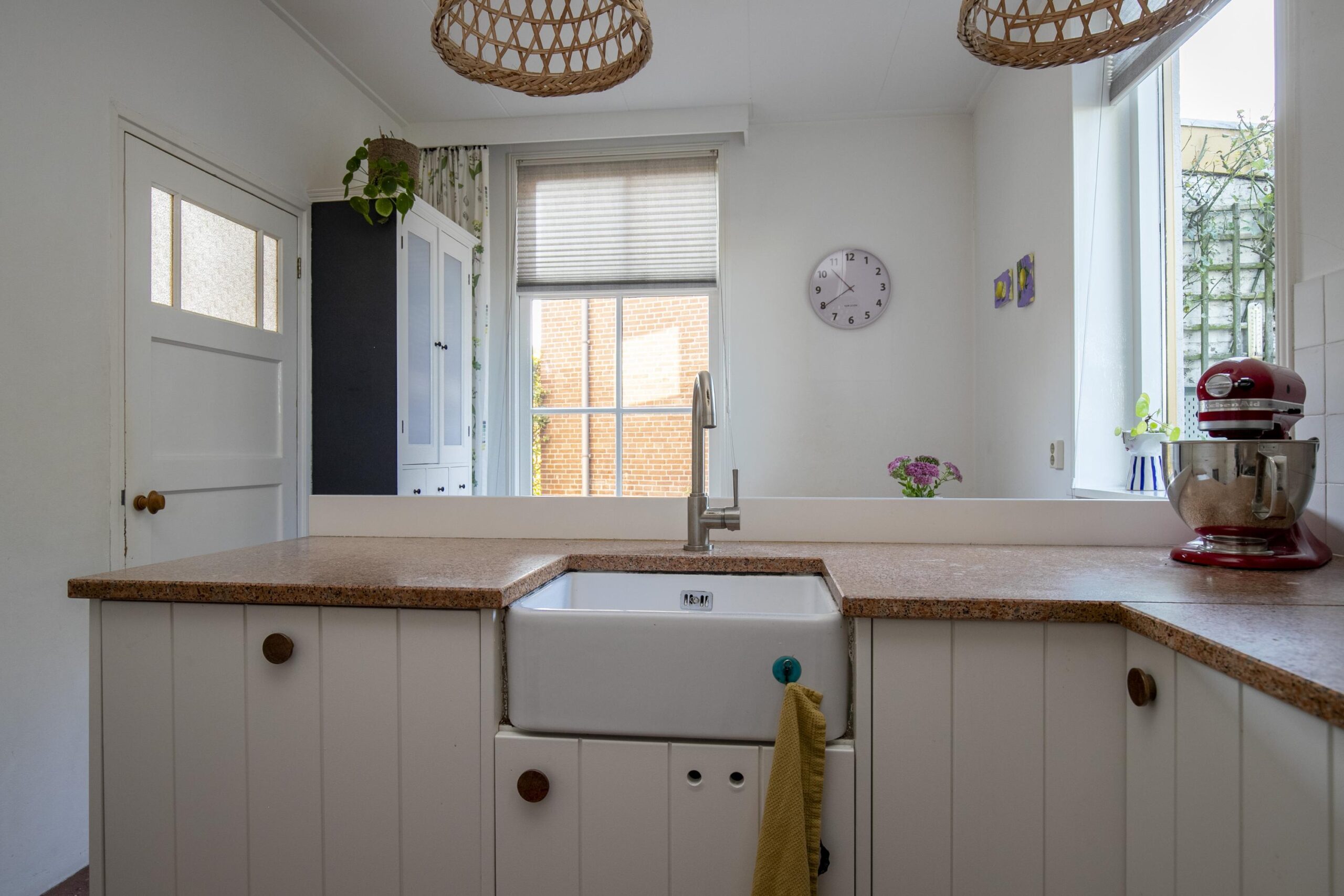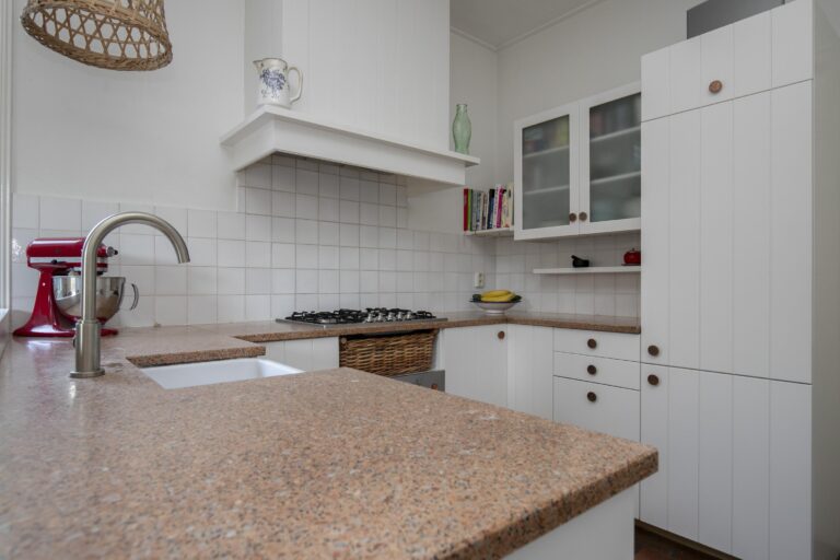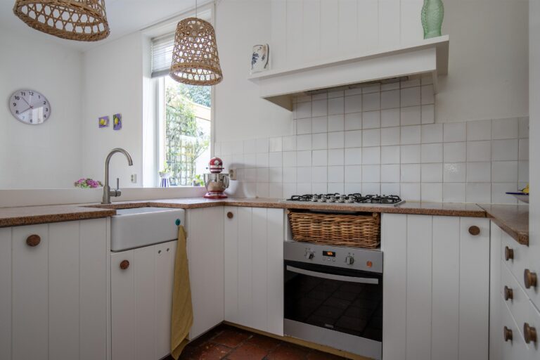 De keuken is een fijne werkplek voor kookliefhebbers, met voldoende kastruimte. Het werkblad biedt veel werkoppervlak en de ramen zorgen voor een lichte en uitnodigende sfeer. De keuken is uitgerust met een 5 pits-gasstel, oven en een karakteristieke spoelbak die het geheel een landelijke uitstraling geeft. Dankzij de hoekopstelling is alles binnen handbereik, en er is voldoende plek om samen te koken of te bakken.