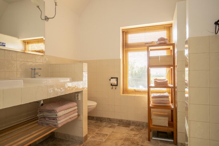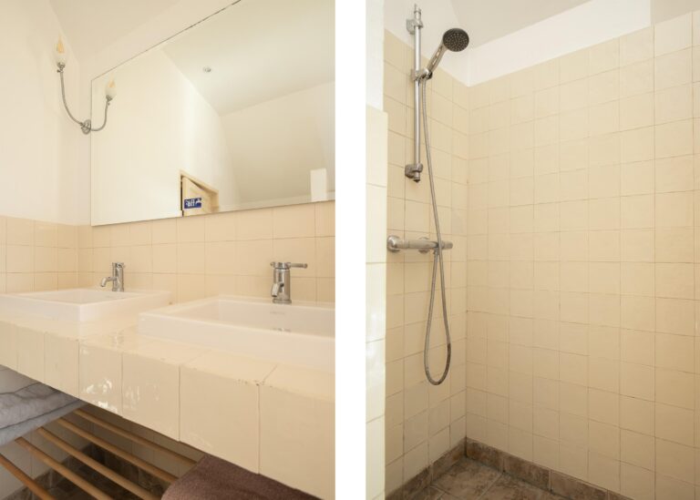 De badkamer is ruim opgezet en praktisch ingedeeld, met alles wat je nodig hebt voor dagelijks comfort. Er is een ligbad waar je heerlijk kunt ontspannen, een aparte douche en een toilet. Het grote wastafelmeubel met dubbele wasbak zorgt ervoor dat de ochtendspits soepel verloopt.
