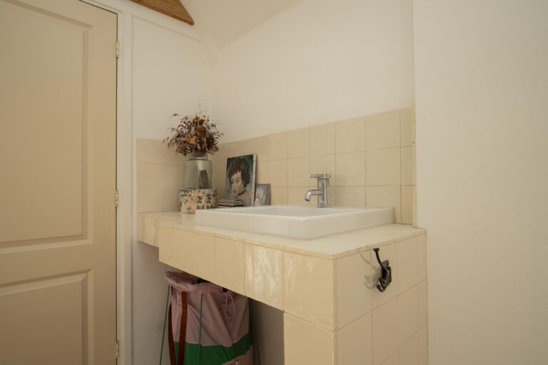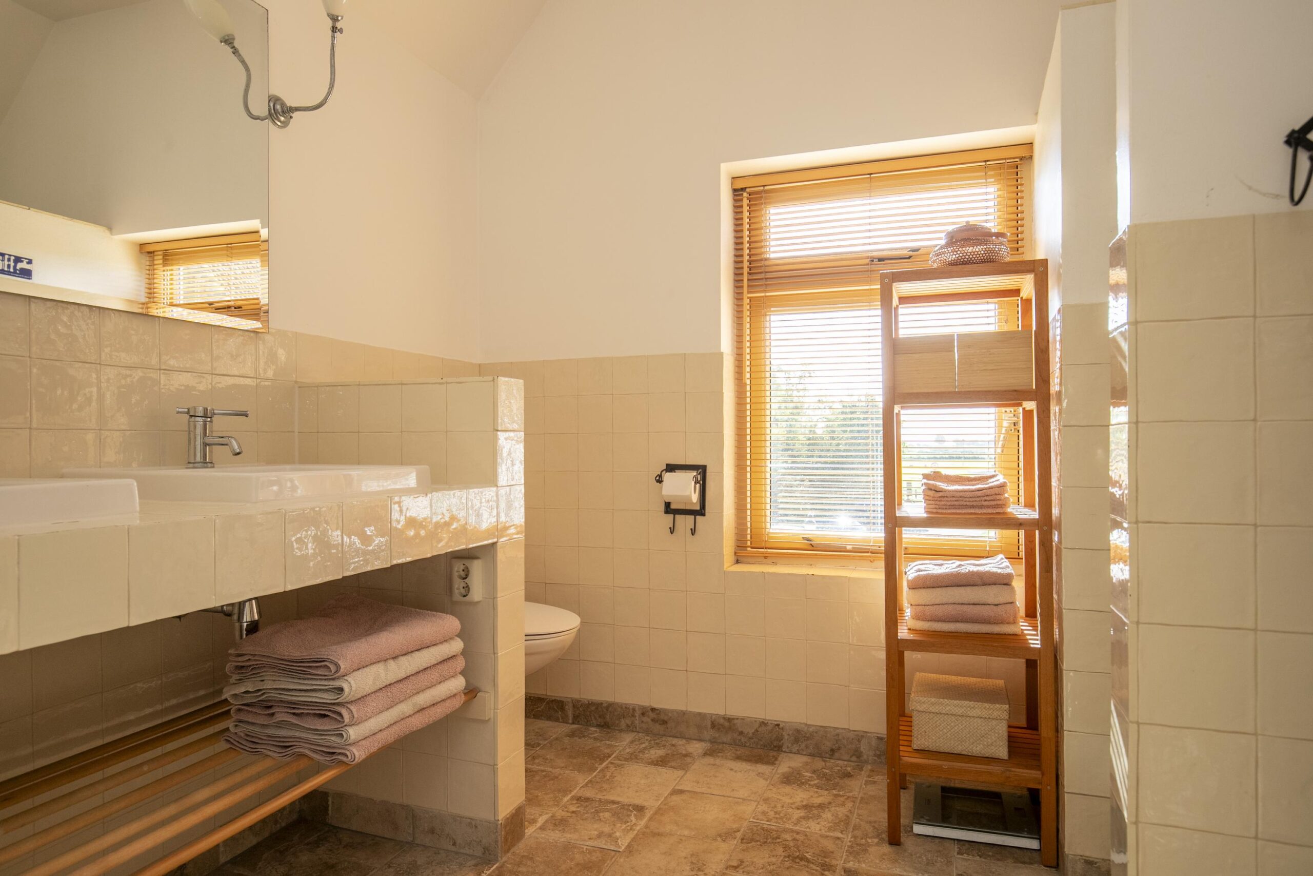 Dankzij het raam valt er prettig daglicht naar binnen, wat de ruimte een frisse en lichte uitstraling geeft. De combinatie van lichte wandtegels en een neutrale vloer maakt de badkamer tijdloos en eenvoudig naar eigen smaak aan te passen.