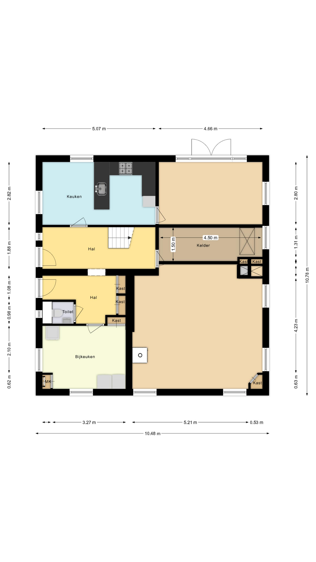 In de woonkamer bevindt zich het luik naar de kelder, die maar liefst 4,50 meter breed en 1,50 meter lang is.