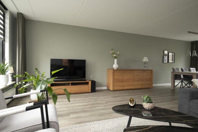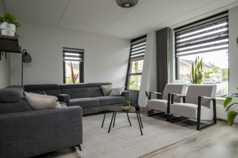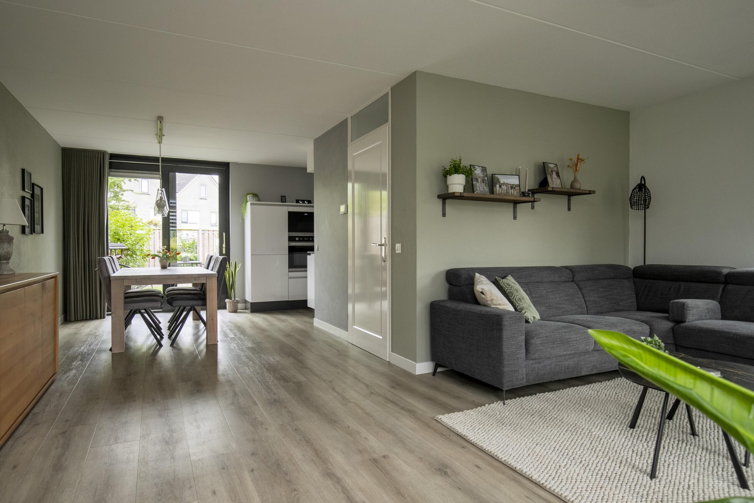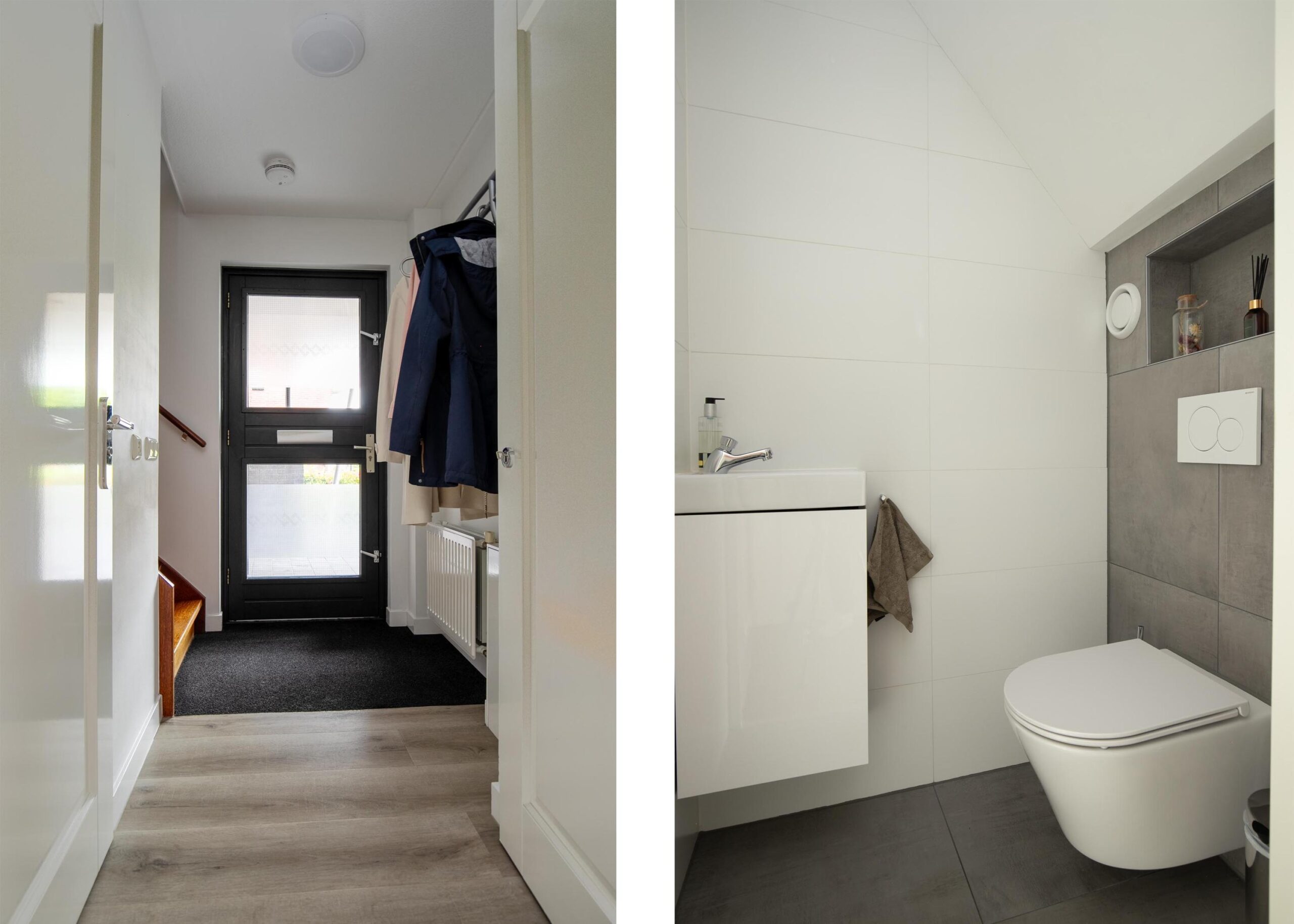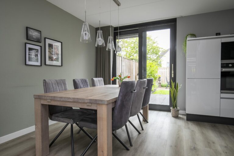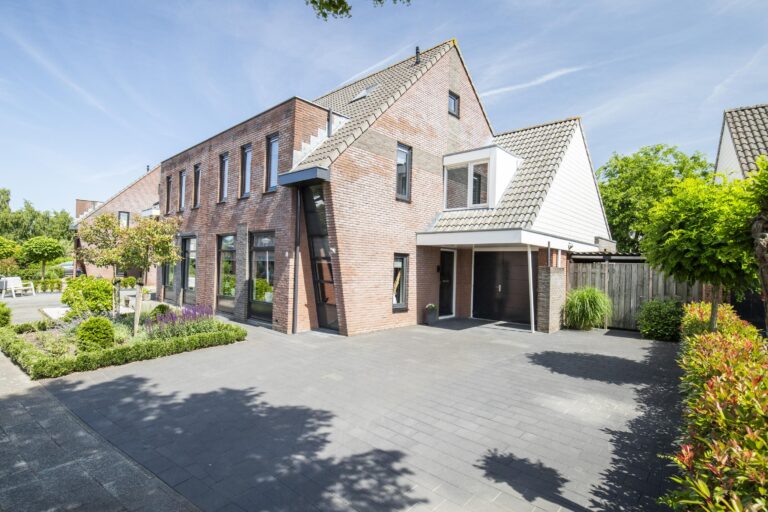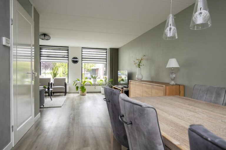 Aan de voorzijde van de woning bevindt zich een royale oprit met volop parkeergelegenheid voor meerdere auto’s. De brede kavel benadrukt de royale opzet en versterkt het gevoel van comfort en ruimte. Via de overdekte entree betreed je de hal met vanuit daar toegang tot de toiletruimte en de trapopgang. De lichte woonkamer biedt volop ruimte voor een gezellige zithoek en eettafel. Dankzij de PVC-vloer, het lichte plafond en de royale raampartijen straalt de ruimte een frisse en moderne sfeer uit.