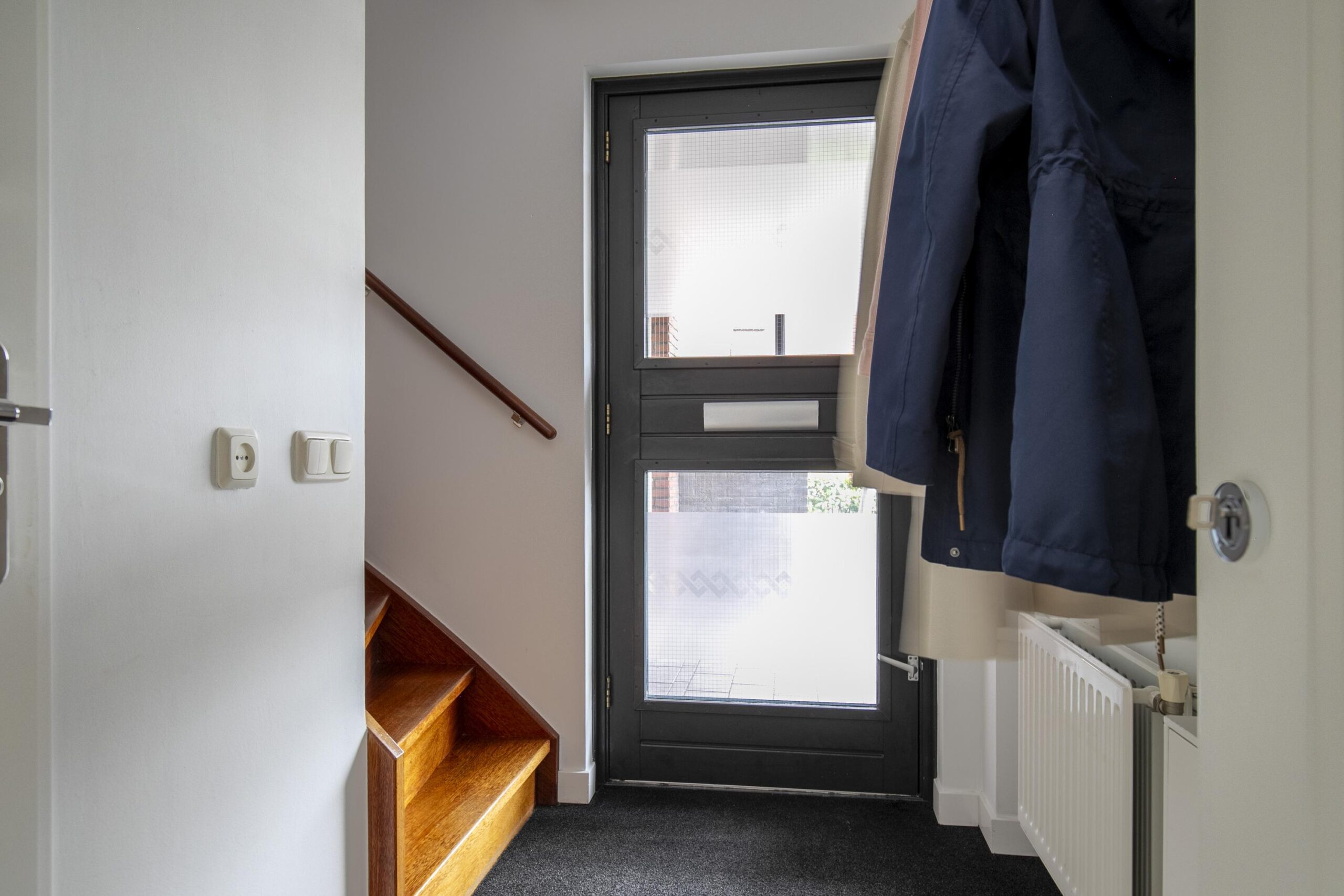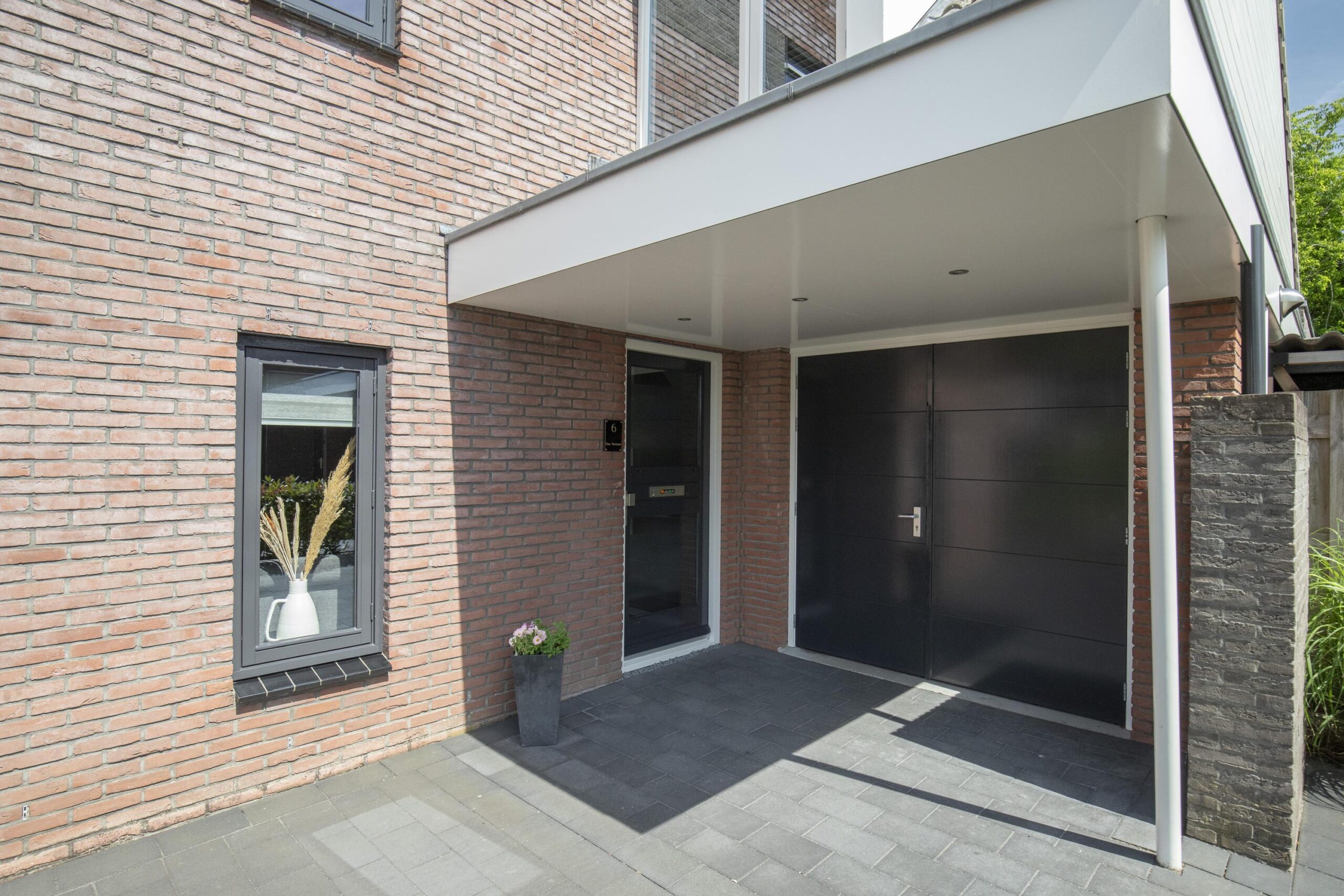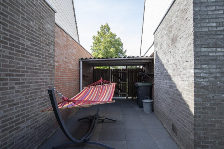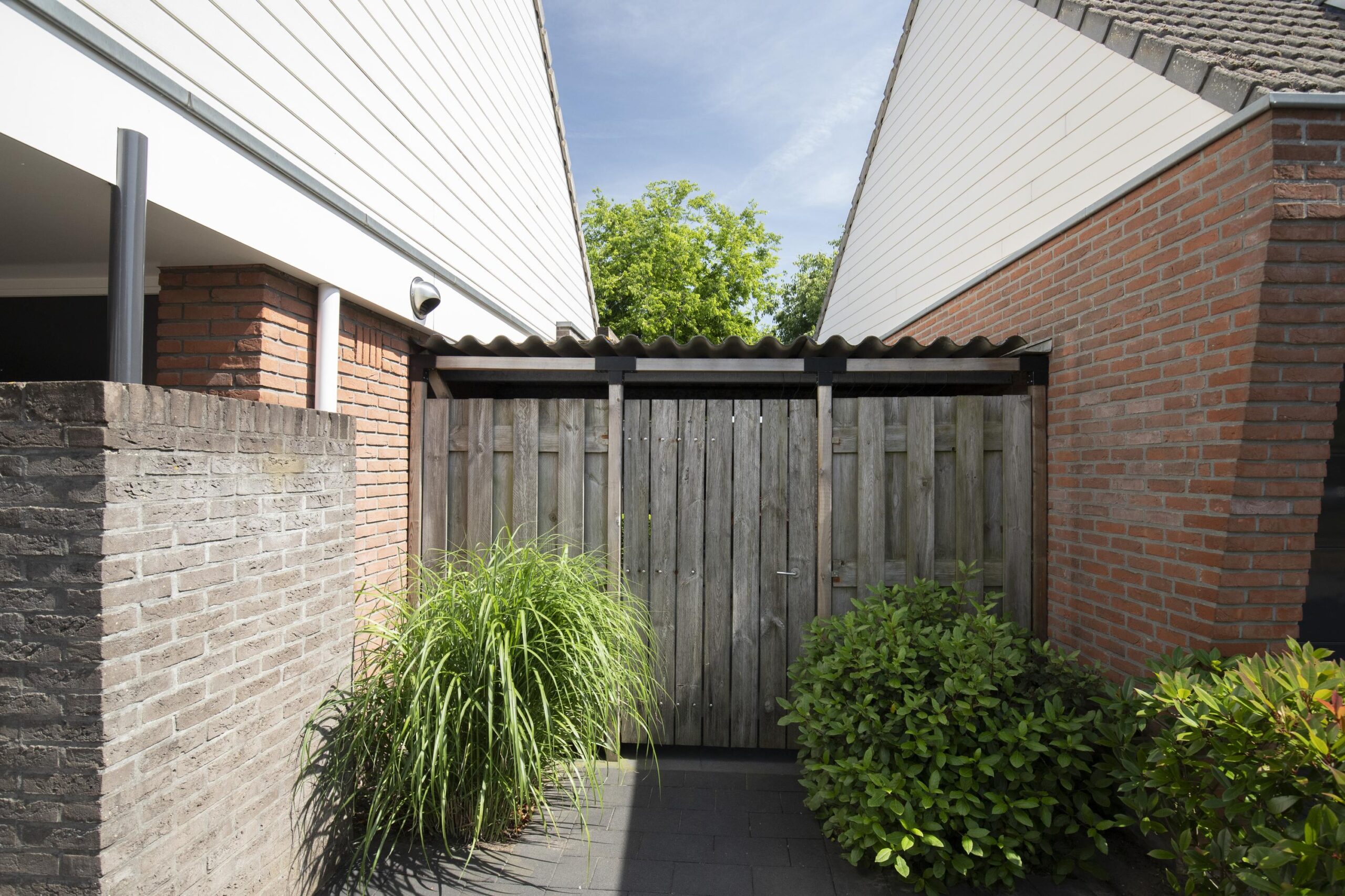 Aan de zijkant van de woning bevindt zich een toegangsdeur in de schutting die leidt naar de oprit. Op deze plek is onder een afdak gelegenheid om de containers te stallen.
