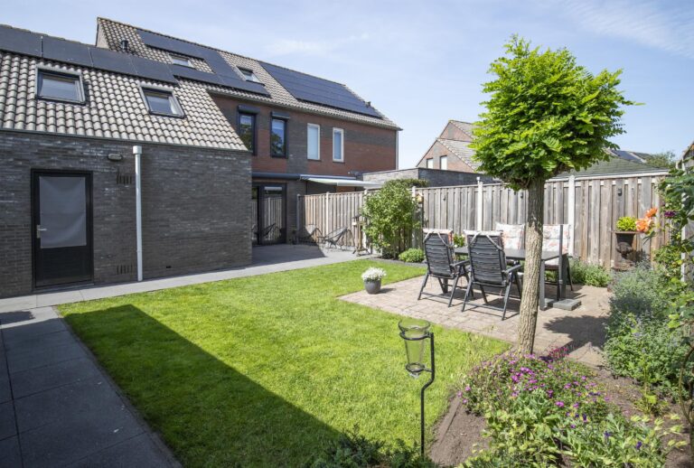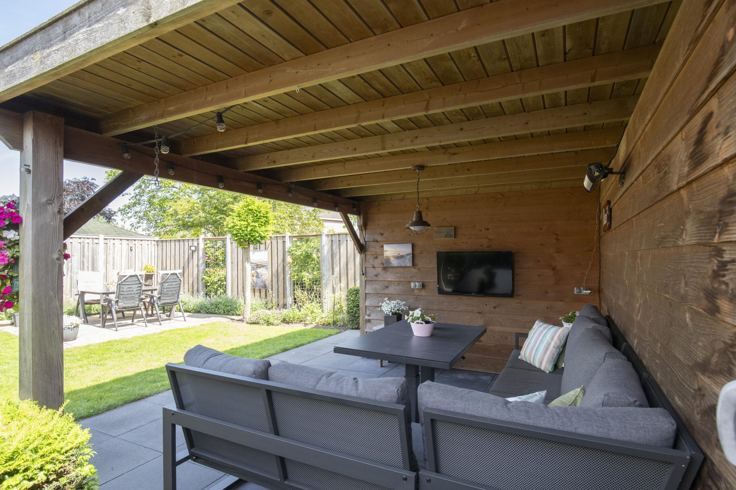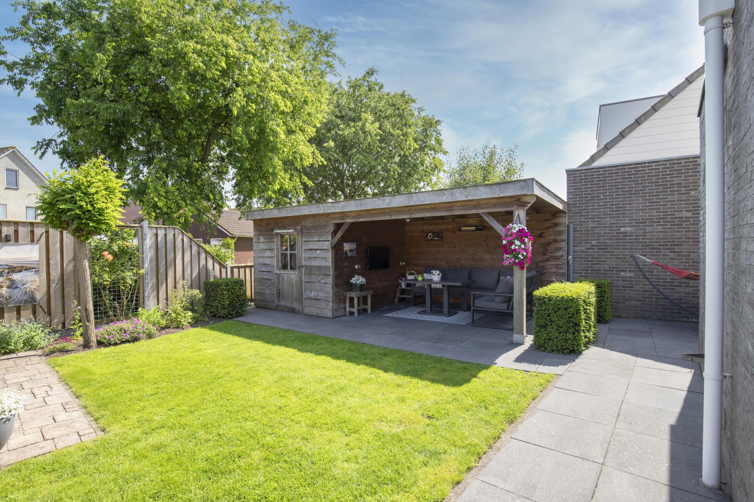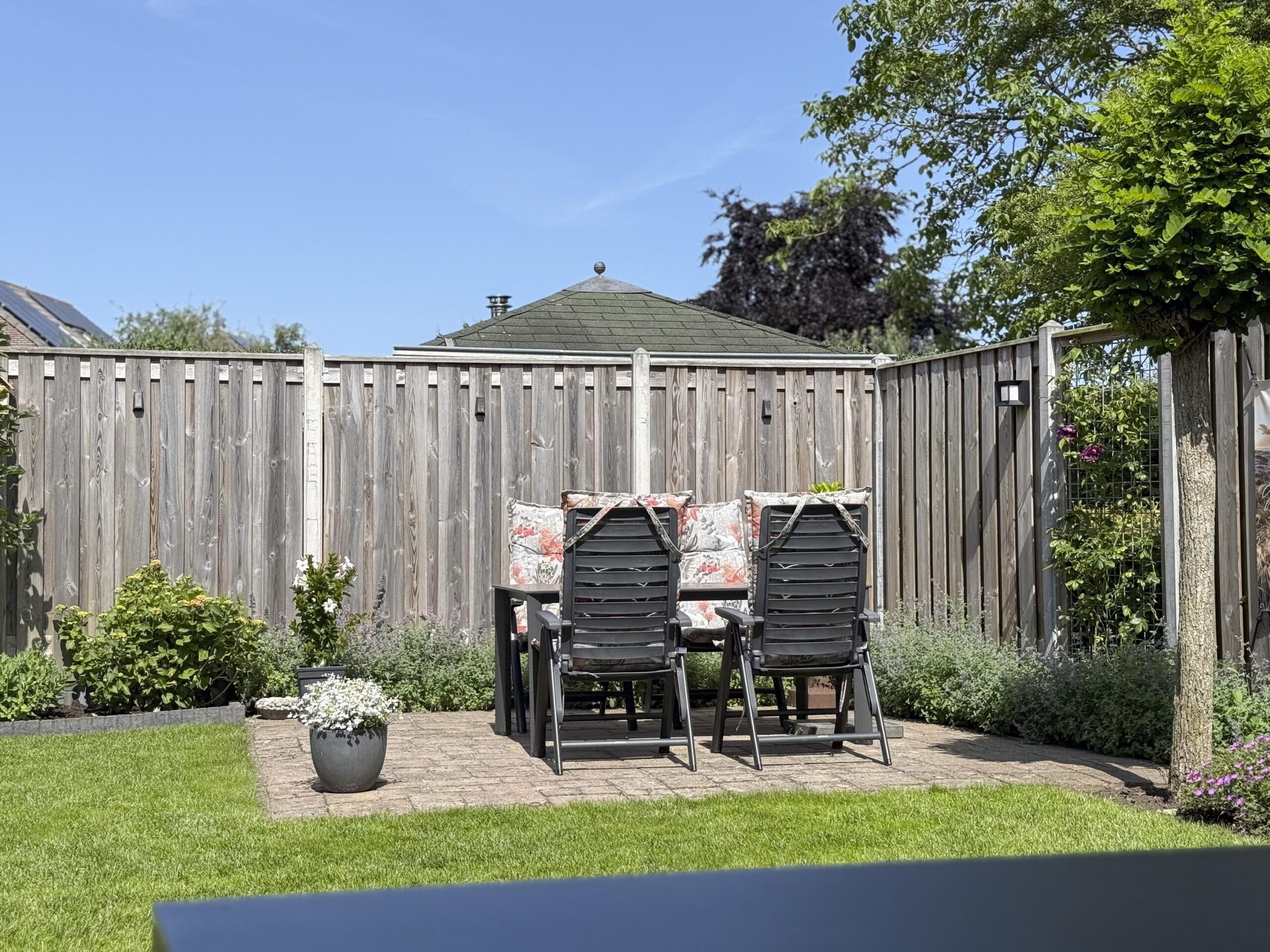 De verzorgde en zonnige achtertuin is gelegen op het zuidoosten en heeft een extra brede opzet, waardoor er volop ruimte is voor zowel een gezellig terras als een speelgedeelte. De tuin is fraai aangelegd met een combinatie van een gazon, borders en een terras. Bovendien is er een sfeervolle veranda geplaatst, waardoor je hier het hele jaar door comfortabel buiten kunt zitten. De berging zorgt voor ruimte voor het opslaan van de tuinbenodigdheden.