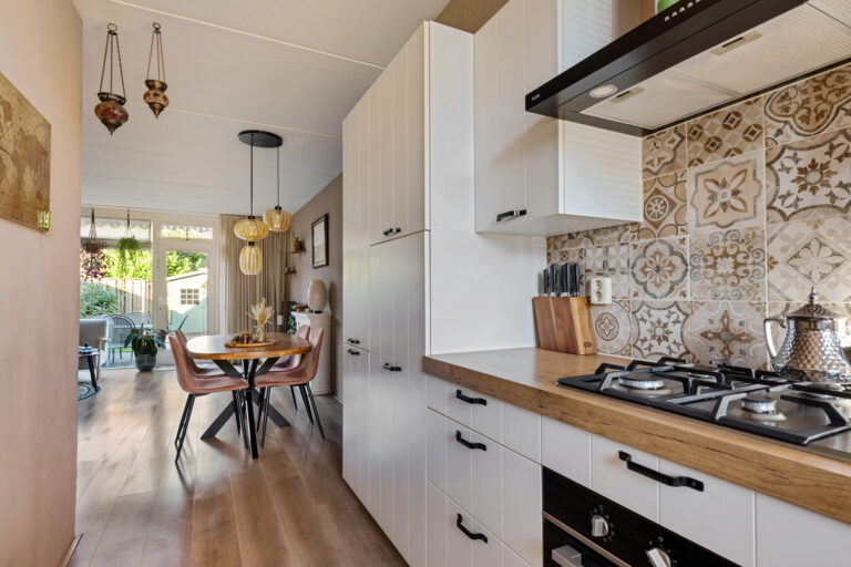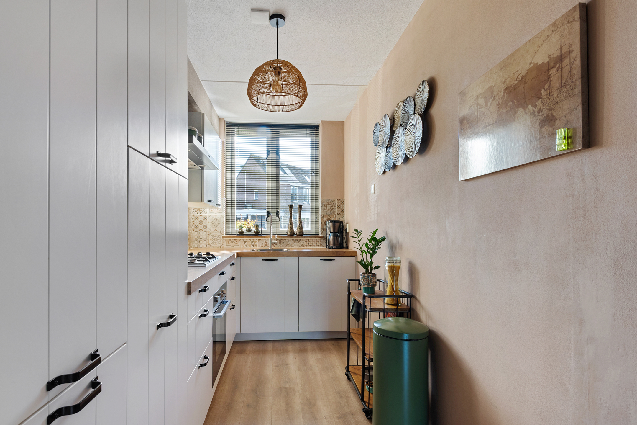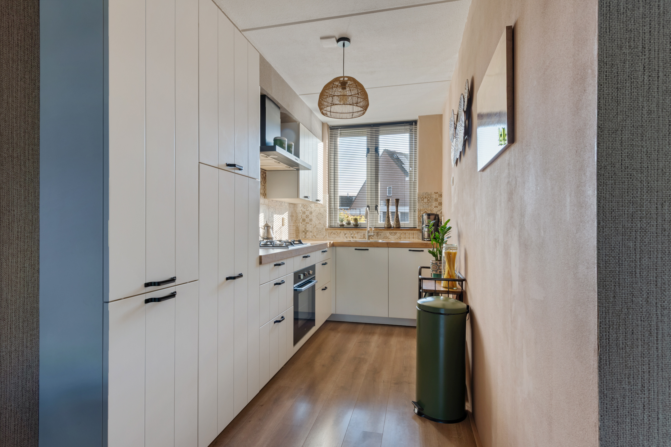 Je komt binnen in de hal met meterkast, toilet en trapopgang. De lichte woonkamer aan de tuinzijde voelt direct warm en huiselijk aan, met ruimte voor zowel een zit- als eethoek. Dankzij de grote raampartij valt er veel daglicht binnen en kijk je uit op de achtertuin. Extra opbergruimte vind je in de praktische trapkast. Aan de voorzijde bevindt zich de moderne open keuken (2021), compleet met onder andere een combi-oven, vaatwasser en koelkast. Een fijne plek om uitgebreid te koken of snel een maaltijd te bereiden.