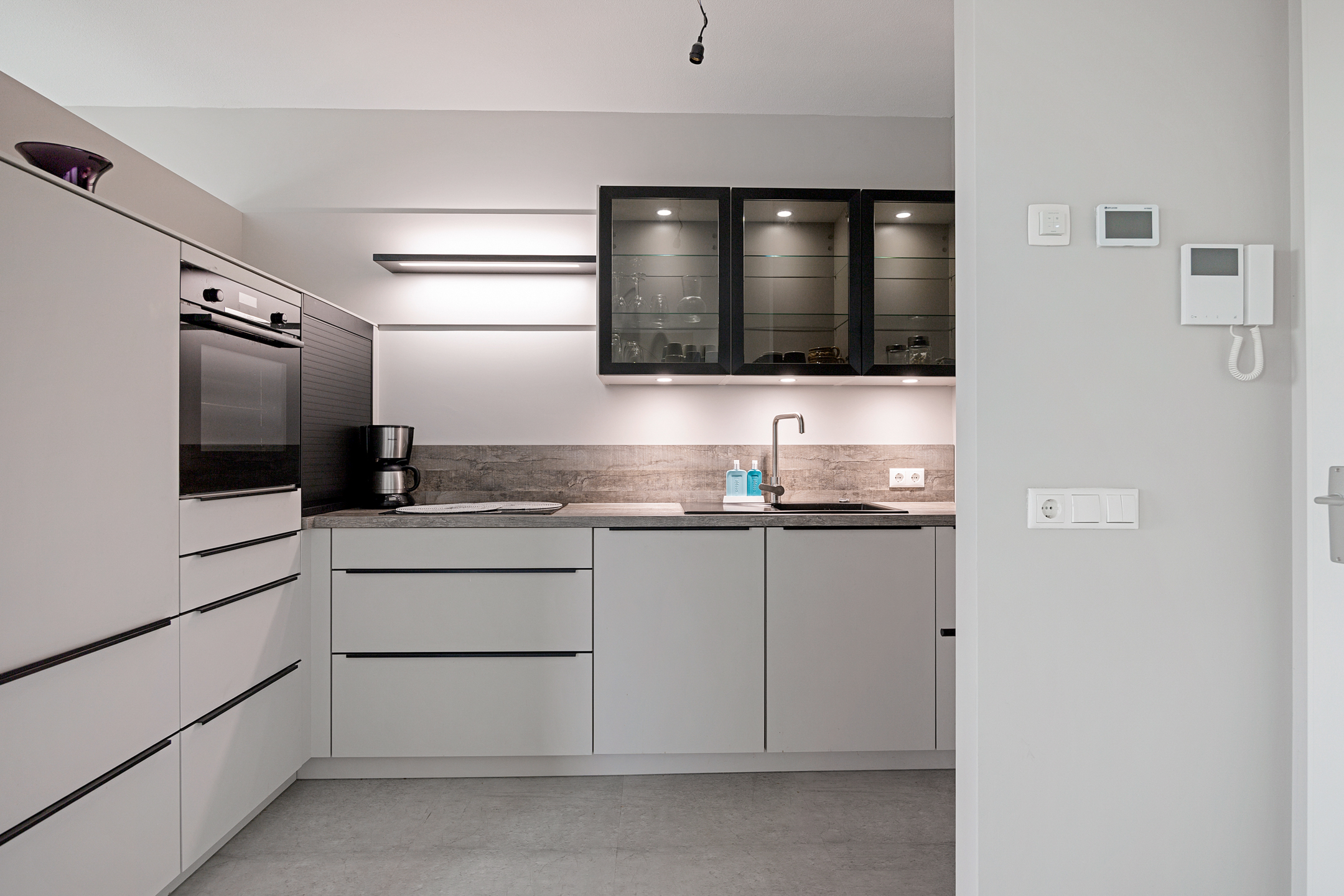 De half open keuken sluit naadloos aan op de woonkamer en is uitgevoerd in een moderne, neutrale kleurstelling. De keuken is voorzien van hoogwaardige inbouwapparatuur, waaronder een oven, kookplaat, afzuigkap en vaatwasser. De praktische opstelling biedt veel kastruimte en werkoppervlak. De strakke lijnen en verlichting onder de bovenkasten geven de keuken een luxe uitstraling.