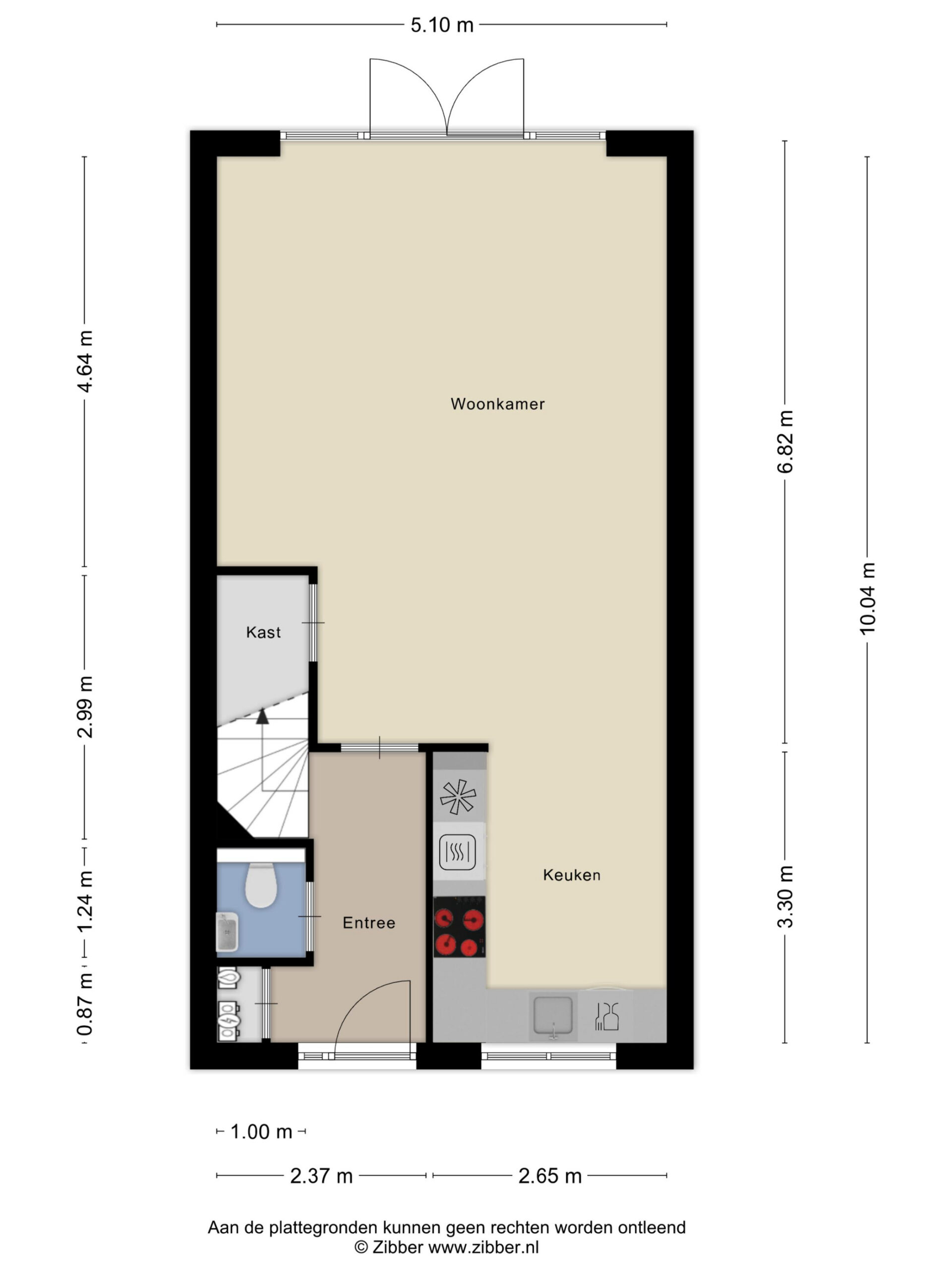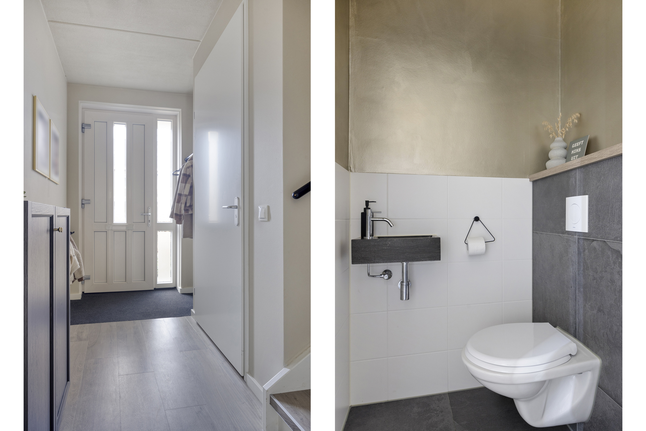 Entree, hal, toilet, keuken, woonkamer.