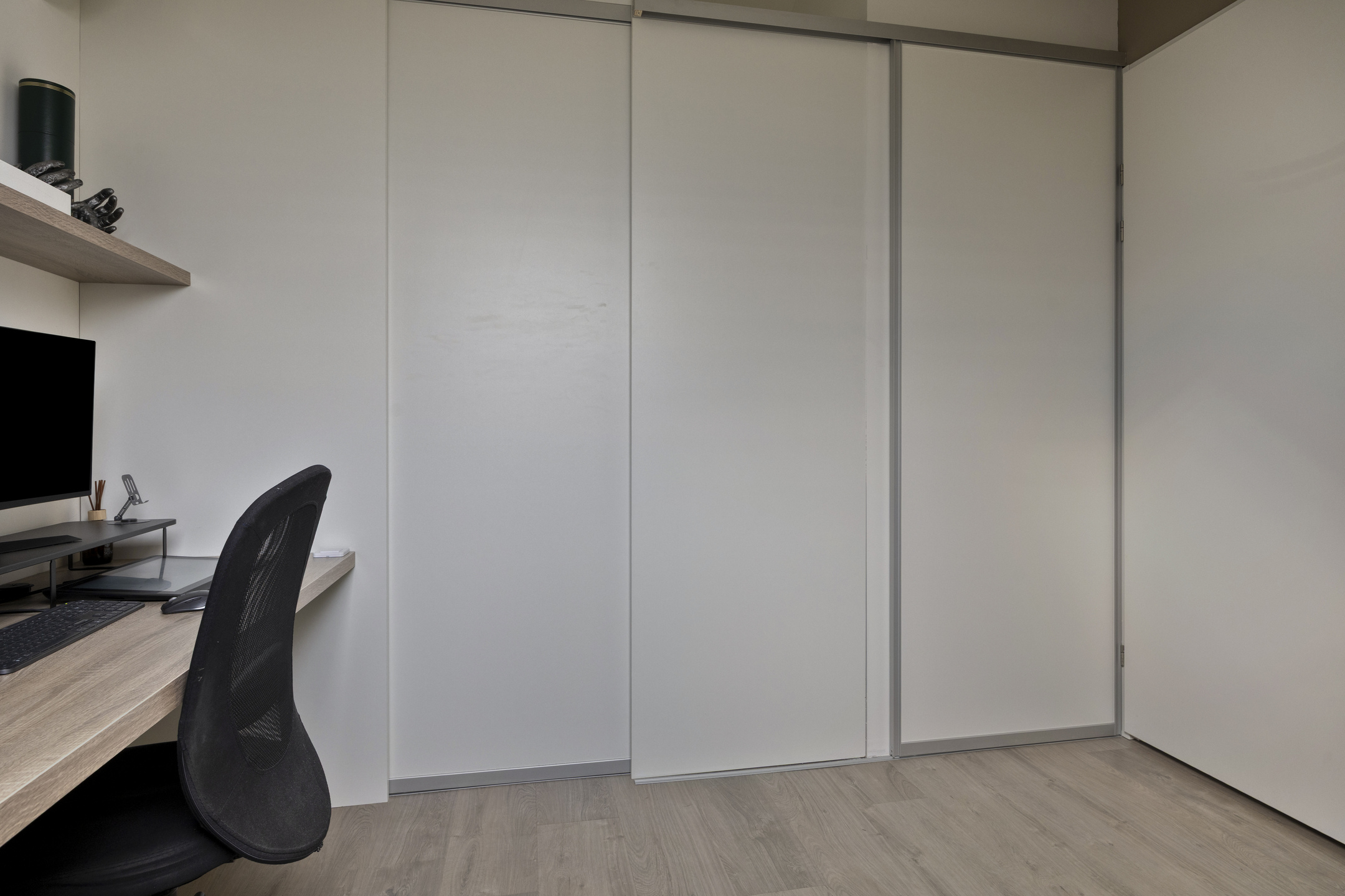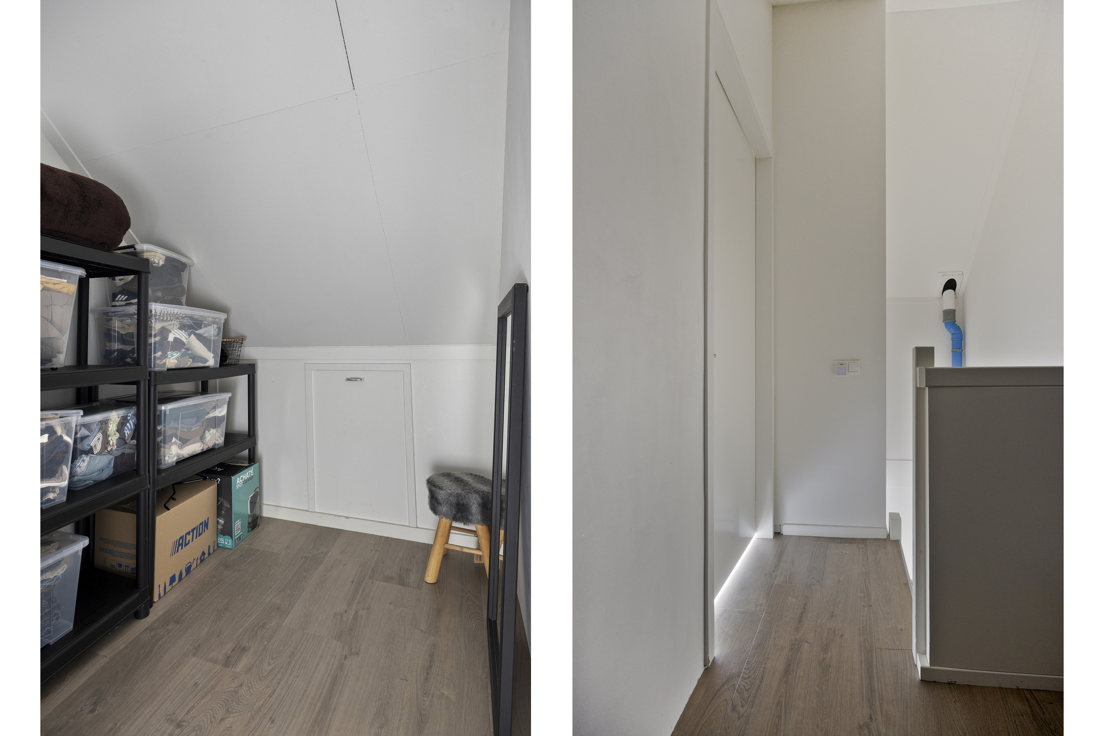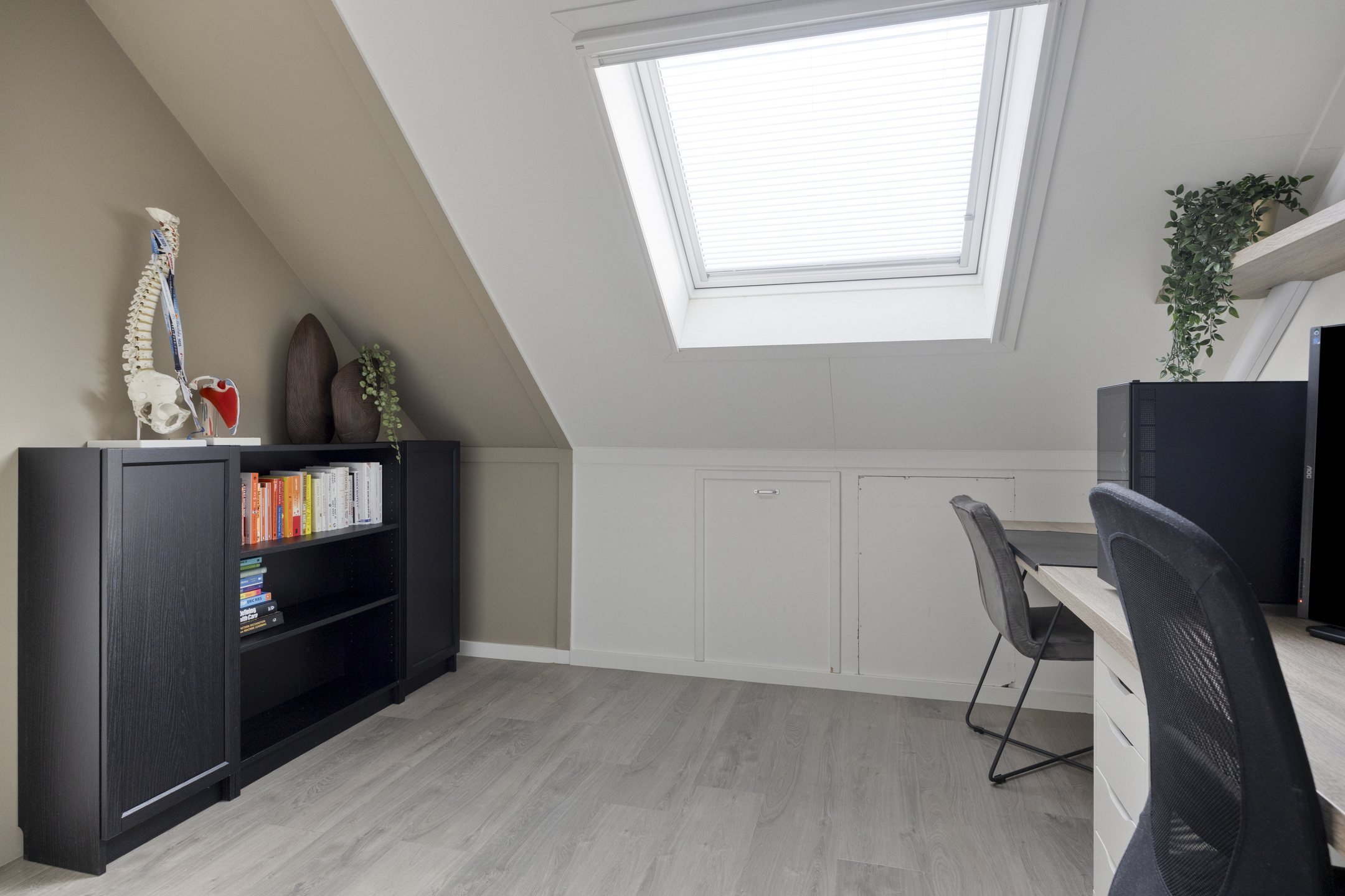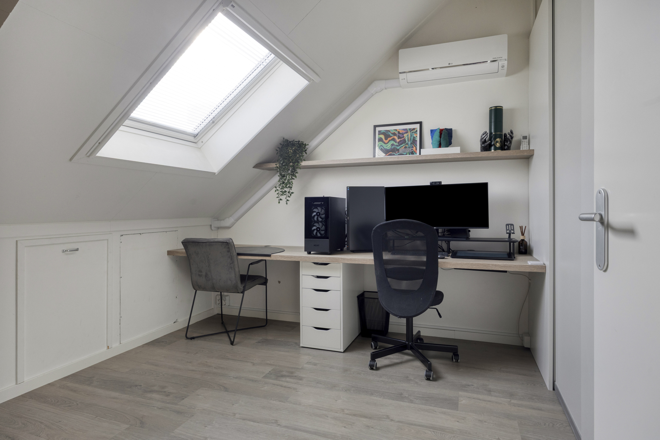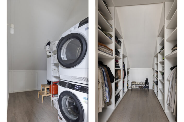 De zolderverdieping is slim ingedeeld en multifunctioneel in te richten. De kamer, voorzien van airconditioning, wordt nu gebruikt als werkkamer, maar is ook makkelijk in te richten als slaapkamer. Aan de kamer grenst een ruime inloopkast. Op de overloop is een aparte ruimte gecreëerd voor de wasmachine, droger en cv-ketel.