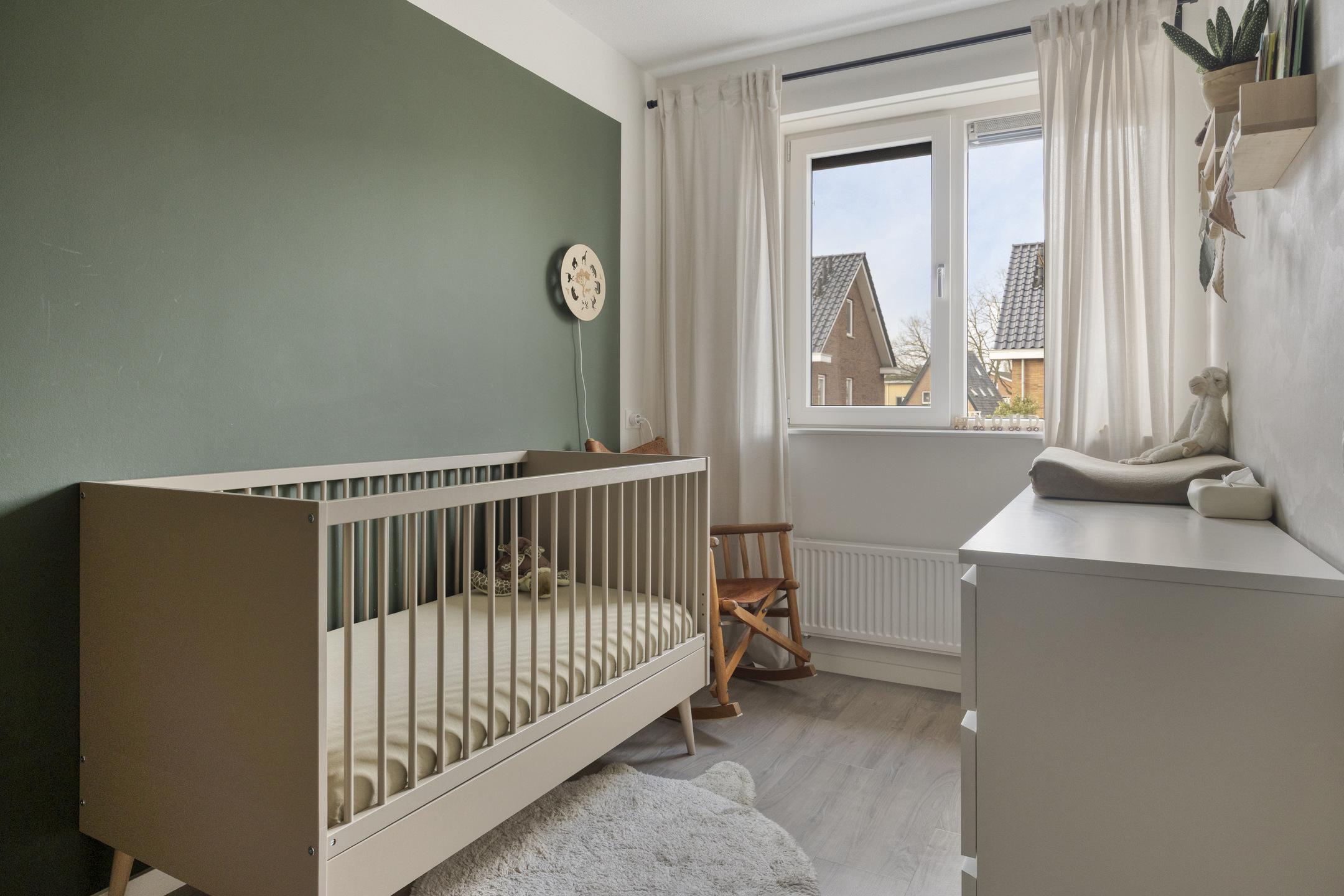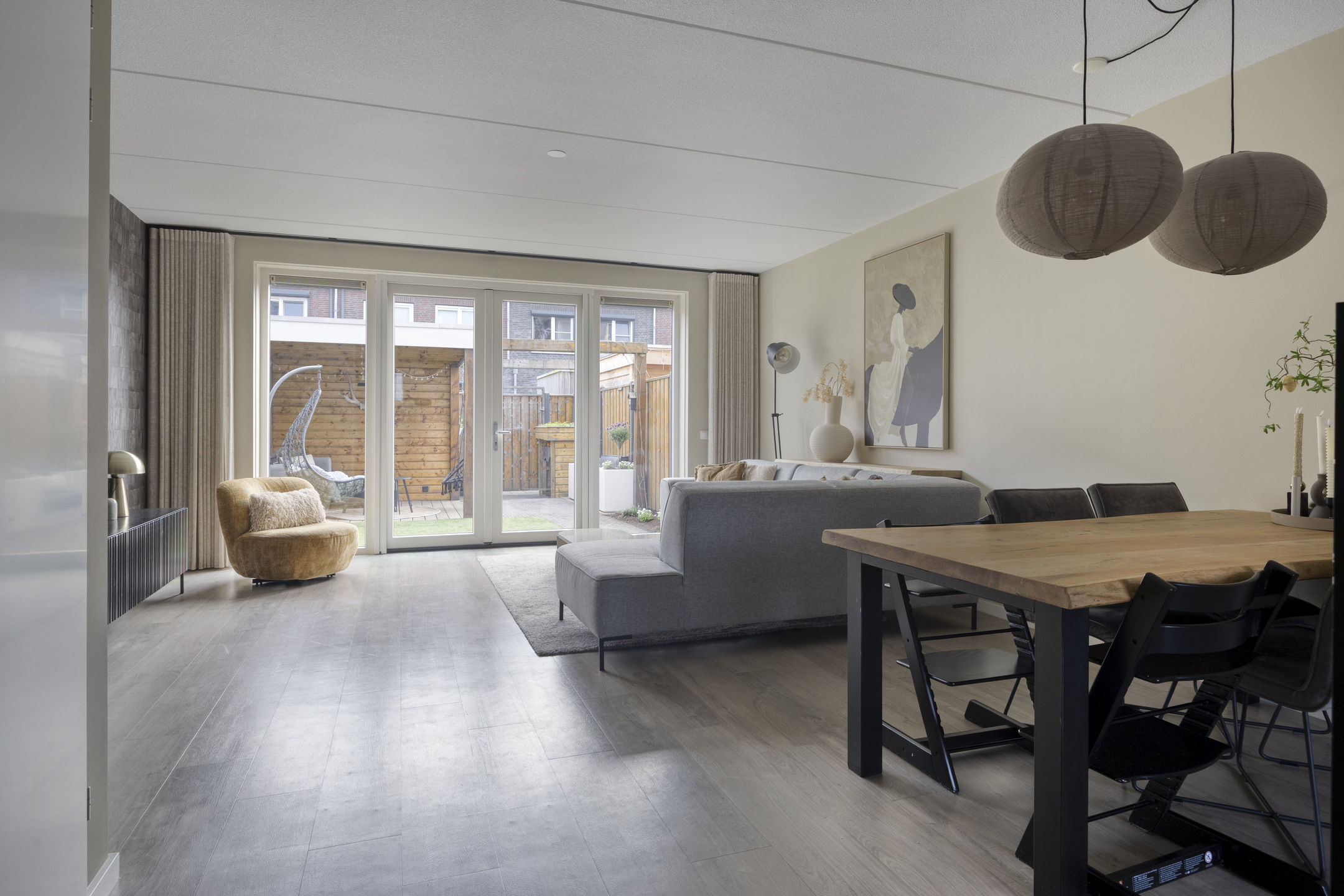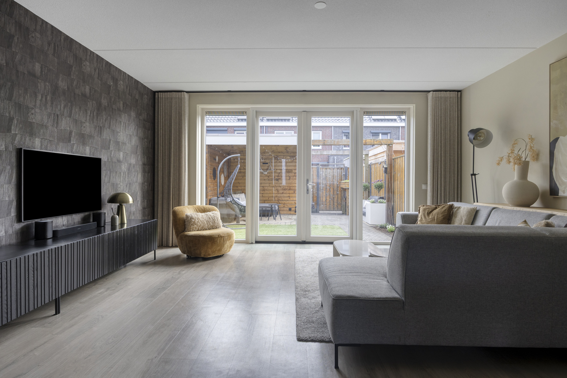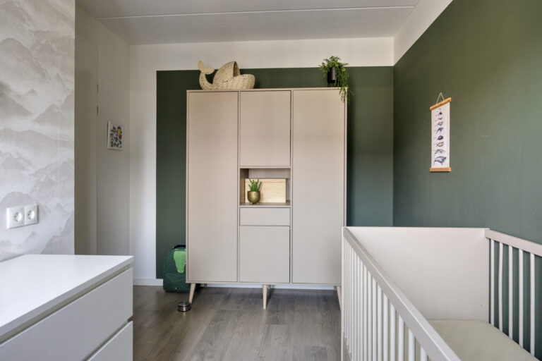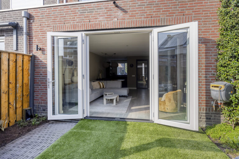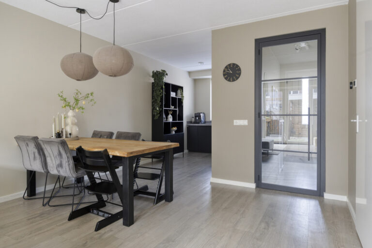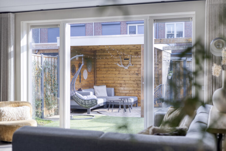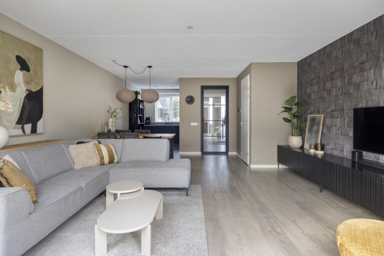 Via de entree bereik je de hal met toilet. De woonkamer is tuingericht en door de uitbouw heerlijk ruim. De openslaande tuindeuren zorgen voor een comfortabele leefruimte, een open verbinding met de tuin én extra lichtinval.