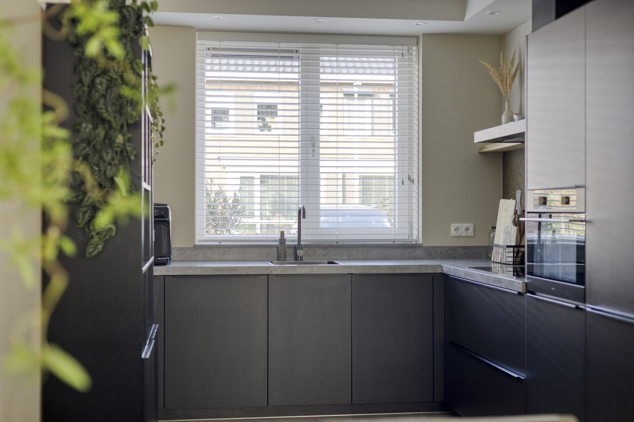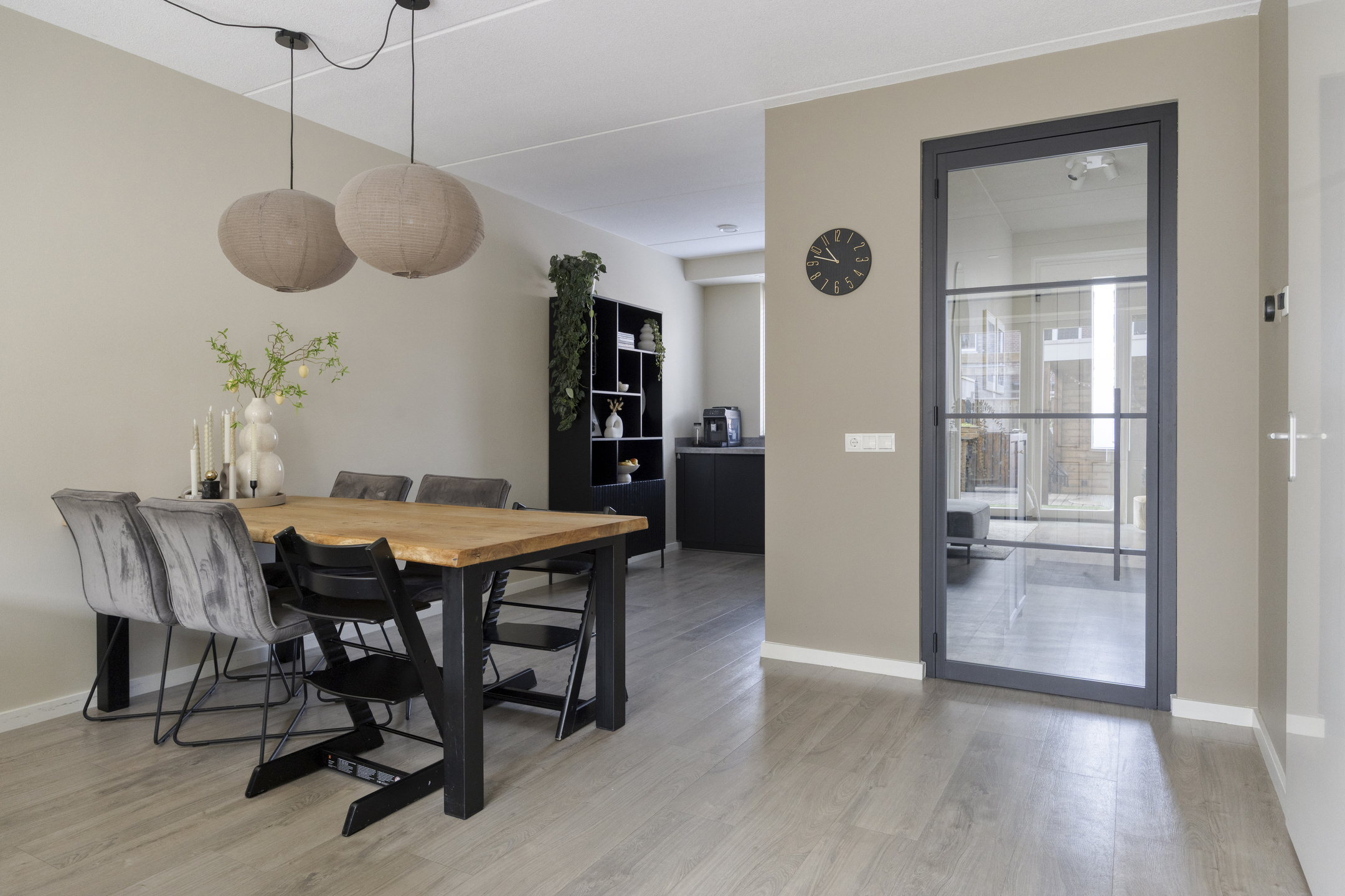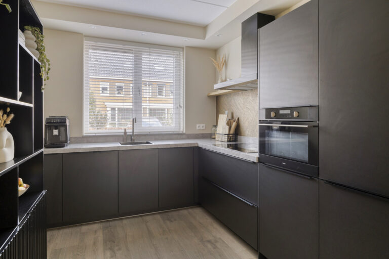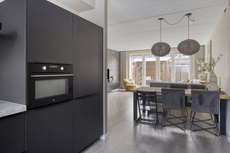 De open keuken is uitgerust met een inductie kookplaat, afzuigkap, koel-vriescombinatie, combi-oven/magnetron en vaatwasser. De gehele begane grond is fraai afgewerkt met strakke wanden en een PVC-vloer. Ook de trappen en overige verdiepingen zijn voorzien van een moderne PVC-vloer. De gehele begane grond wordt verwarmd middels vloerverwarming.