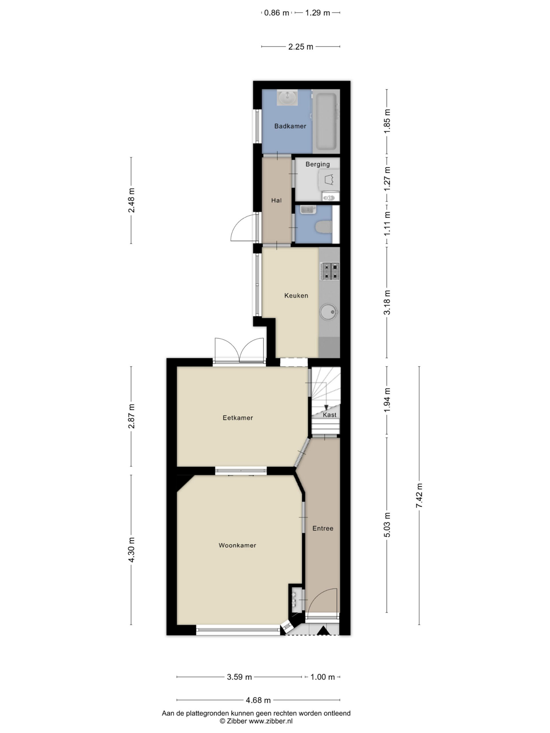 Entree, hal, vanuit de hal zijn de eet- en woonkamer bereikbaar, trapkast, half open keuken, toilet, CV- en wasruimte en de badkamer. De badkamer is voorzien van een ligbad met douche en wastafelmeubel.