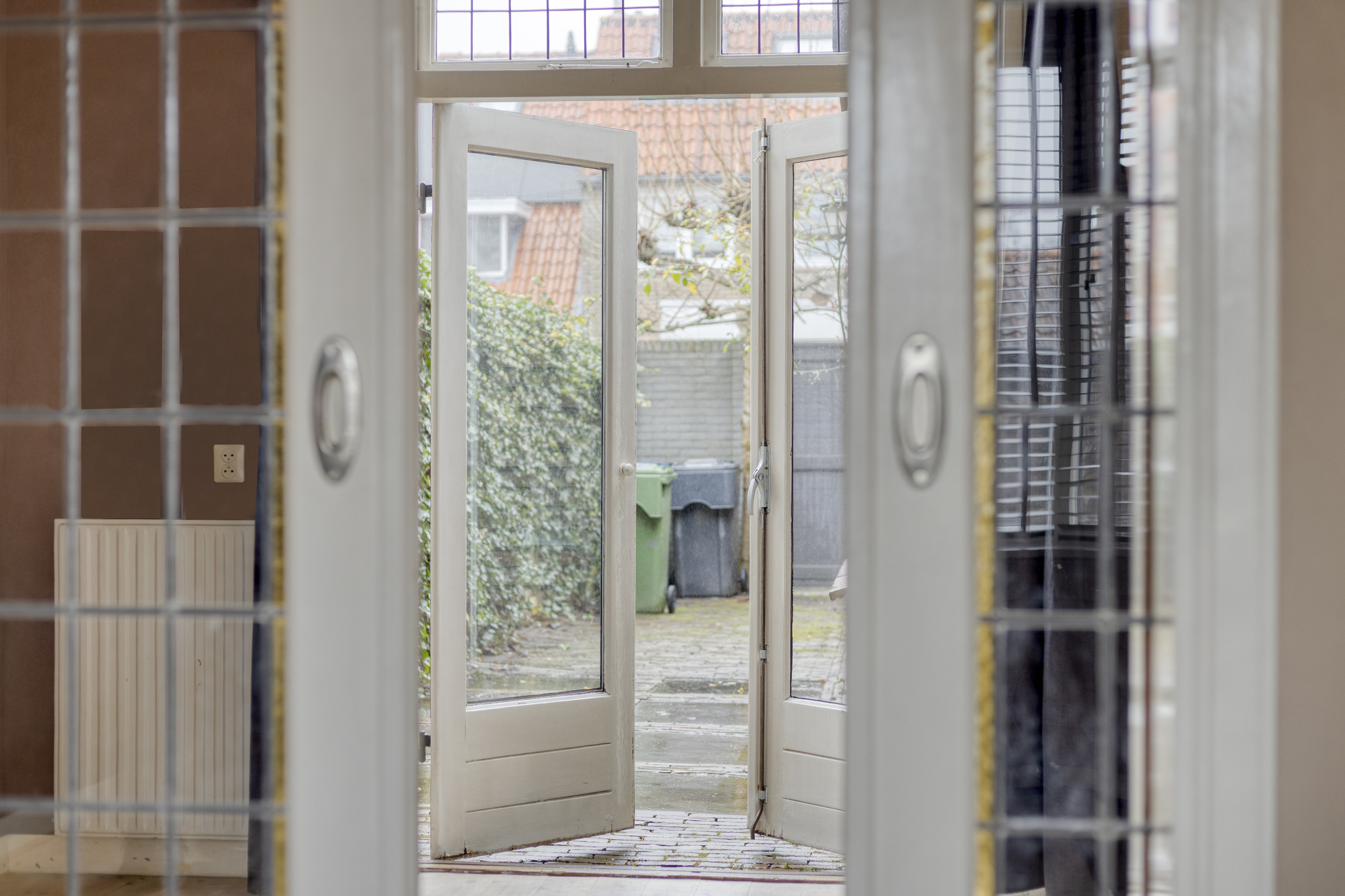 Bij binnenkomst valt direct de authentieke uitstraling op, met onder andere de originele granitovloer in de hal. De woonkamer en eetkamer zijn van elkaar gescheiden door en suite deuren, wat zorgt voor een karakteristieke en sfeervolle indeling. Vanuit de eetkamer geven openslaande deuren toegang tot de achtertuin.