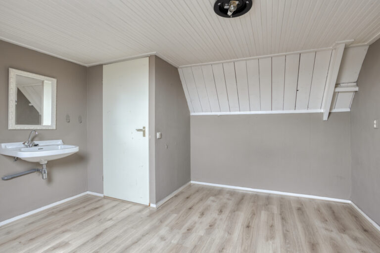 Overloop, slaapkamer met wastafel en vaste kast en bergruimte achter de knieschotten.