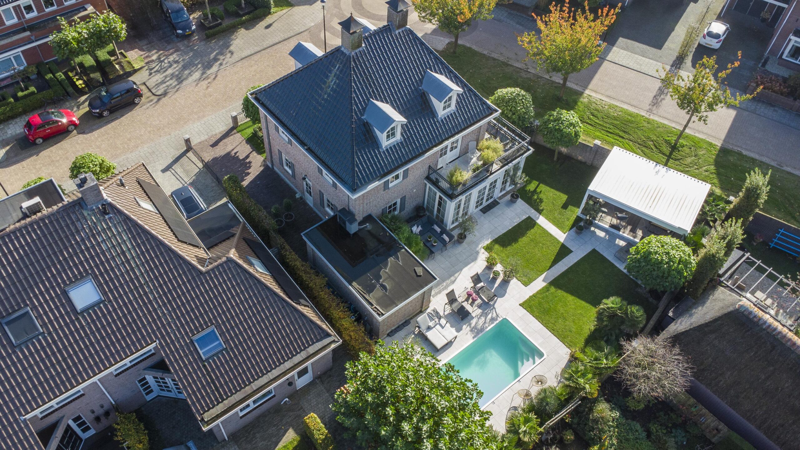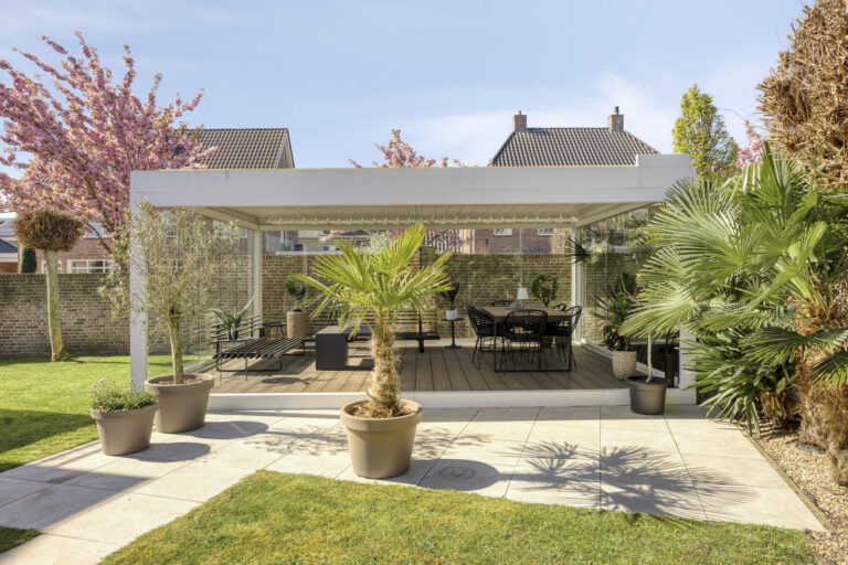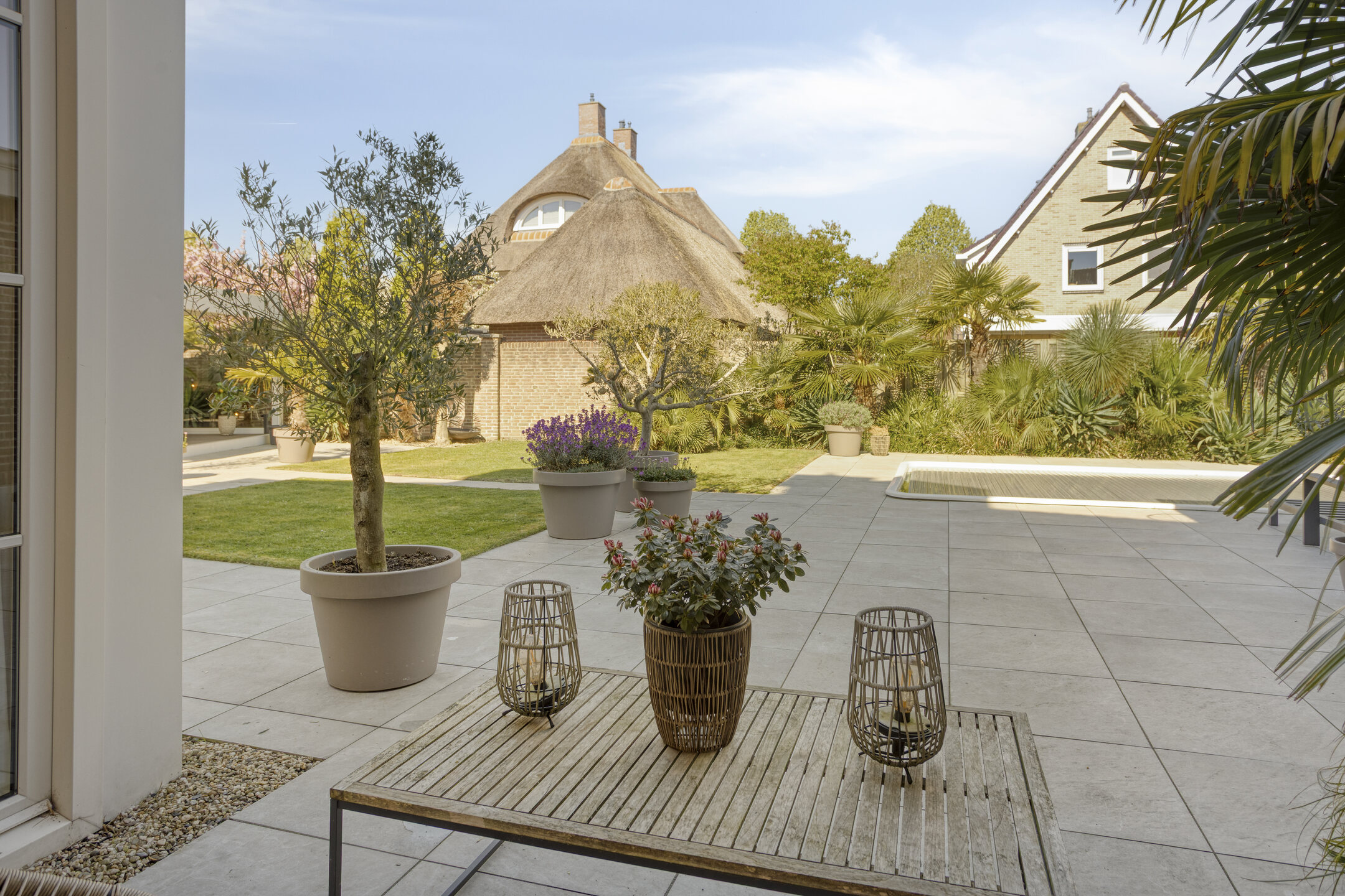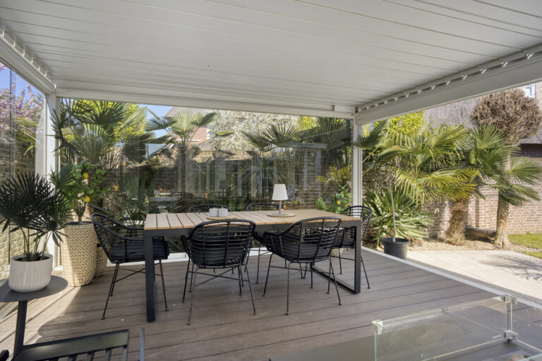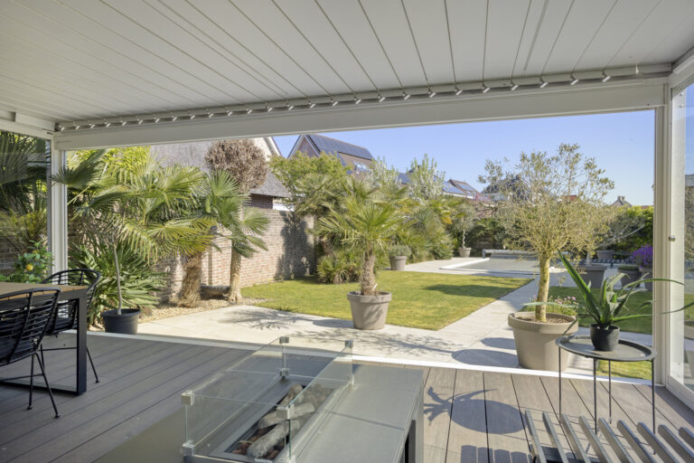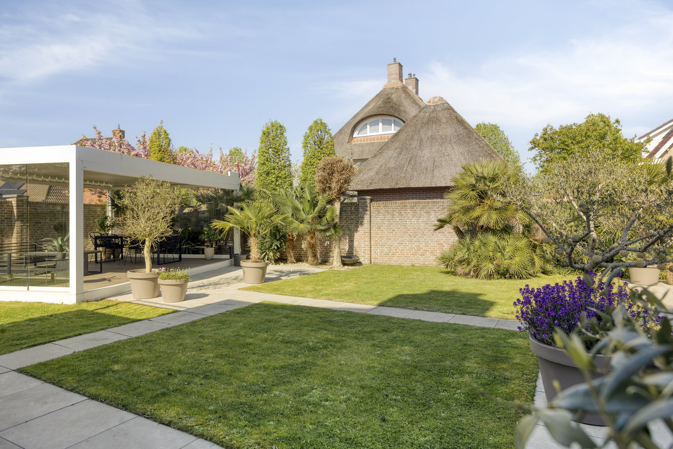 En dan de tuin… alsof je op vakantie bent in je eigen achtertuin. Denk aan: een groot verwarmd zwembad, een zonneterras met ligstoelen, meerdere zitjes en een moderne overkapping aan de zijkant van de tuin. Deze heeft glazen schuifpanelen, waardoor je beschut zit ook bij wind en regen, waardoor je van het vroege voorjaar tot diep in het najaar buiten kunt genieten. De overkapping is voorzien van verlichting en stroompunten, waardoor het ook ’s avonds een sfeervolle plek is.