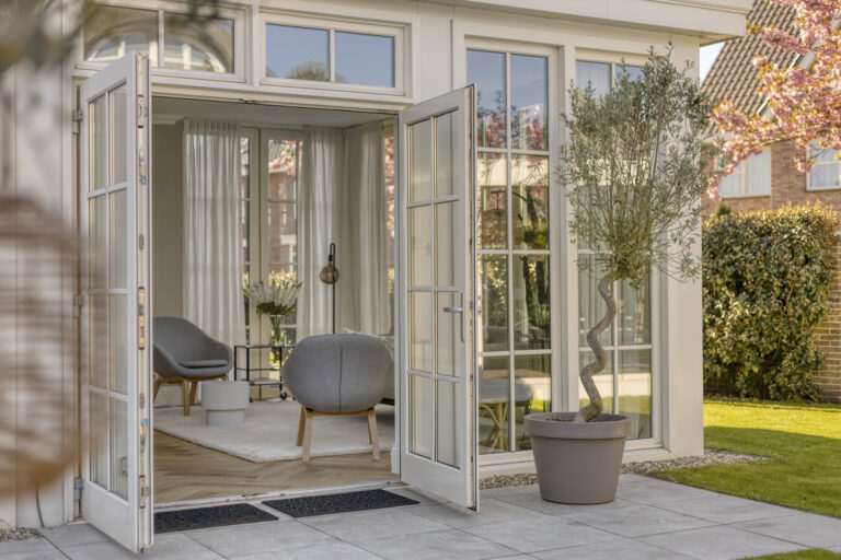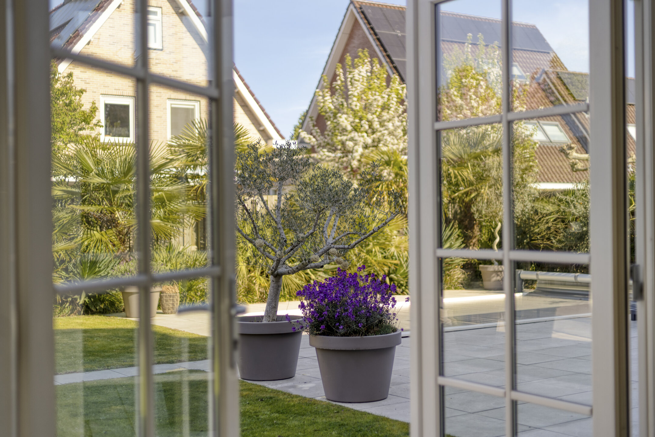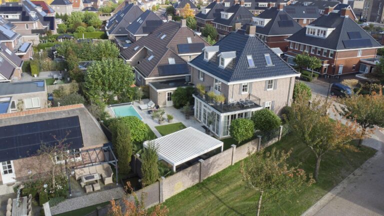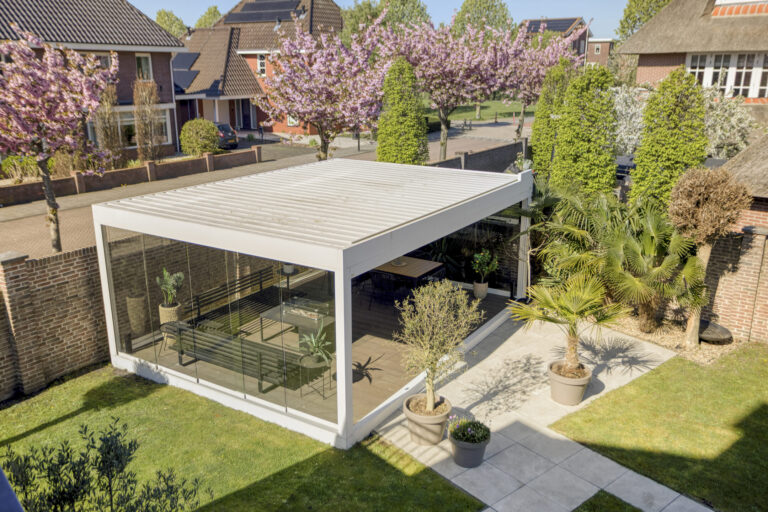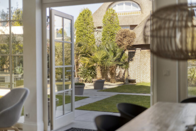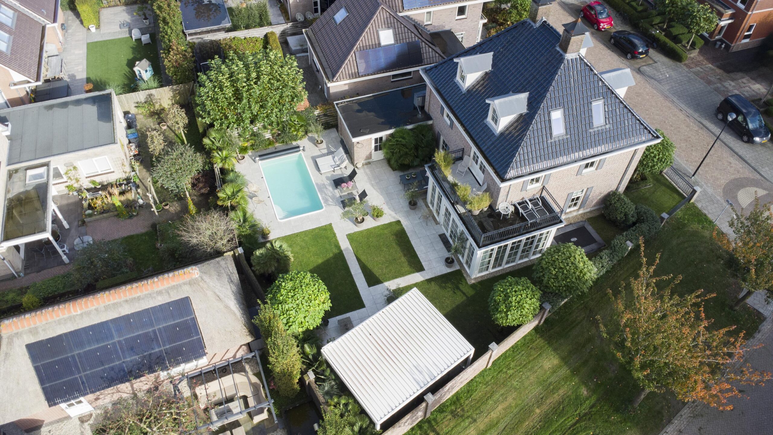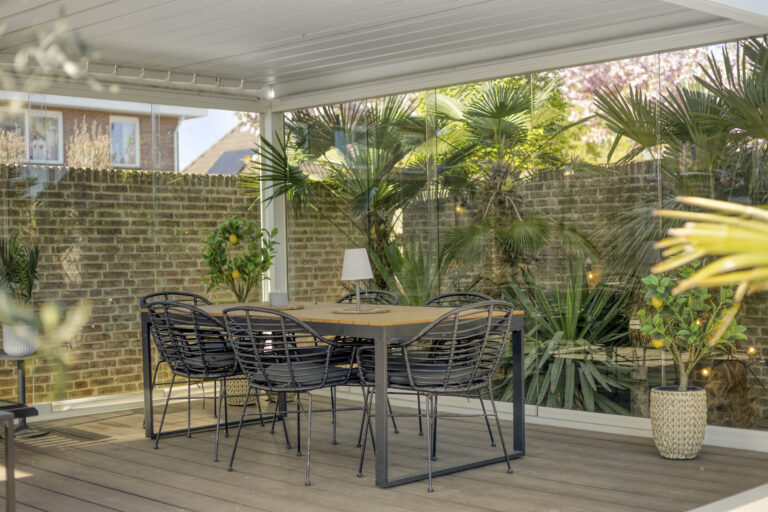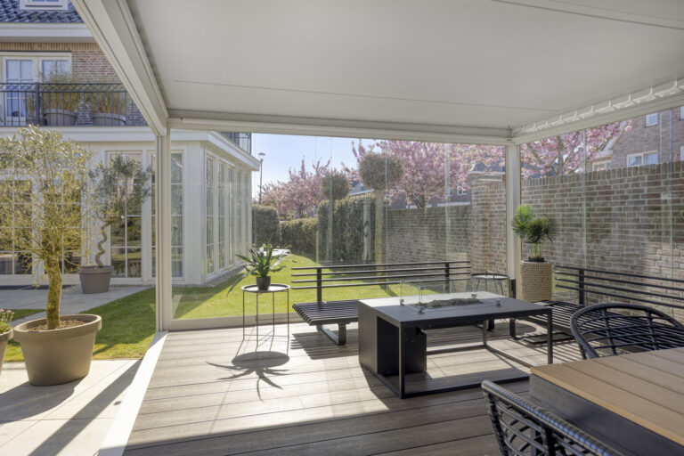En dan de tuin… alsof je op vakantie bent in je eigen achtertuin. Denk aan: een groot verwarmd zwembad, een zonneterras met ligstoelen, meerdere zitjes en een moderne overkapping aan de zijkant van de tuin. Deze heeft glazen schuifpanelen, waardoor je beschut zit ook bij wind en regen, waardoor je van het vroege voorjaar tot diep in het najaar buiten kunt genieten. De overkapping is voorzien van verlichting en stroompunten, waardoor het ook ’s avonds een sfeervolle plek is.