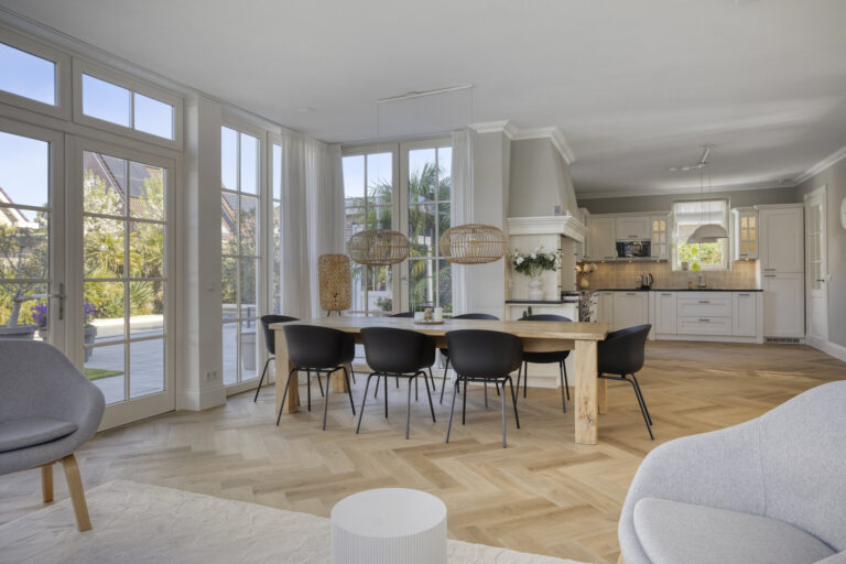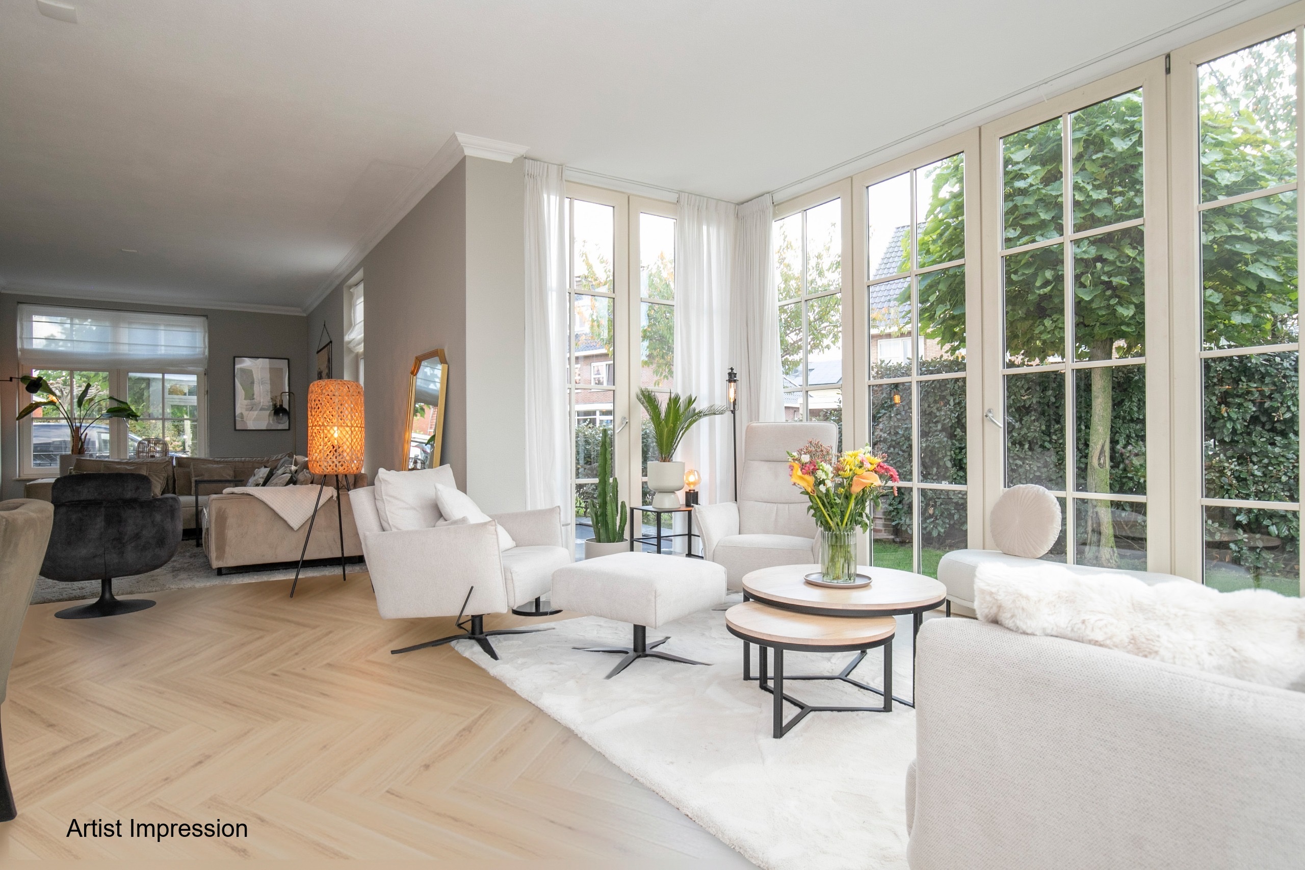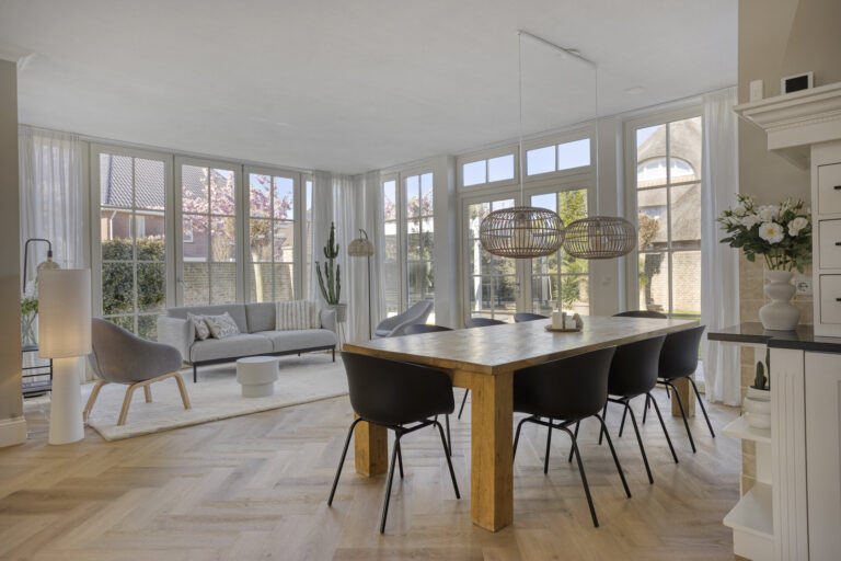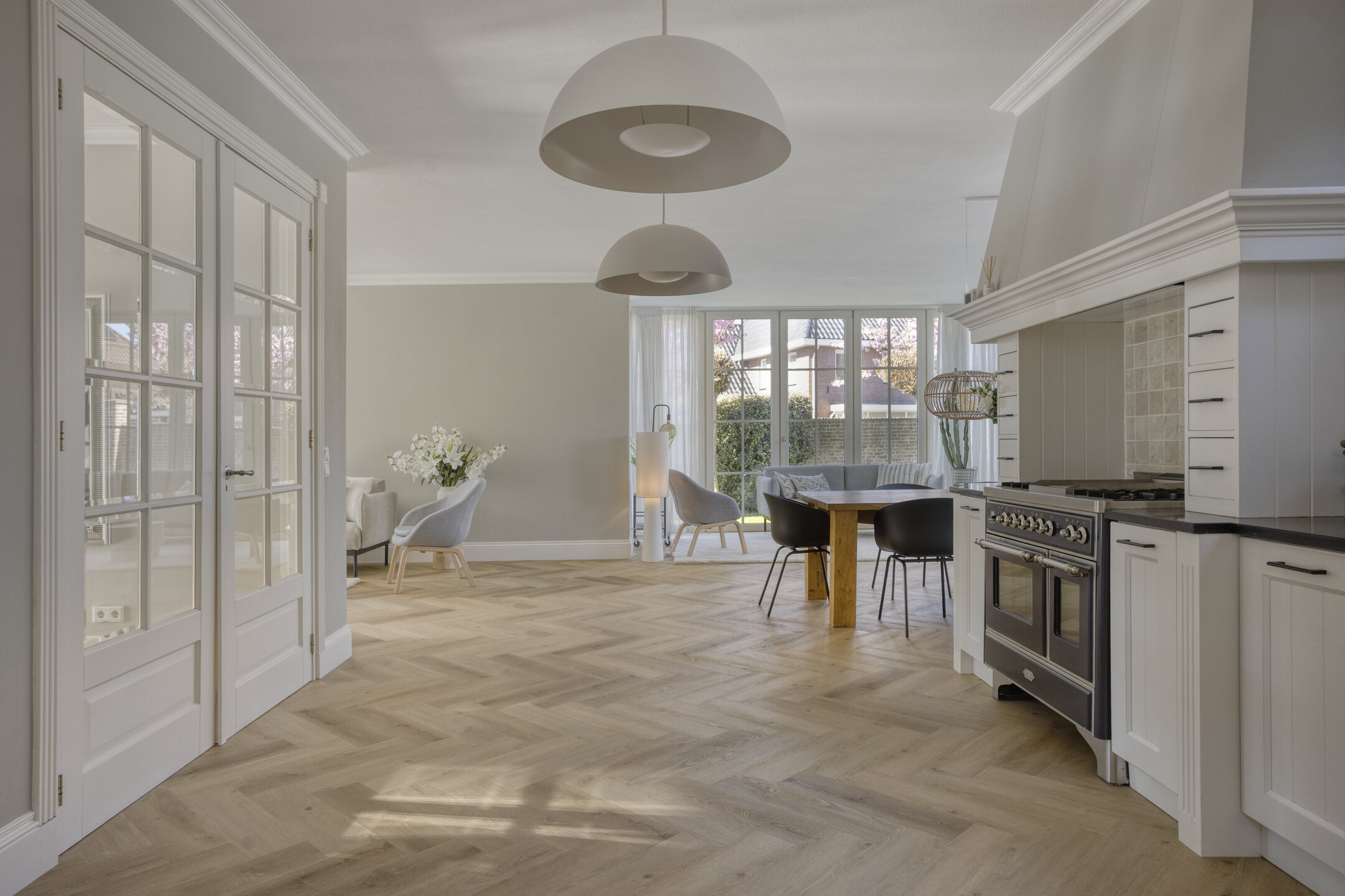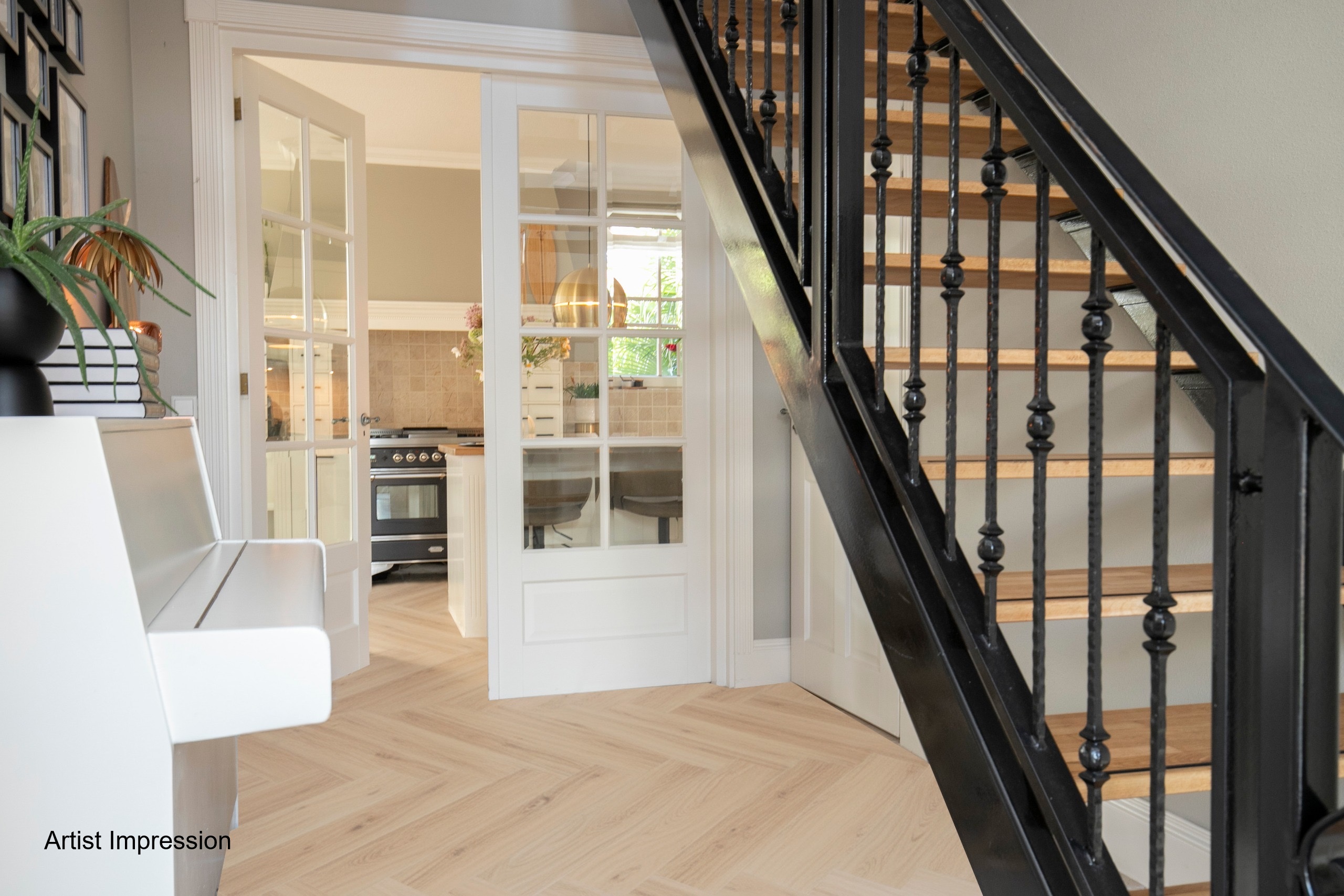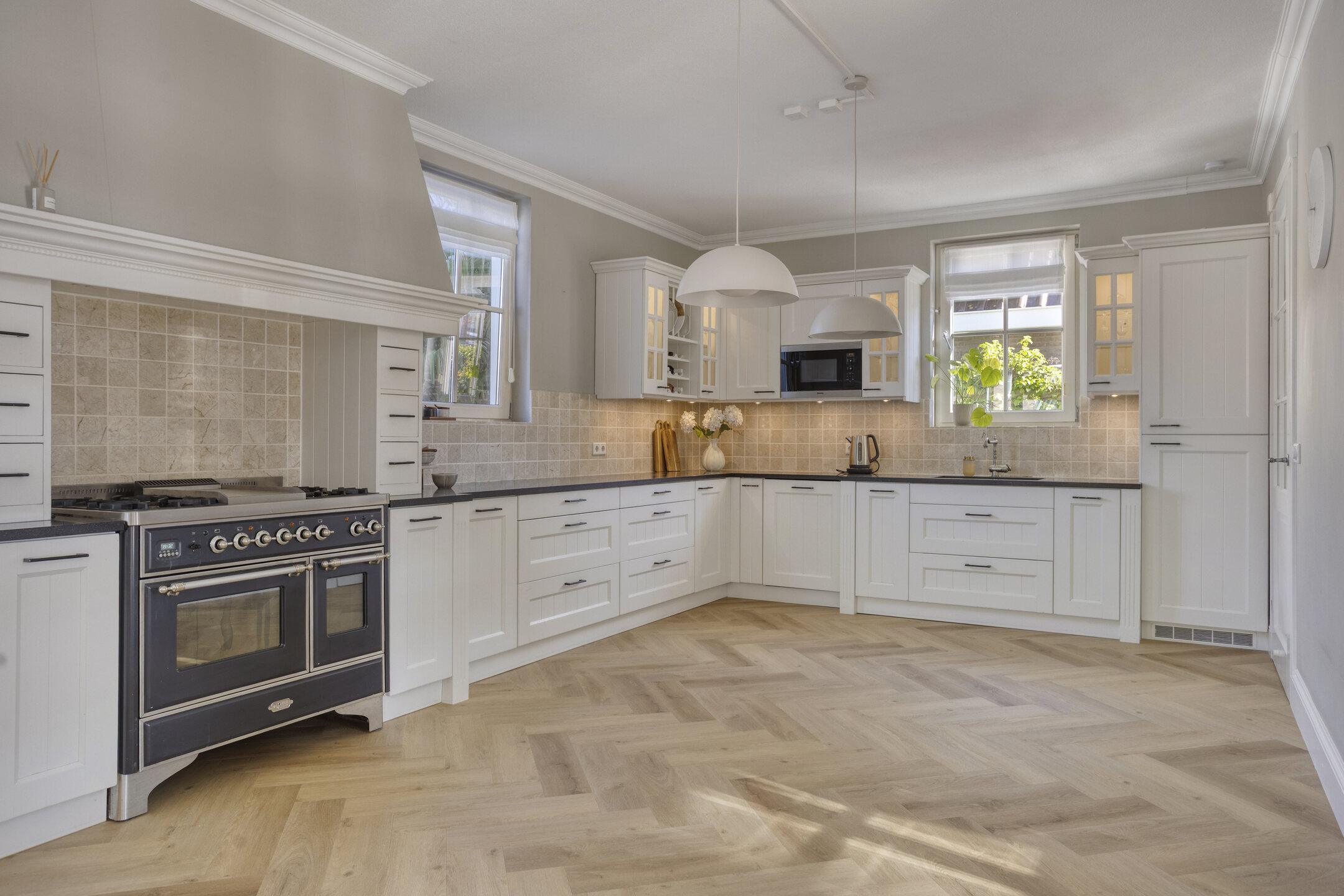 De ruime woonkeuken vormt het kloppend hart van het huis. Met hoogwaardige inbouwapparatuur, een royaal eiland met bar en volop werkruimte, is dit de ideale plek om samen te koken, borrelen of gewoon lekker te zitten. Aangrenzend vind je de woonkamer, waar openslaande deuren toegang geven tot de sfeervolle tuin.