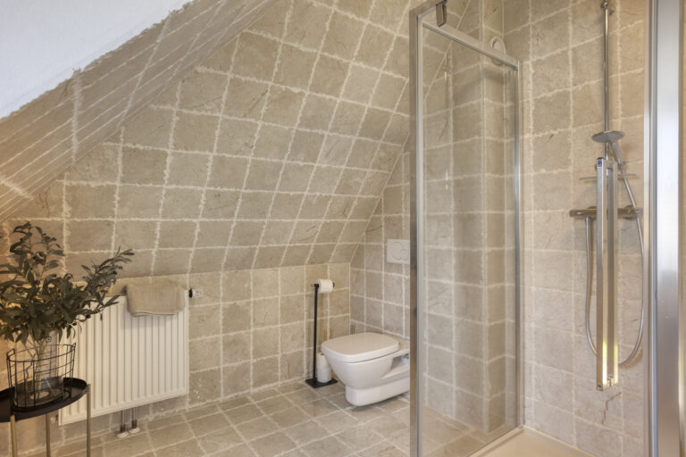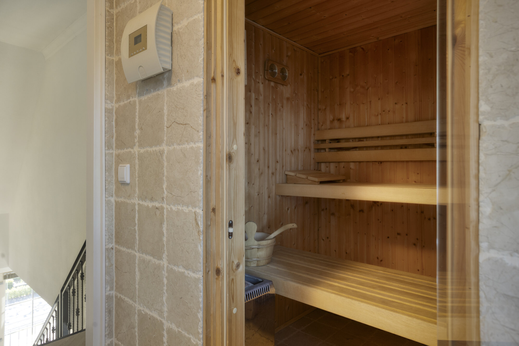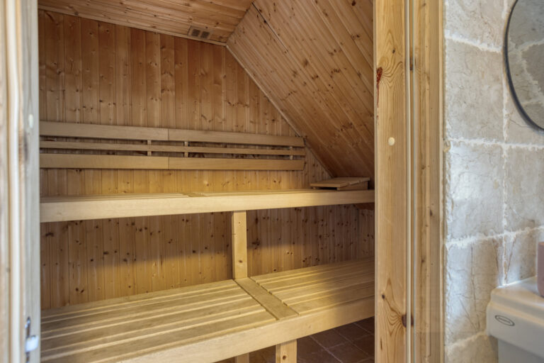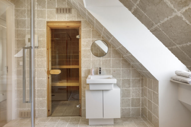 Drie royale slaapkamers, tweede badkamer met douche, toilet, wastafel en ingebouwde sauna voor optimaal comfort.
