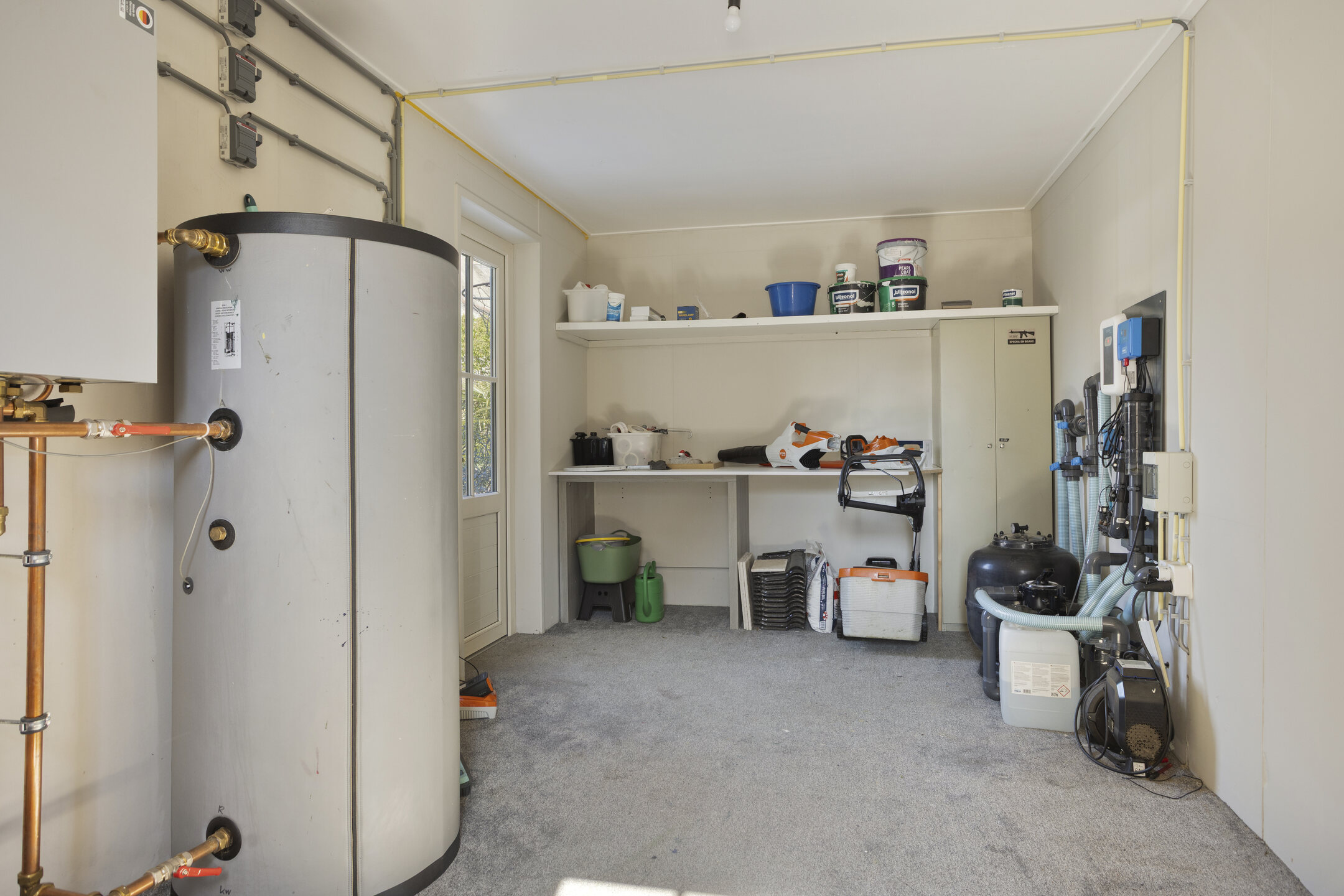De tuin is voorzien van een groot terras rondom het verwarmde zwembad, diverse zitjes, een moderne overkapping met glazen schuifpanelen en ingebouwde verlichting. De ruime berging is vanaf de tuin en de oprit te betreden.