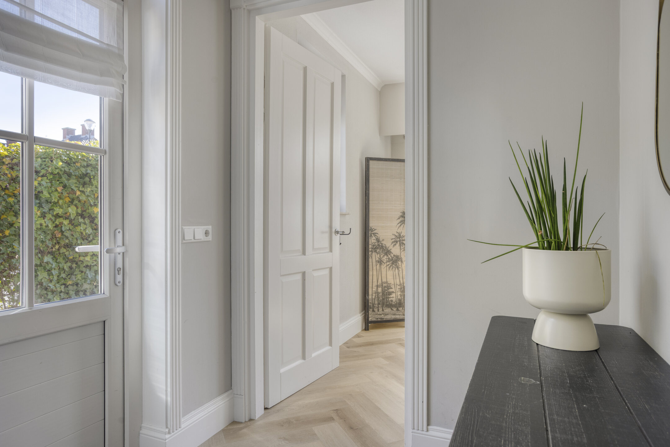 Entree, ruime hal met trapopgang, garderobe en toilet. Luxe woonkeuken, royale woonkamer met openslaande deuren naar de tuin, bijkeuken met extra kastruimte en witgoedaansluitingen.