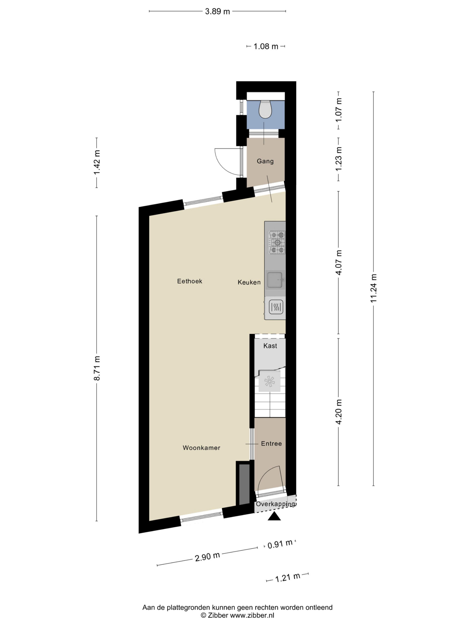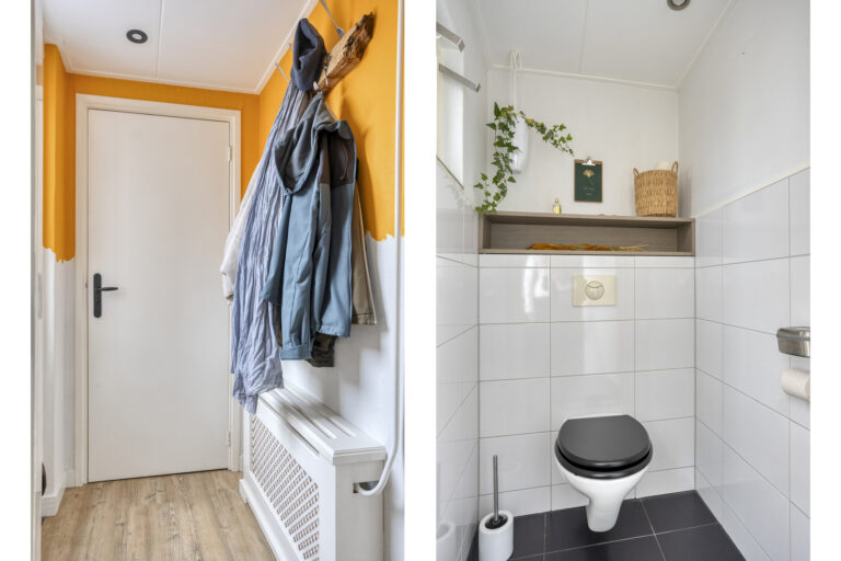 Entree, hal, woonkamer, eetkamer, keuken, hal, toilet.