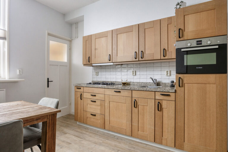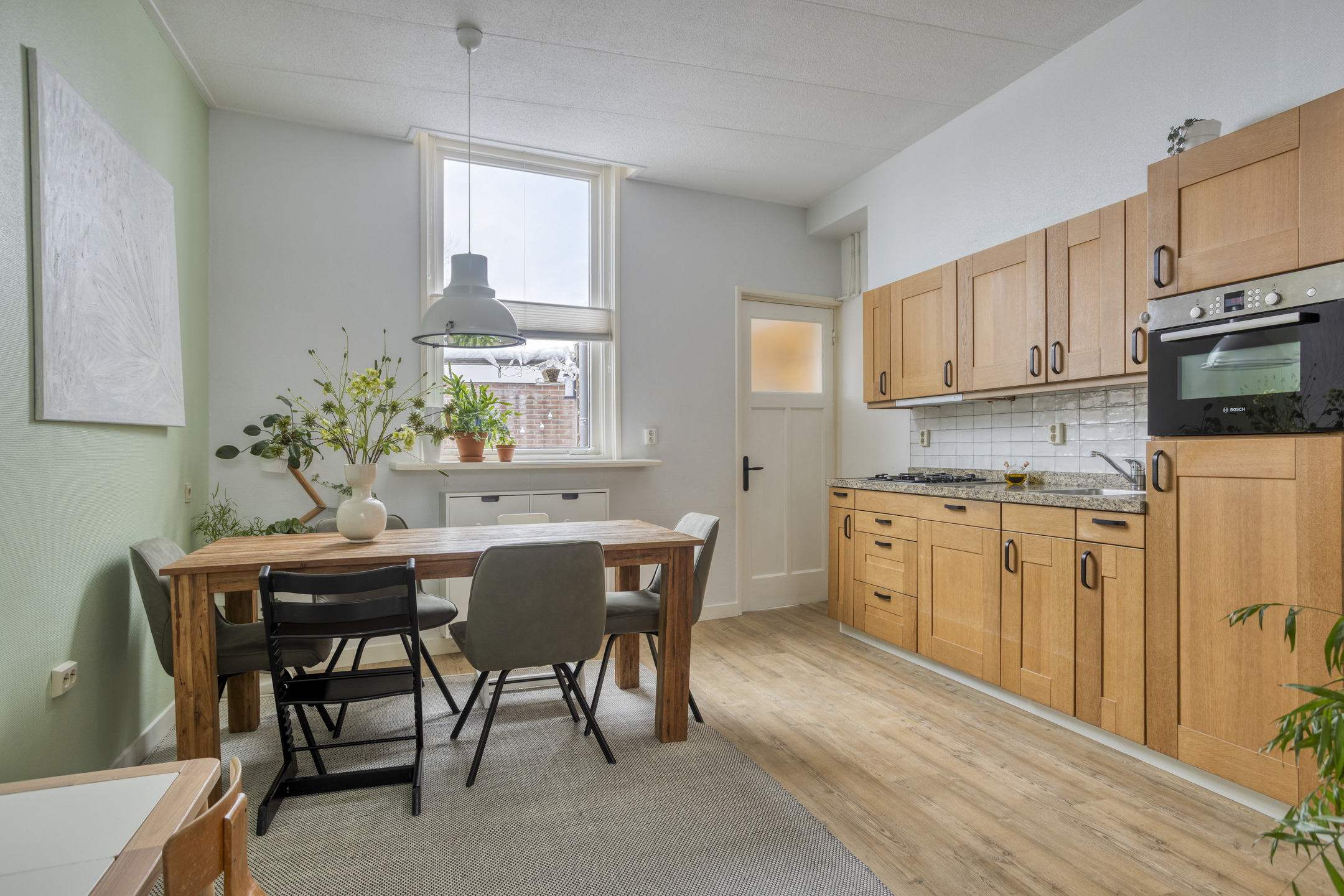 De eetkamer is tuingericht en heeft een gezellige verbinding met de open keuken. De moderne keuken is voorzien van een gaskookplaat, afzuigkap, vaatwasser, koelkast en combi-oven/magnetron. De vriezer staat in de trapkast. Achter de keuken is een klein portaaltje met het toilet te vinden.