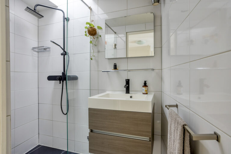 Op de eerste verdieping beschikt de woning over 3 slaapkamers en badkamer. Door de dakkapel is de slaapkamer aan de achterzijde extra ruim. Op de overloop is tevens plaats gemaakt voor de wasmachine. De badkamer is ingericht met een inloopdouche en wastafel.