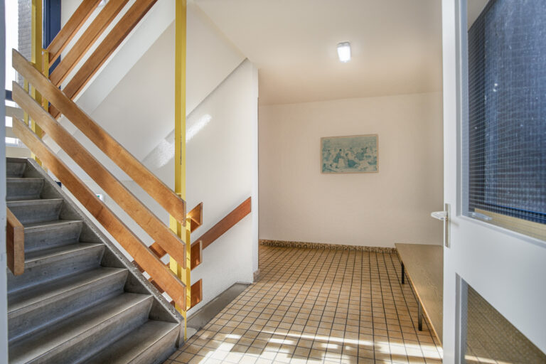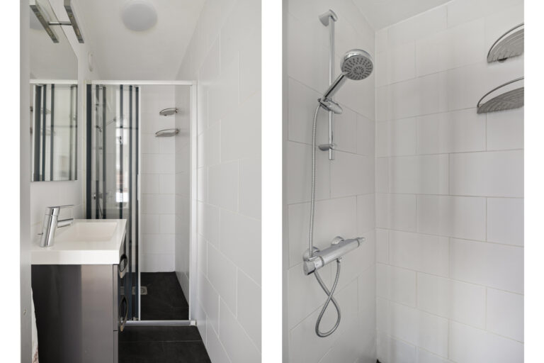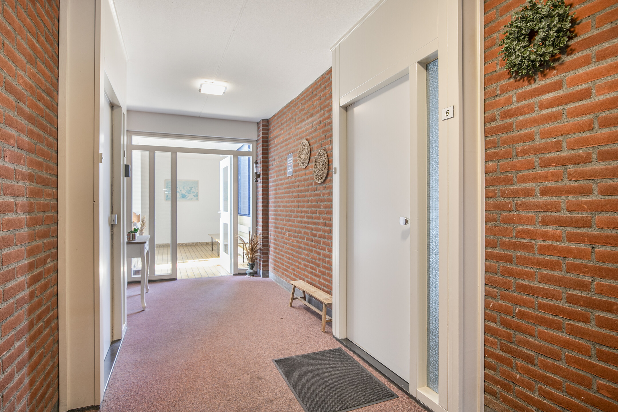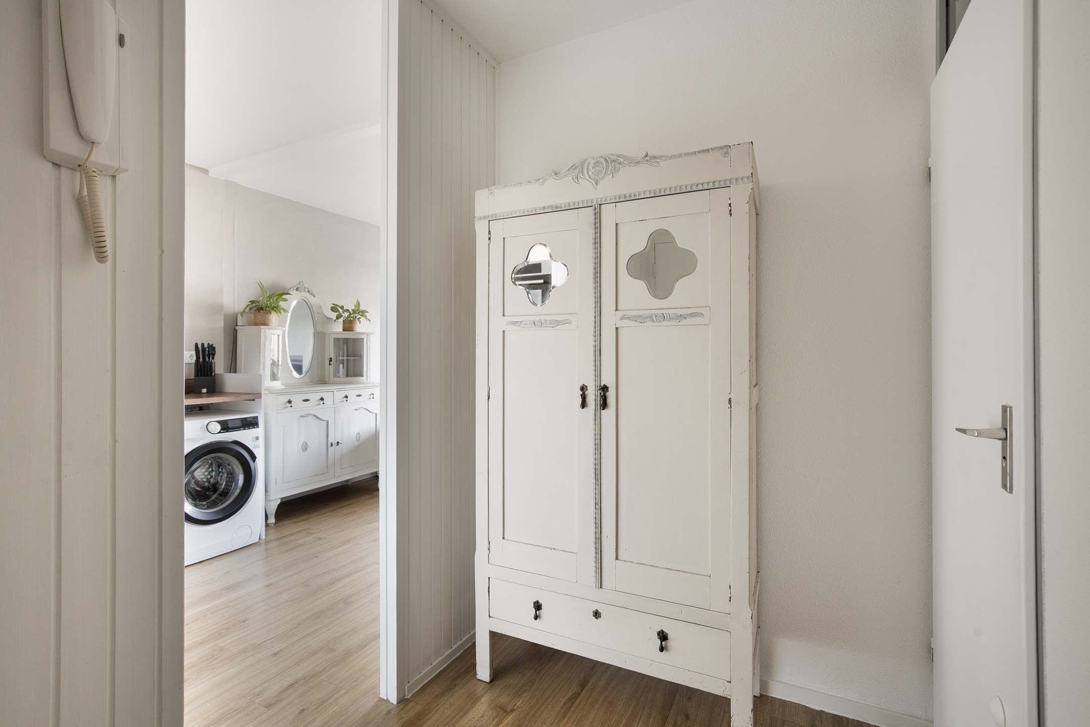 Via de ruime entree bereik je het appartement eenvoudig met de trap of lift. Binnen kom je in de hal, waar je toegang hebt tot de badkamer, het toilet en de meterkast. De badkamer is netjes ingericht met een douche en wastafelmeubel.