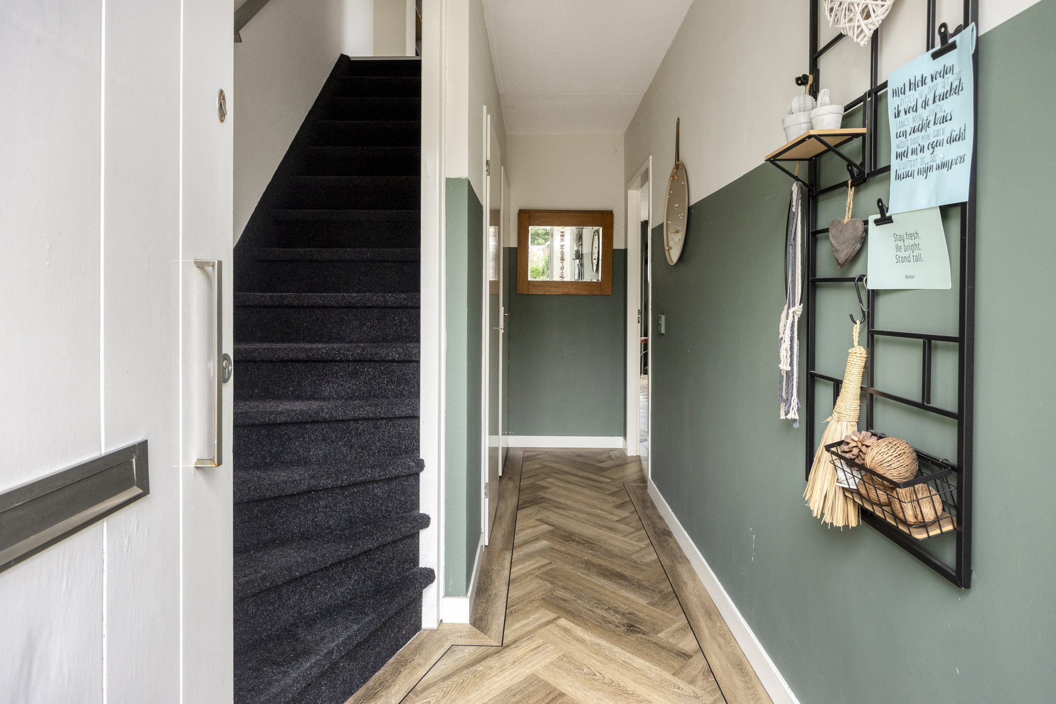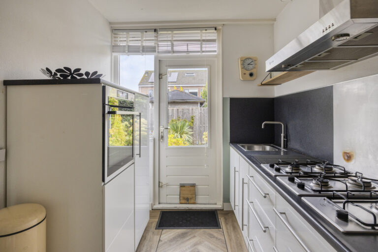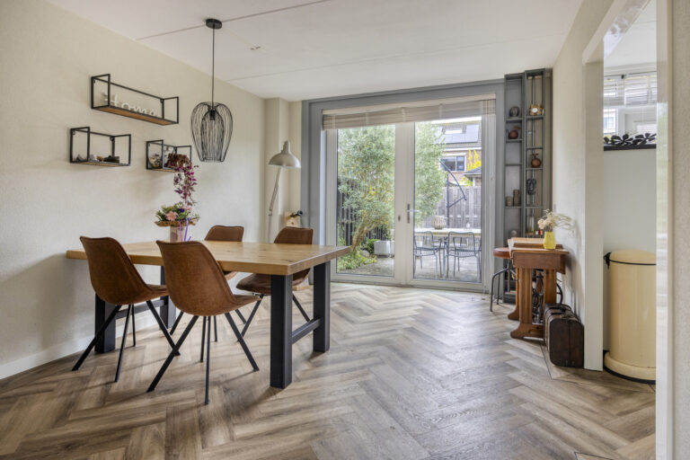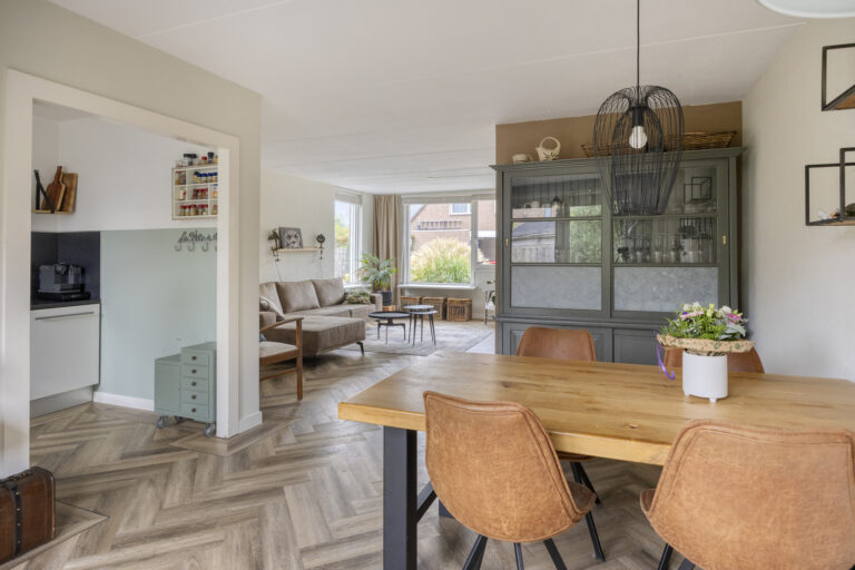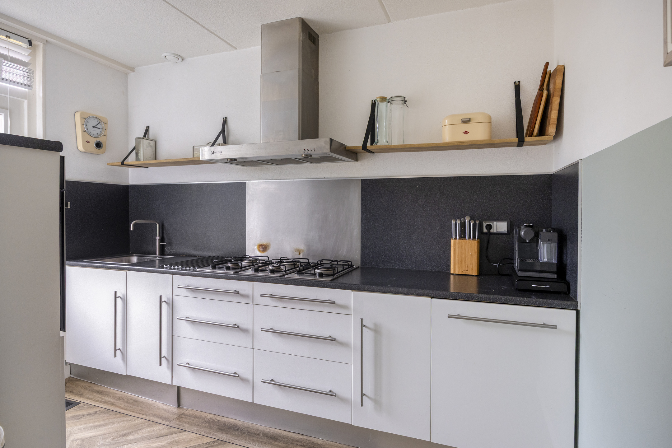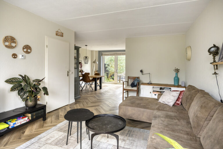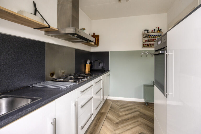 Via de entree bereik je de hal en de straatgerichte woonkamer. Hier geniet je optimaal van het vrije uitzicht en de lichtinval. De woonkamer is strak afgewerkt met een stijlvolle visgraatvloer en wordt verwarmd middels vloerverwarming. De keuken is ingericht met een gaskookplaat, afzuigkap, oven, vaatwasser en Quooker. Door het verwijderen van de muur is er ook de mogelijkheid om een open leefkeuken te realiseren.