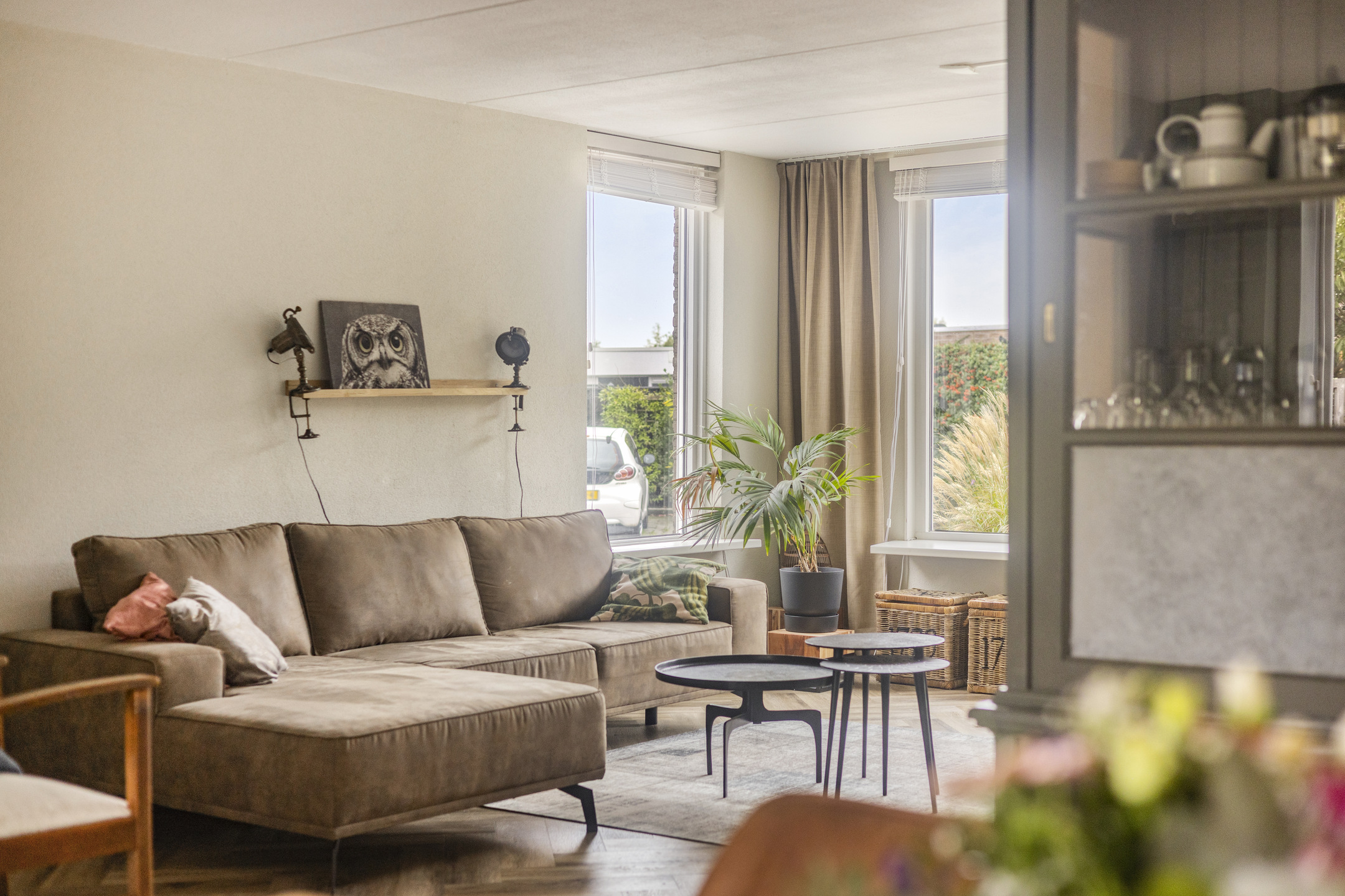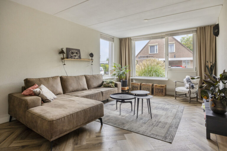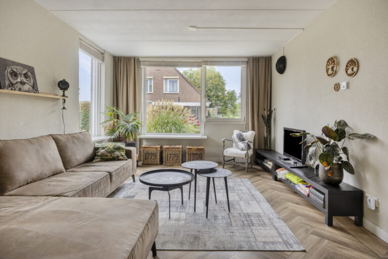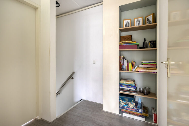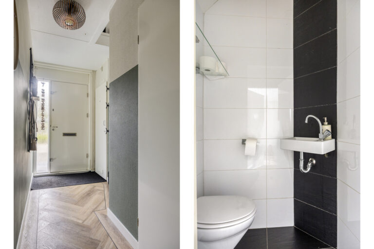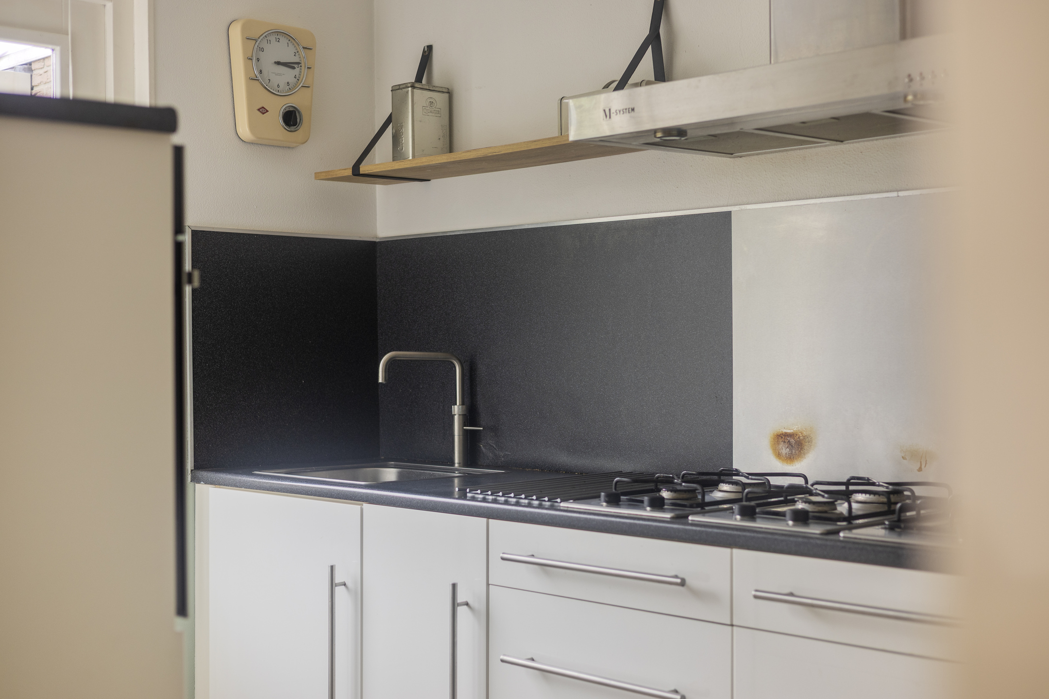 Via de entree bereik je de hal en de straatgerichte woonkamer. Hier geniet je optimaal van het vrije uitzicht en de lichtinval. De woonkamer is strak afgewerkt met een stijlvolle visgraatvloer en wordt verwarmd middels vloerverwarming. De keuken is ingericht met een gaskookplaat, afzuigkap, oven, vaatwasser en Quooker. Door het verwijderen van de muur is er ook de mogelijkheid om een open leefkeuken te realiseren.