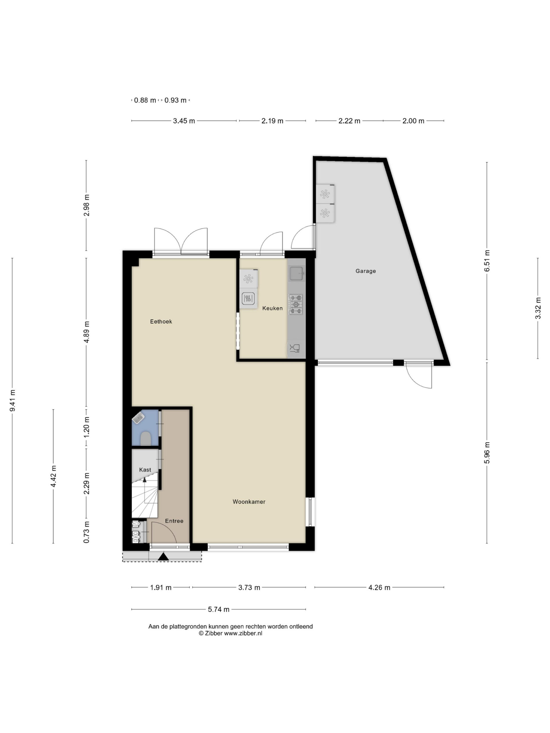 Entree, hal, toilet, woonkamer, eetkamer, keuken, garage.