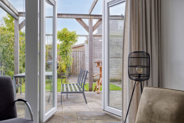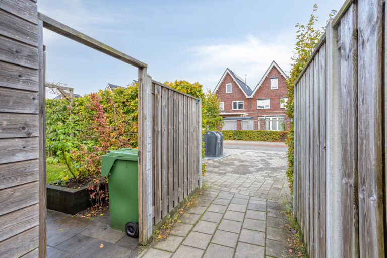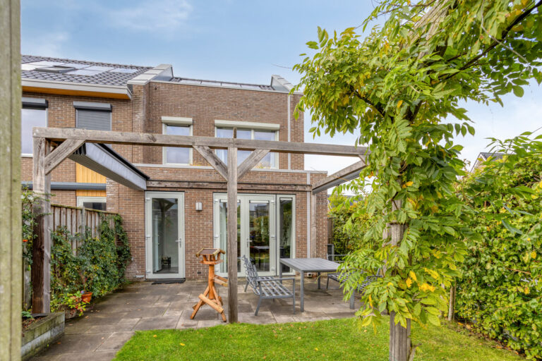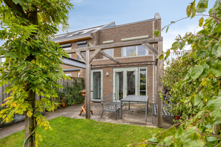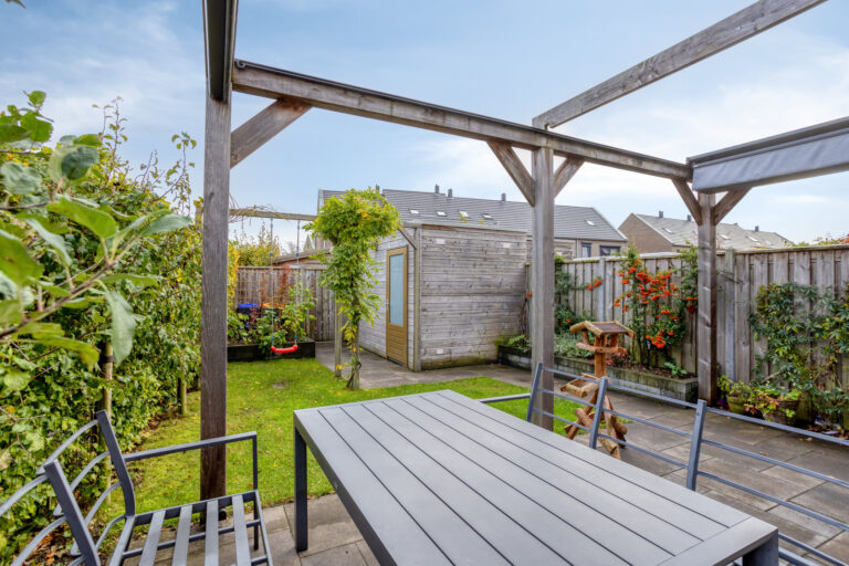 De tuin is gelegen op het zuidoosten. In de tuin kun je genieten van de ochtend en middagzon, of creëer gemakkelijk een plekje in de schaduw onder het doek van de veranda. Een heerlijk plekje! Door de ligging op de hoek profiteer je daarnaast van een extra stuk tuin aan de zijkant. Aan de achterzijde vind je de houten berging en achterom.