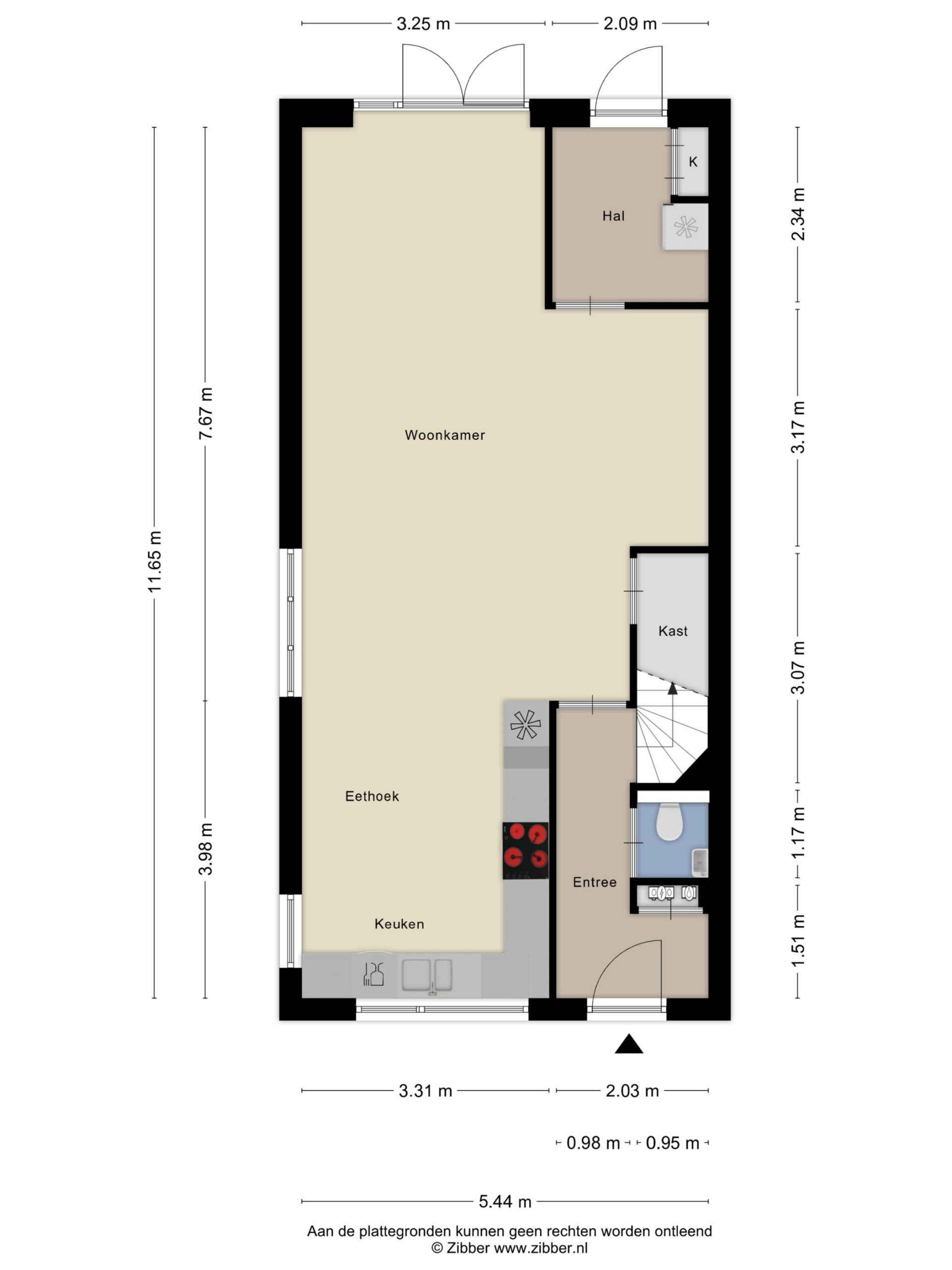 Entree, hal, toilet, keuken, eetkamer, woonkamer, bijkeuken/hal.