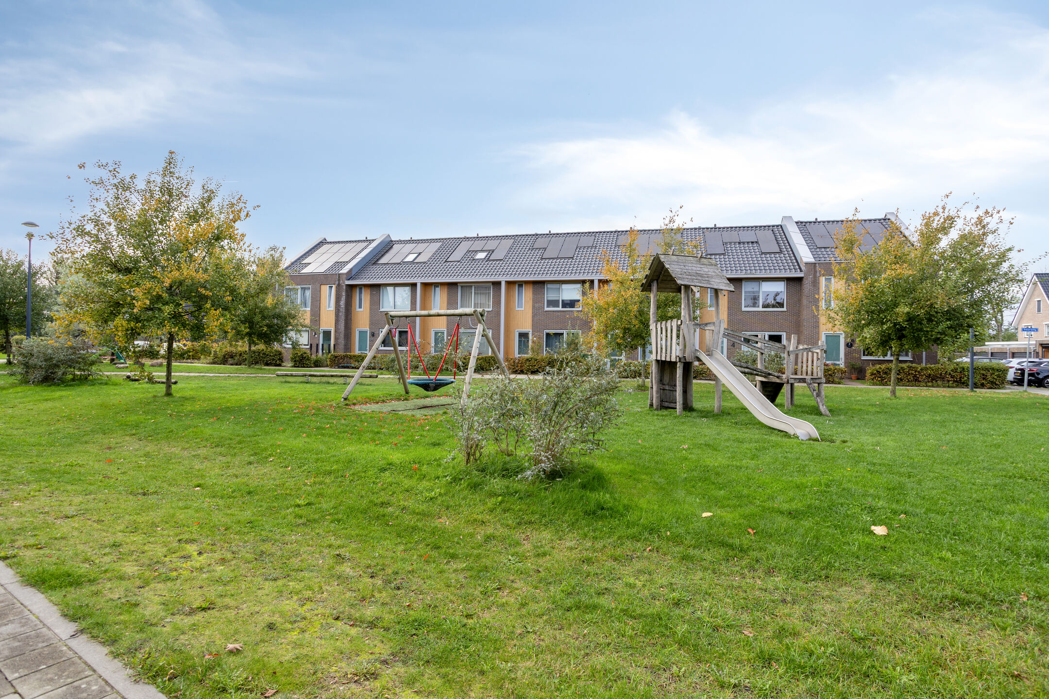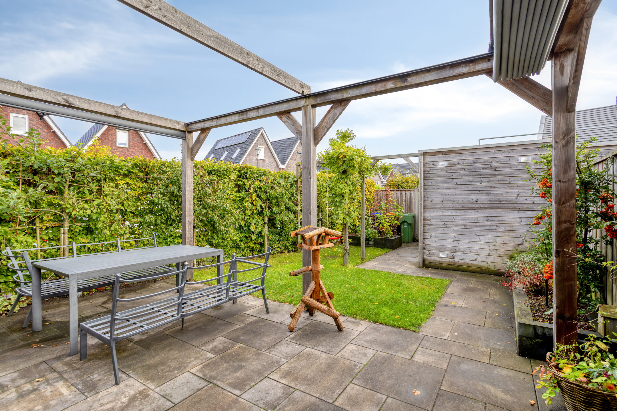 De tuin is gelegen op het zuidoosten. In de tuin kun je genieten van de ochtend en middagzon, of creëer gemakkelijk een plekje in de schaduw onder het doek van de veranda. Een heerlijk plekje! Door de ligging op de hoek profiteer je daarnaast van een extra stuk tuin aan de zijkant. Aan de achterzijde vind je de houten berging en achterom.