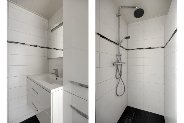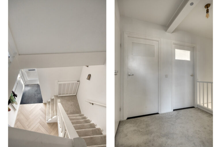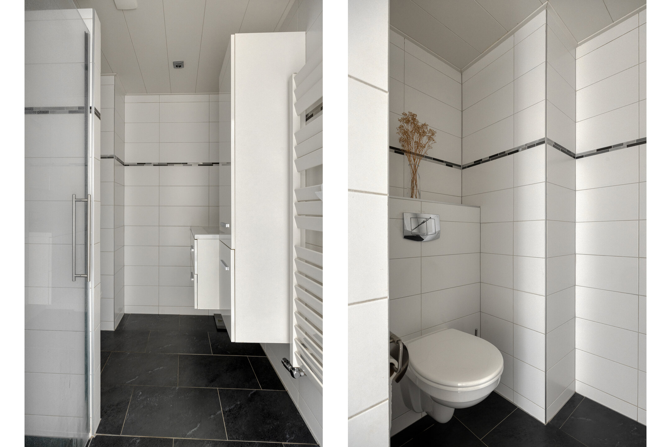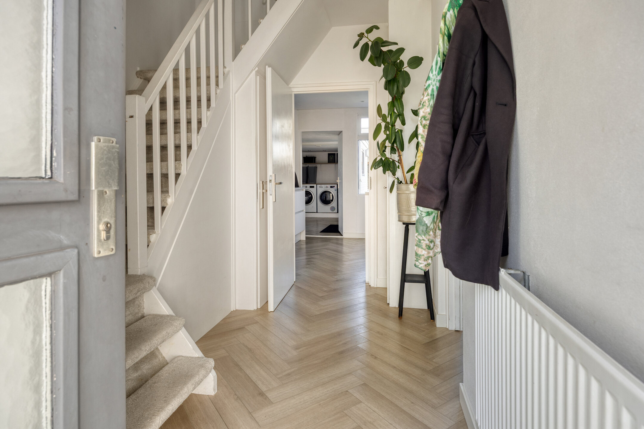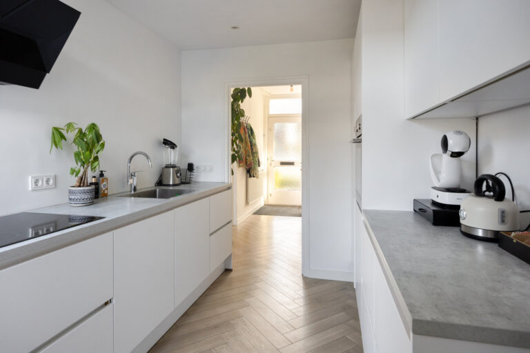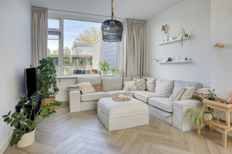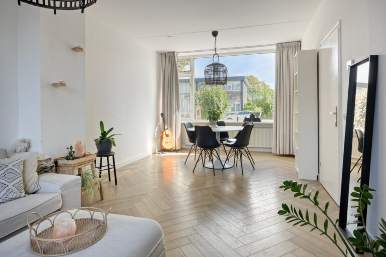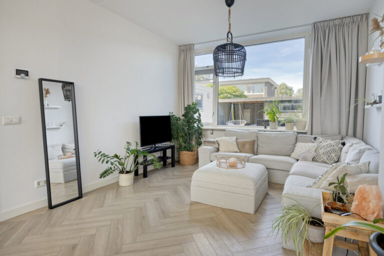 Via de entree bereik je de royale hal, waar ook het toilet zich bevindt. Aan de rechterzijde bereik je de ruime én lekker lichte woonkamer. Deze ruimte is prachtig afgewerkt met strak gestucte wanden en een visgraatvloer.