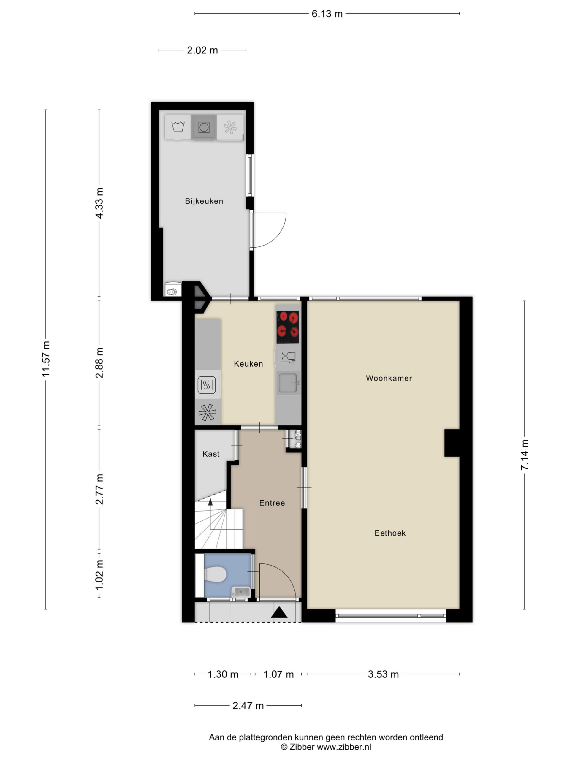 Entree, hal, toilet, woonkamer, eetkamer, keuken, bijkeuken.