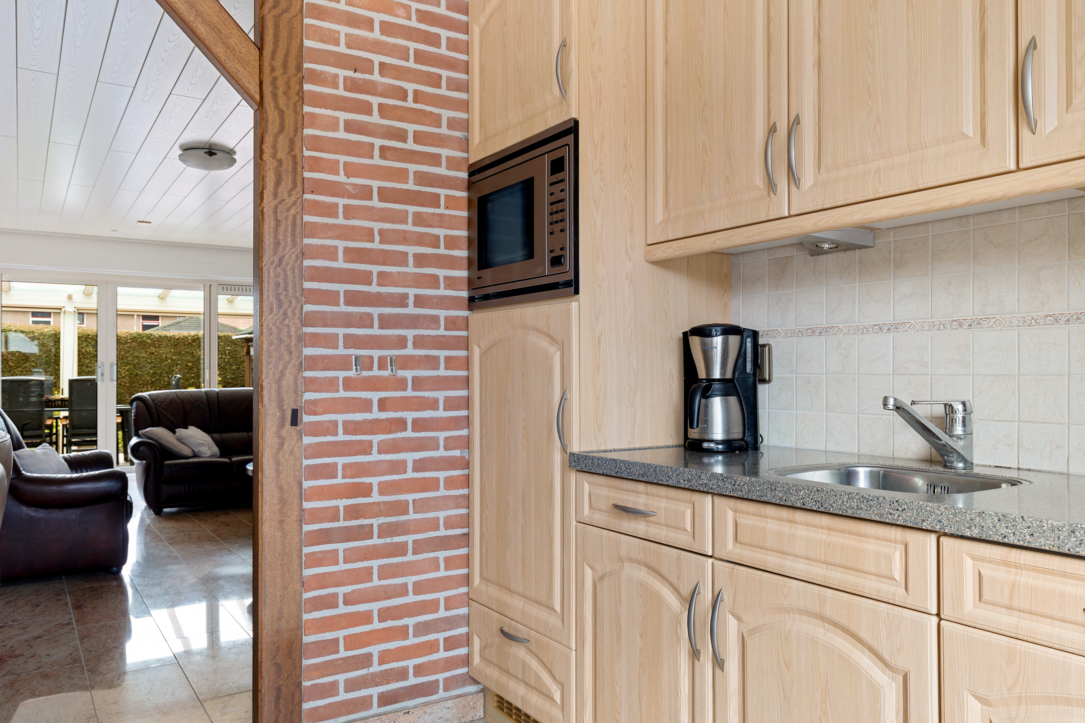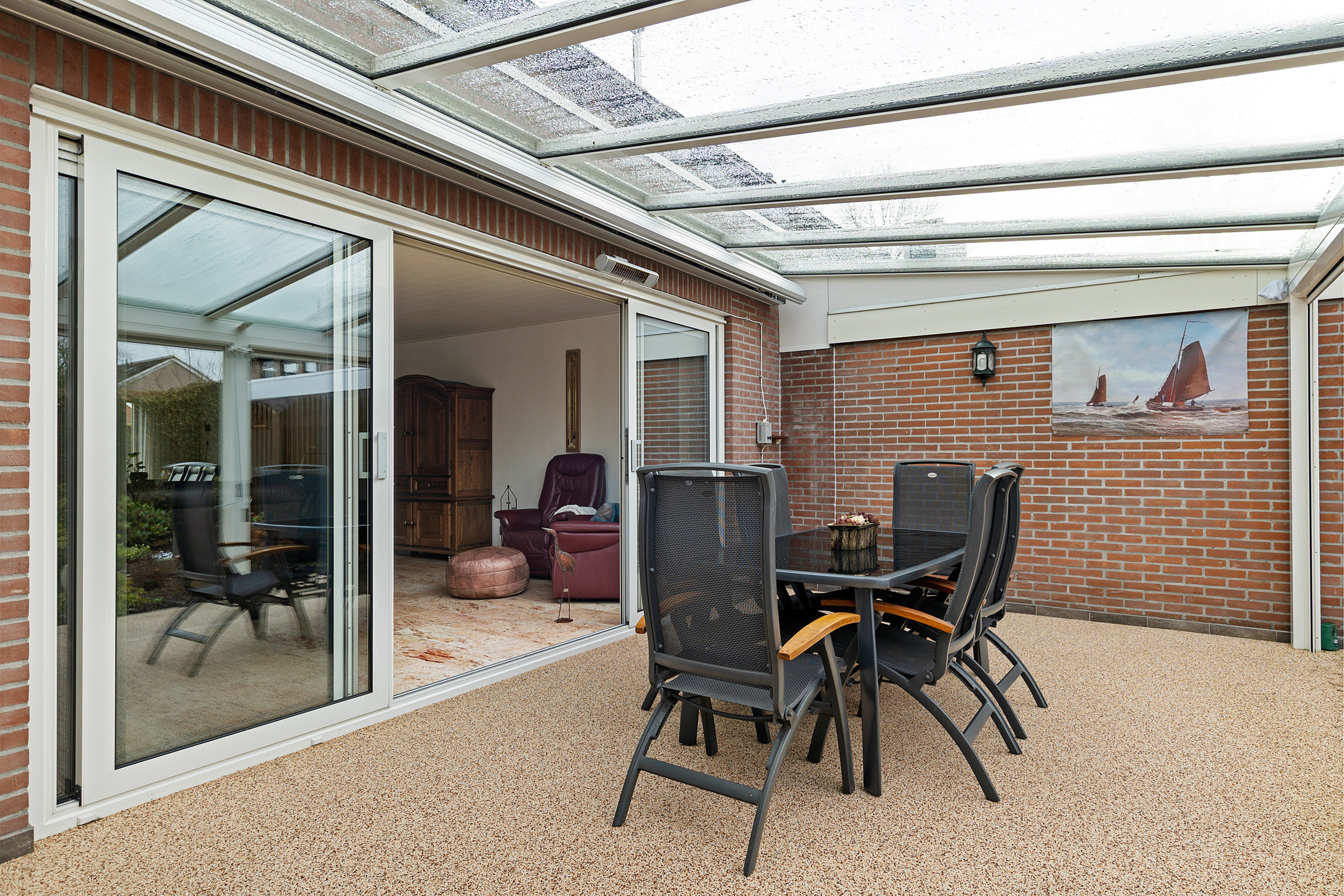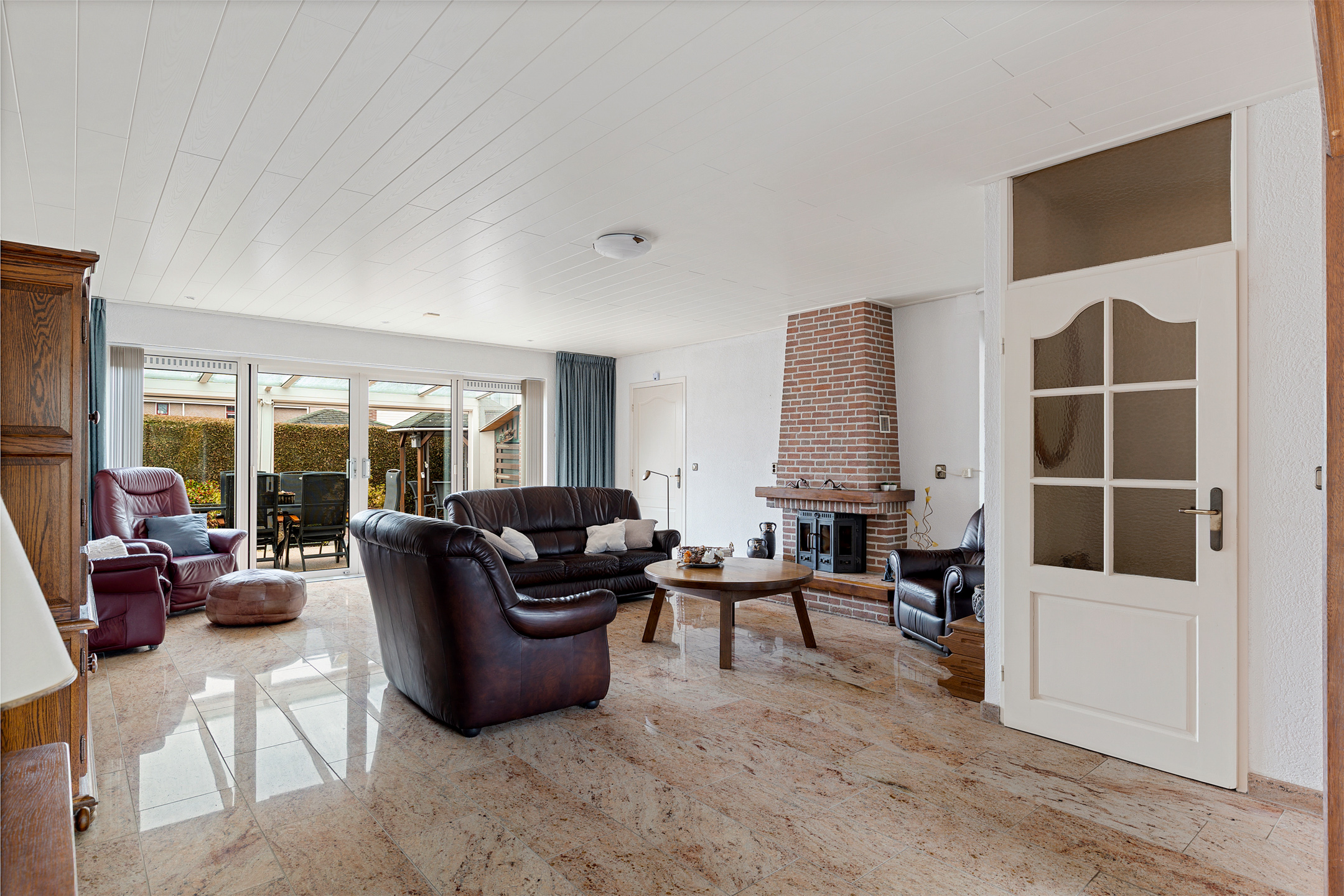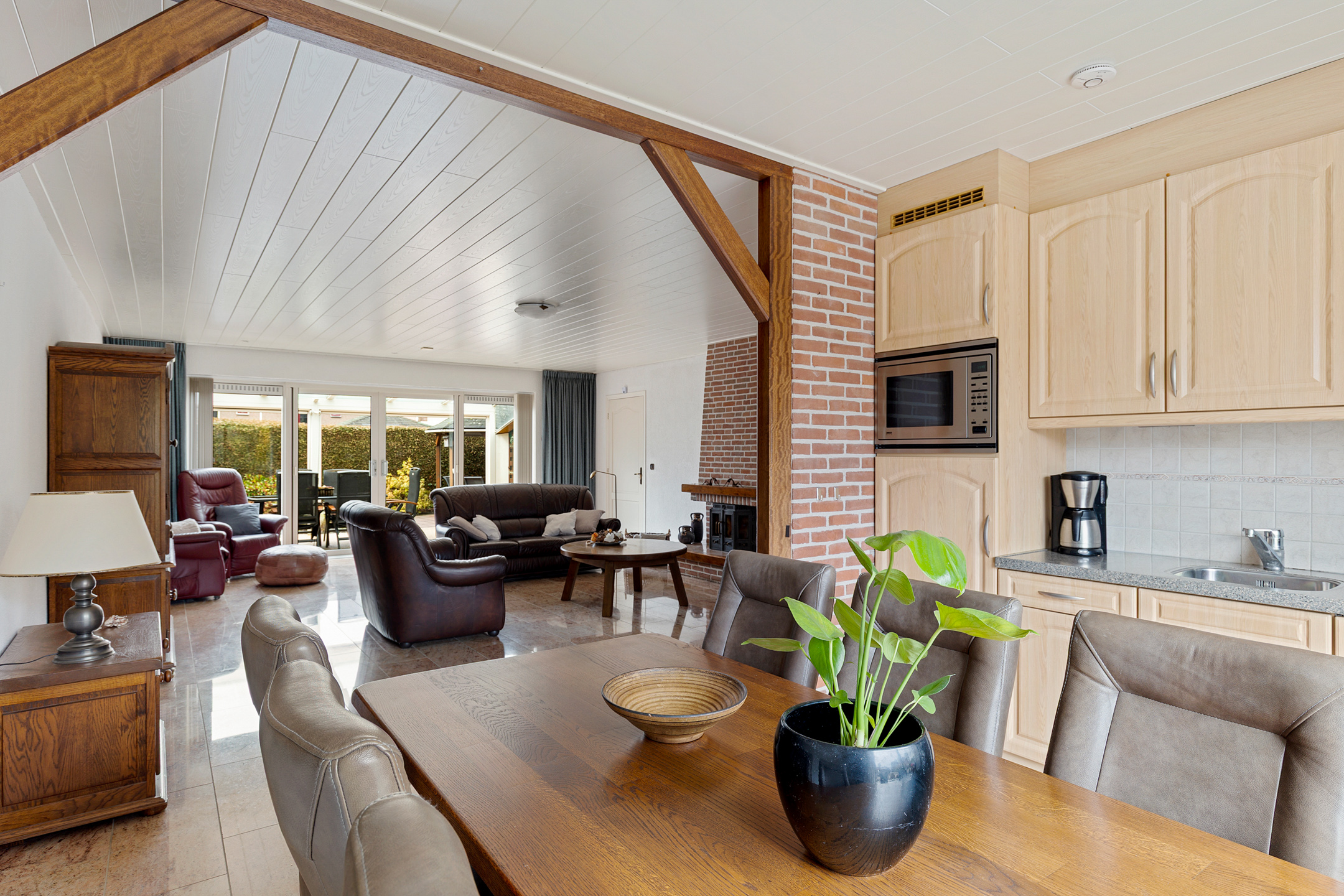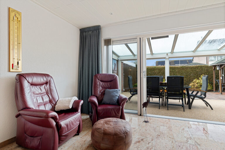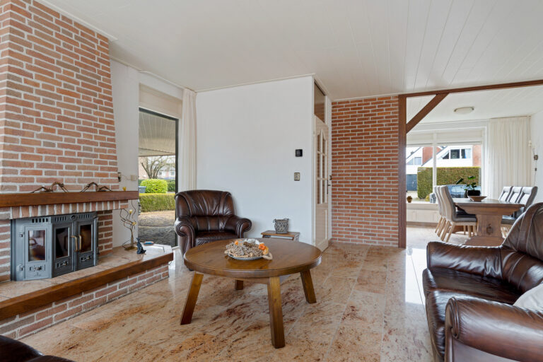 Via de entree met trapopgang, trapkast, toilet en meterkast kom je in de woonkamer. Deze bevindt zich aan de achterzijde van de woning en staat in directe verbinding met de overkapping via de schuifpui. Op mooie dagen zet je de pui open en loopt binnen moeiteloos over in buiten. Een heerlijke plek om te zitten, van het vroege voorjaar tot het late najaar.