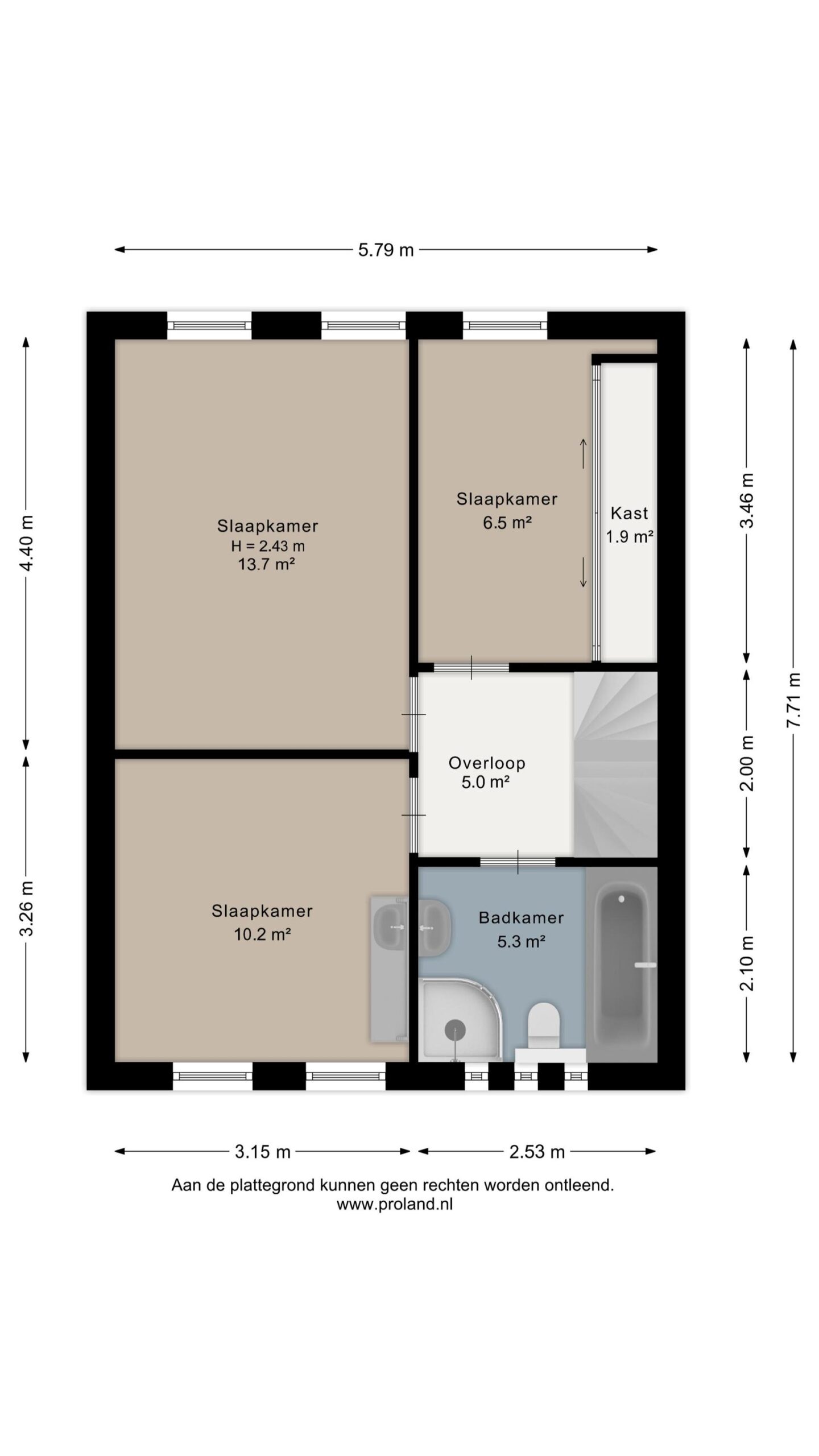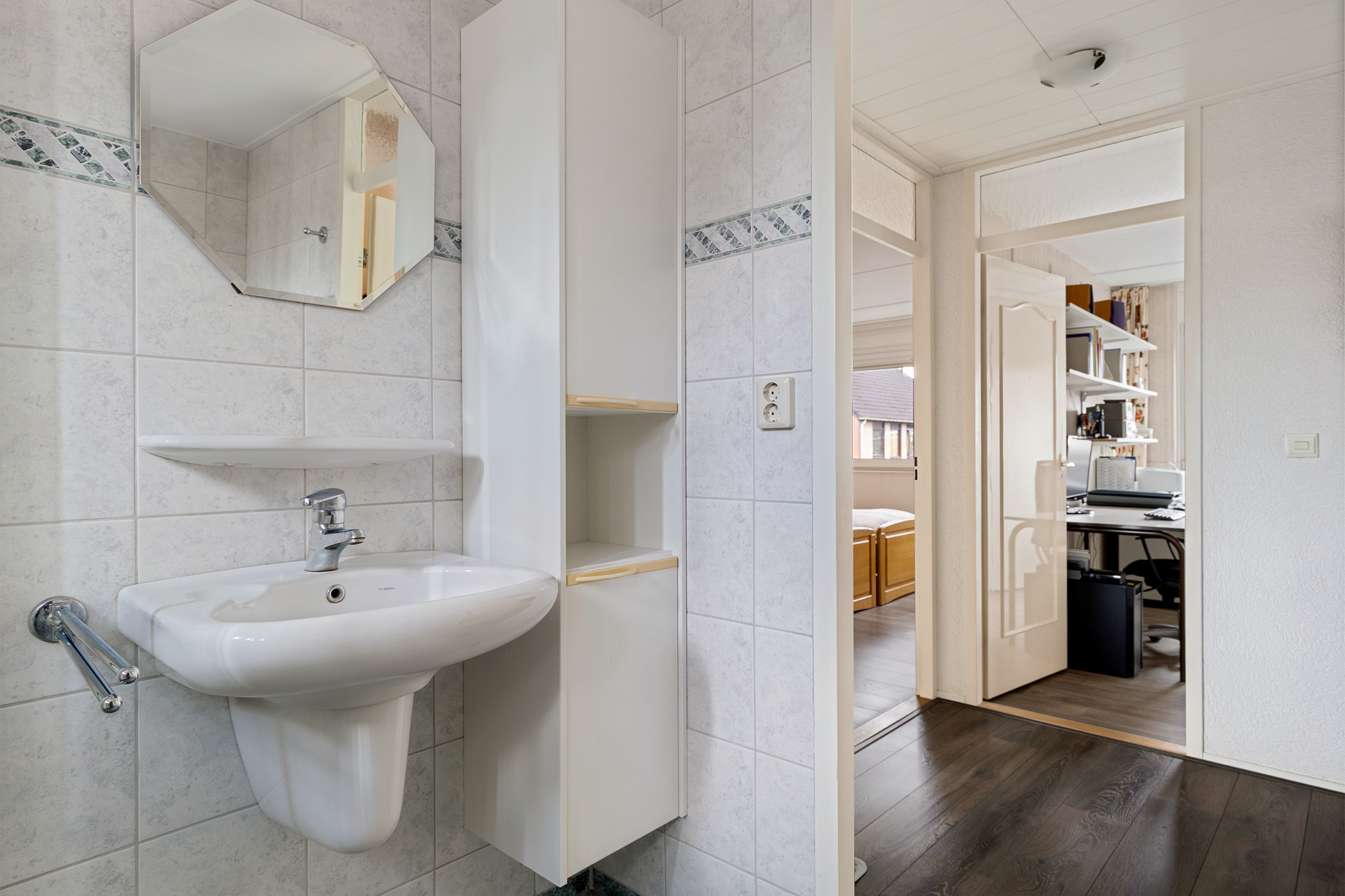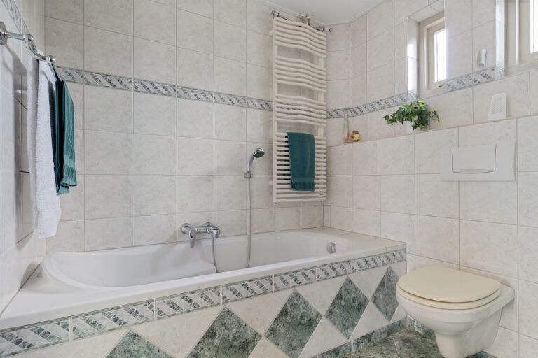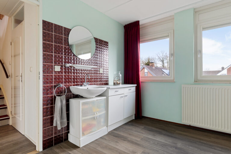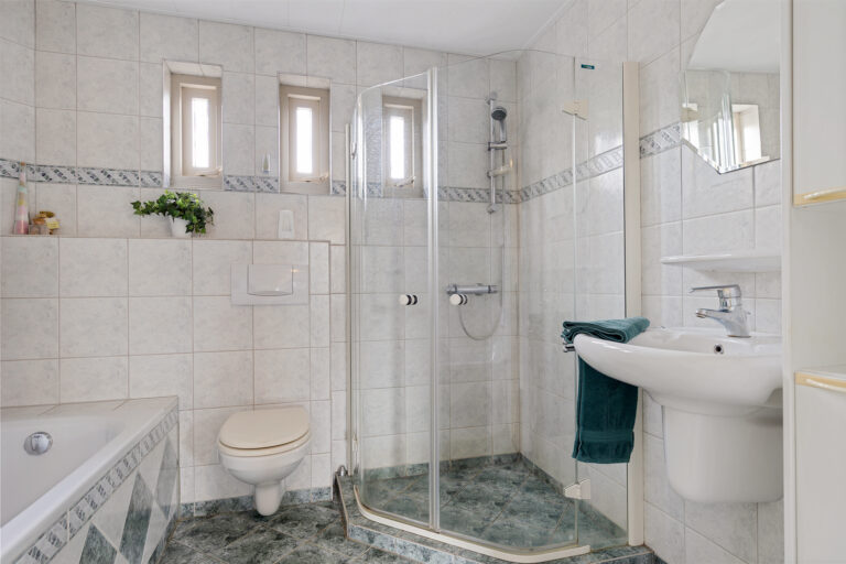 Vanaf de overloop zijn drie slaapkamers en de badkamer bereikbaar. De grootste slaapkamer bevindt zich aan de achterzijde van de woning. Eén van de slaapkamers beschikt over een vaste kast. De badkamer is compleet ingericht met een douche, wastafel, toilet en ligbad. Daarnaast is er vloerverwarming aanwezig.