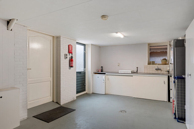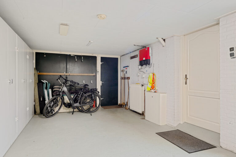 Vanuit de woonkamer bereik je tevens de garage, die ook dienstdoet als bijkeuken. Met circa 25 m² is dit een royale ruimte waar je alle kanten mee op kunt. Hier vind je onder andere de omvormer van de 21 zonnepanelen. Praktisch voor opslag, hobbyruimte of gewoon als fijne werkplek aan huis.
